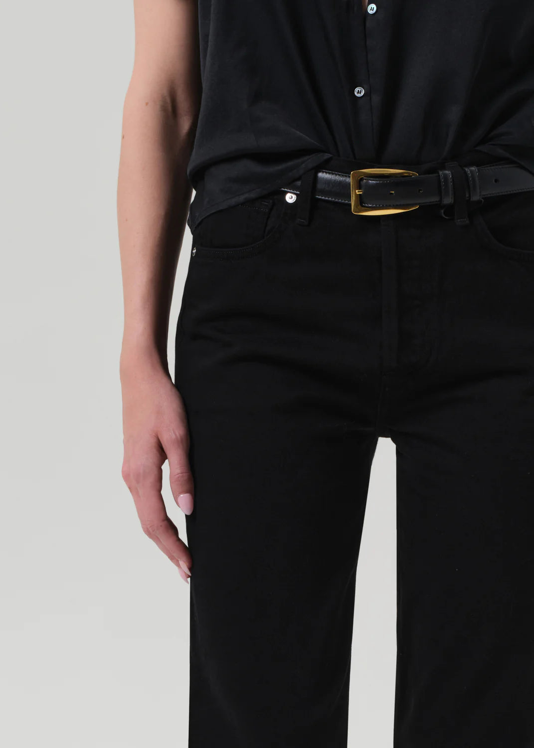 The ‘Blaine’ is a high-rise, vintage-inspired straight leg with a clean, ankle-length inseam. The ‘Solid Black’ wash is a true, saturated black with no distressing—offering a crisp, versatile base for everyday wear. Crafted from rigid regenerative cotton with a soft hand, it’s a timeless staple that pairs effortlessly with everything from oversized shirting to slim knits.
