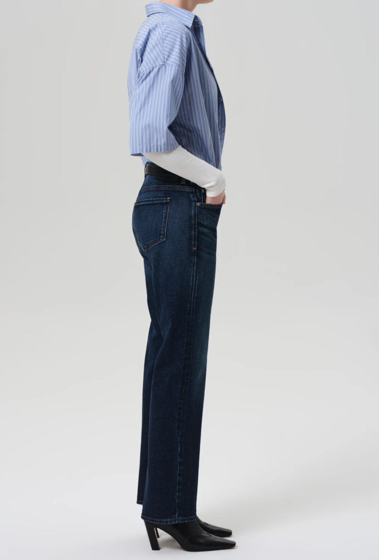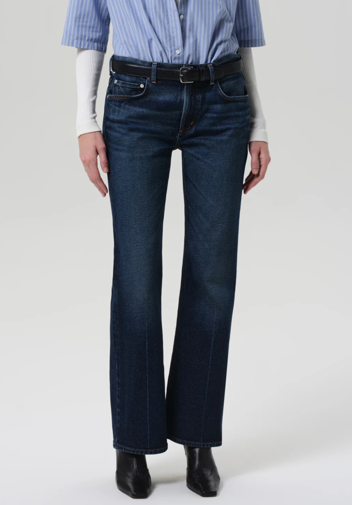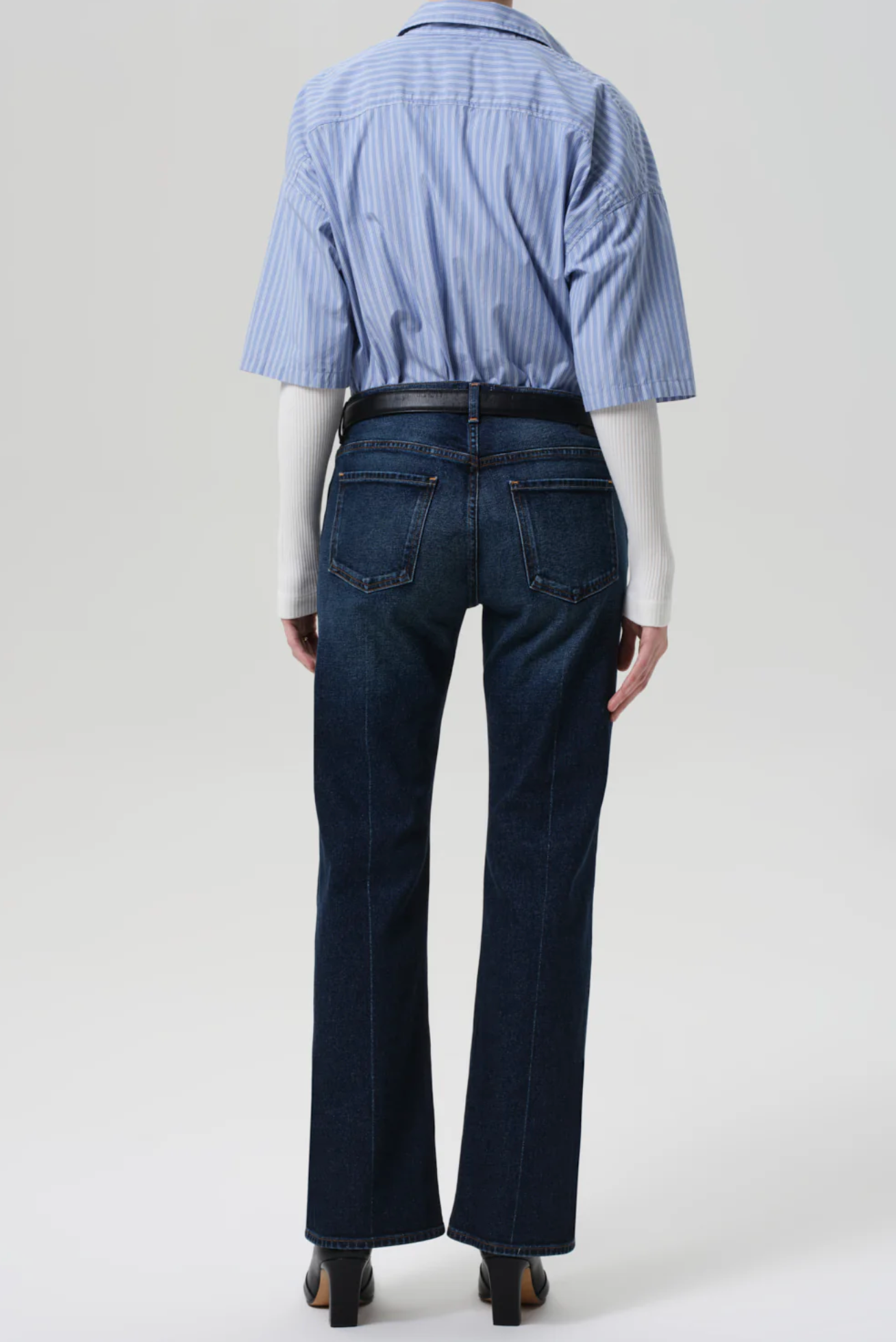 The Genova is a low-rise bootcut silhouette designed to elongate and flatter. Crafted from Japanese comfort stretch denim with a soft, broken-in hand, it offers structure with subtle flexibility. The Sutherland wash—a deep, dark indigo with soft fading and marbling. The full-length leg pairs with any kind of shoe— boots, sneakers, heels.