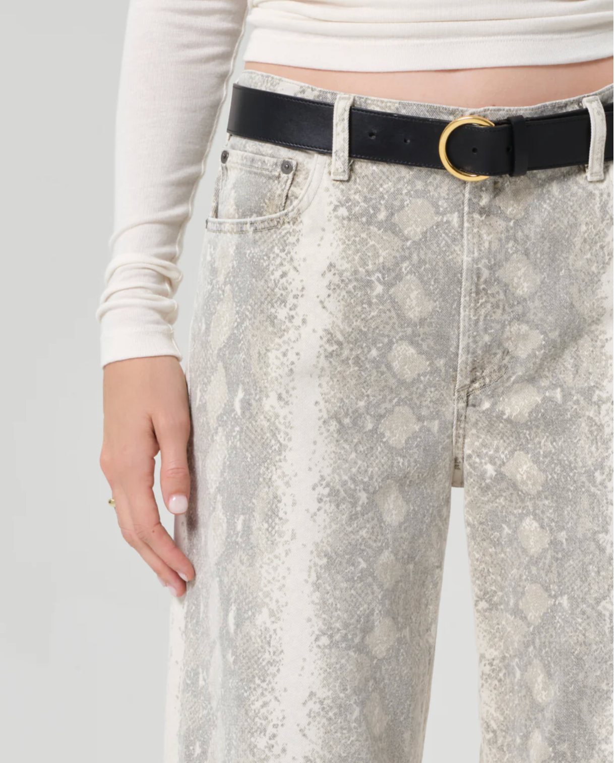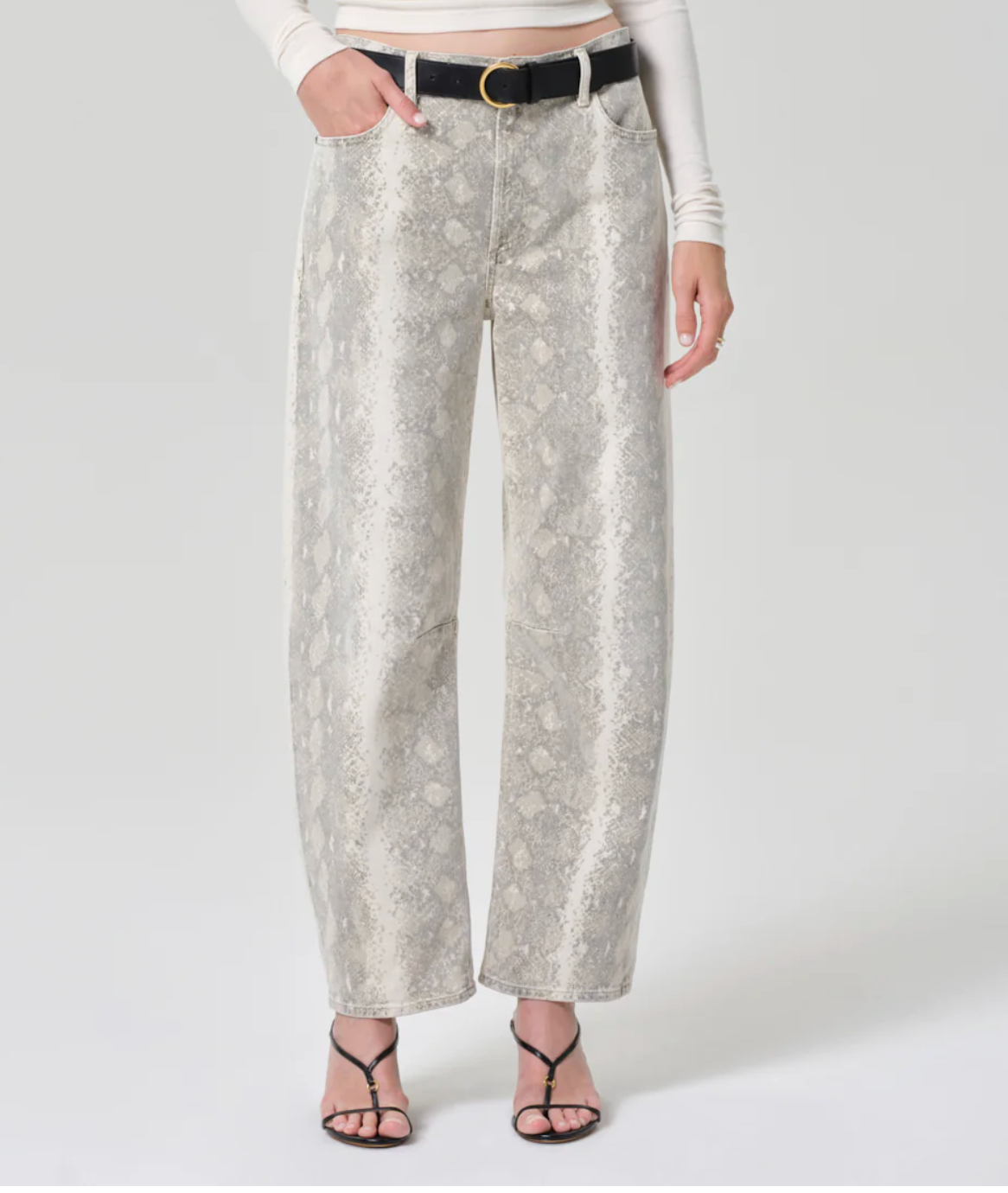 The Miro Long offers a modern, relaxed take on the tapered silhouette with a subtle barrel leg and elongated lines. Crafted from rigid, non-stretch denim with an authentic hand, this version features a white and grey python print that adds a bold, refined edge. A statement piece that balances structure, texture, and effortless wearability.