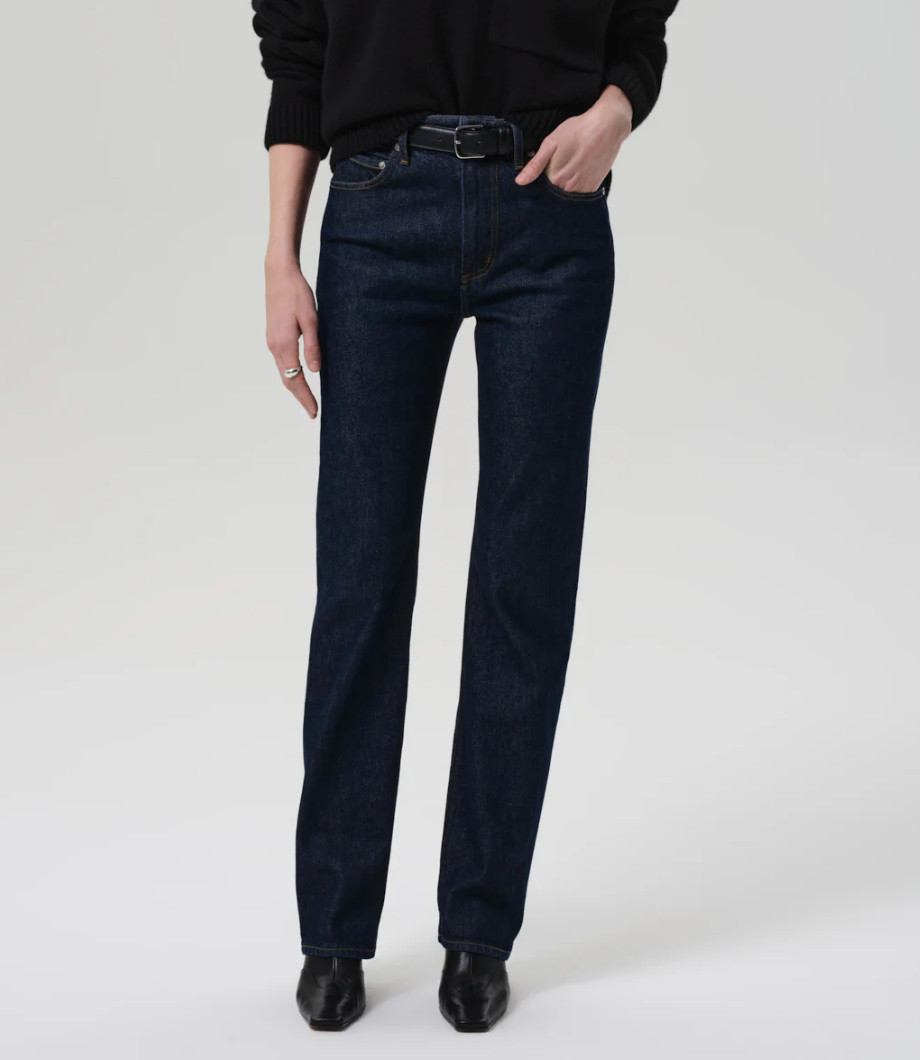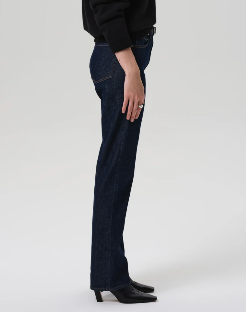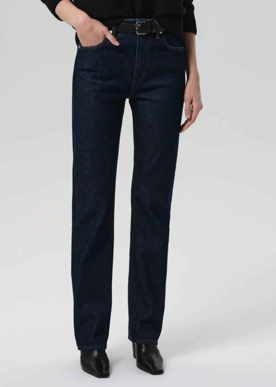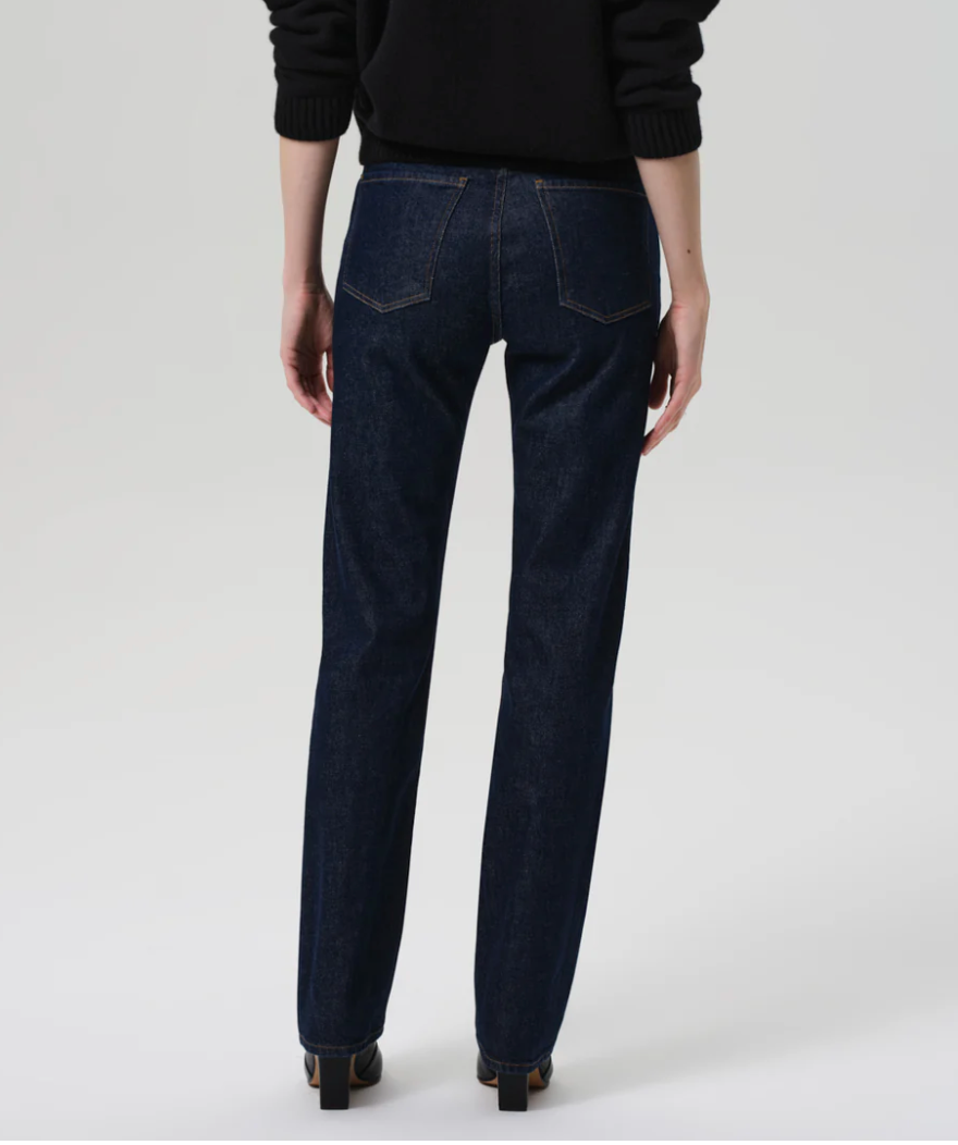 Designed with a high rise and a clean straight leg, the Zurie offers a modern, elongating silhouette. Crafted from soft, comfort stretch regenerative denim, it blends structure with ease for all-day wear. The dark indigo wash keeps the look refined.