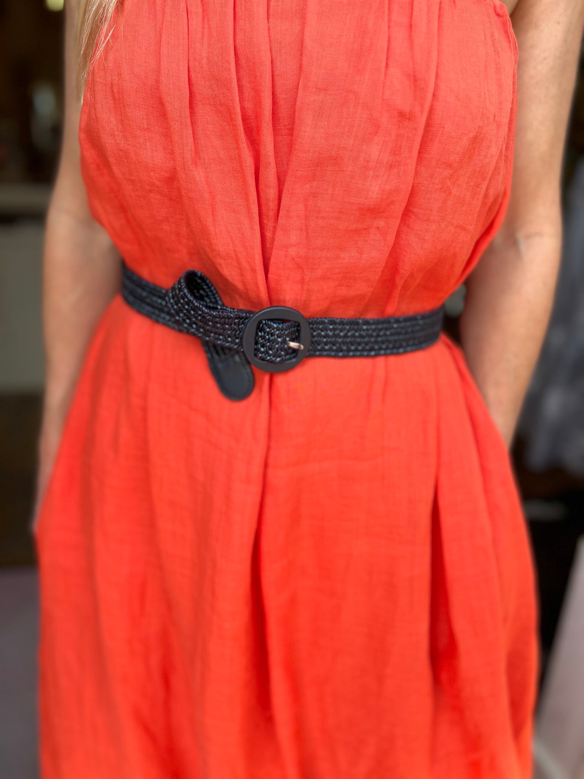Fabric woven belt with resin buckle and leather tab end. Belt can we worn at different lengths since there are no holes.