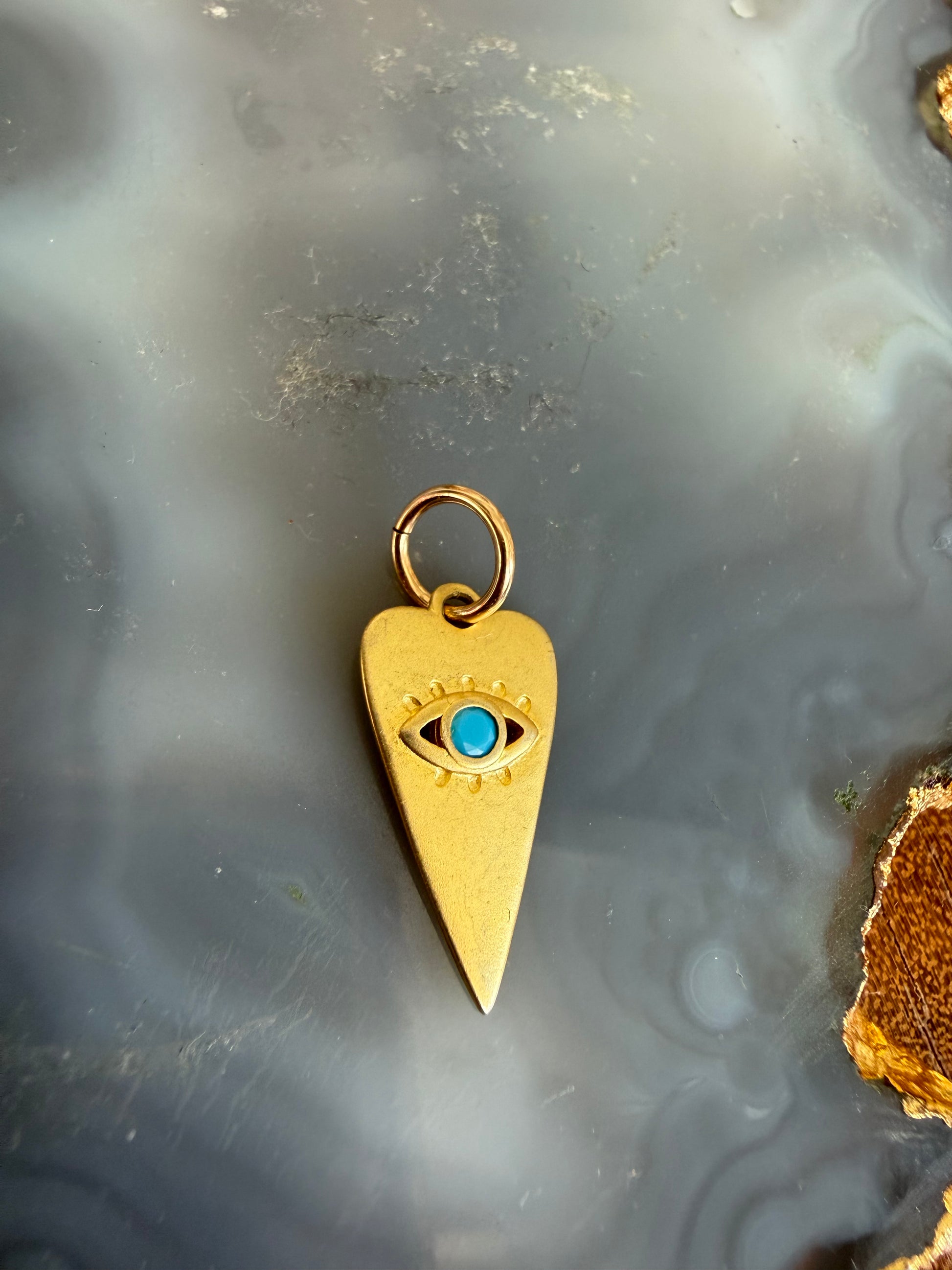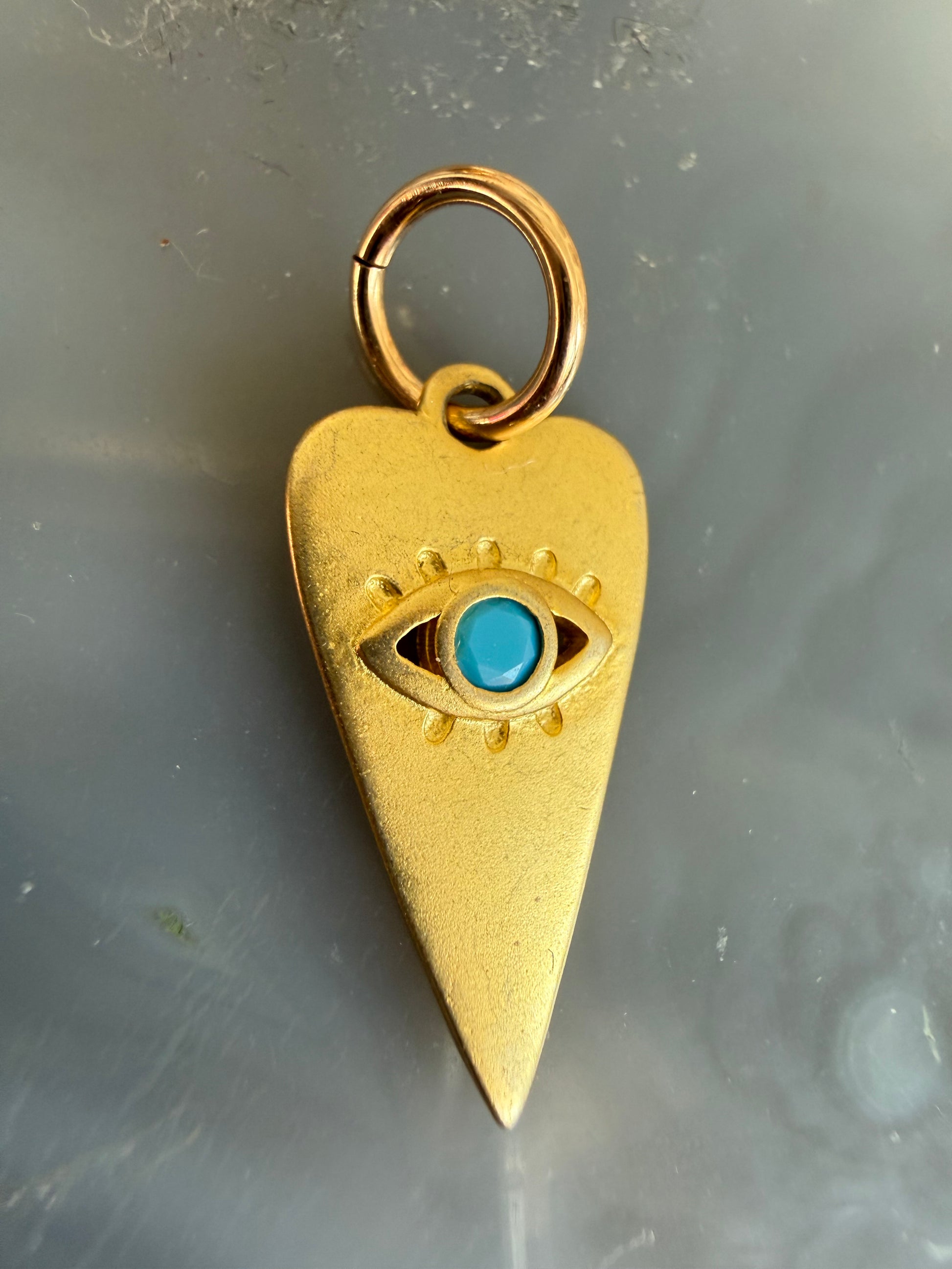 14K gold filled charm in the shape of a heart filled with turquoise evil eye.