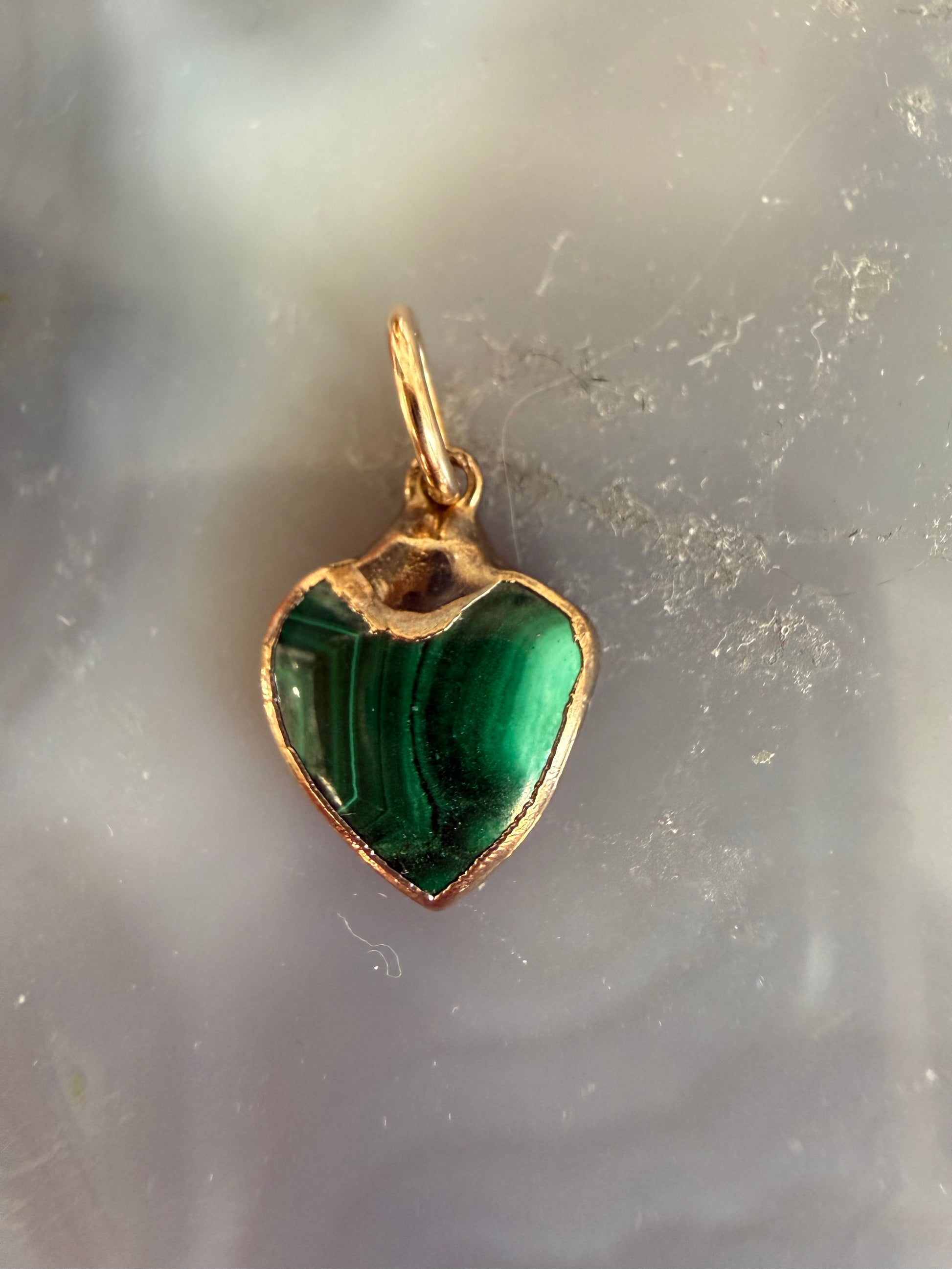 14K gold filled and malachite charm in a puffy heart shape.