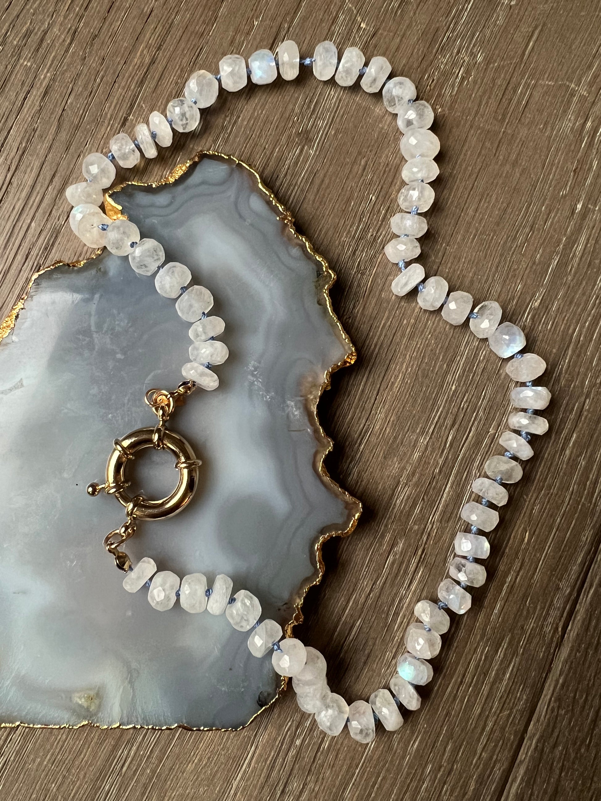 Moonstone beads on blue thread necklace with lifesaver clasp, 17".