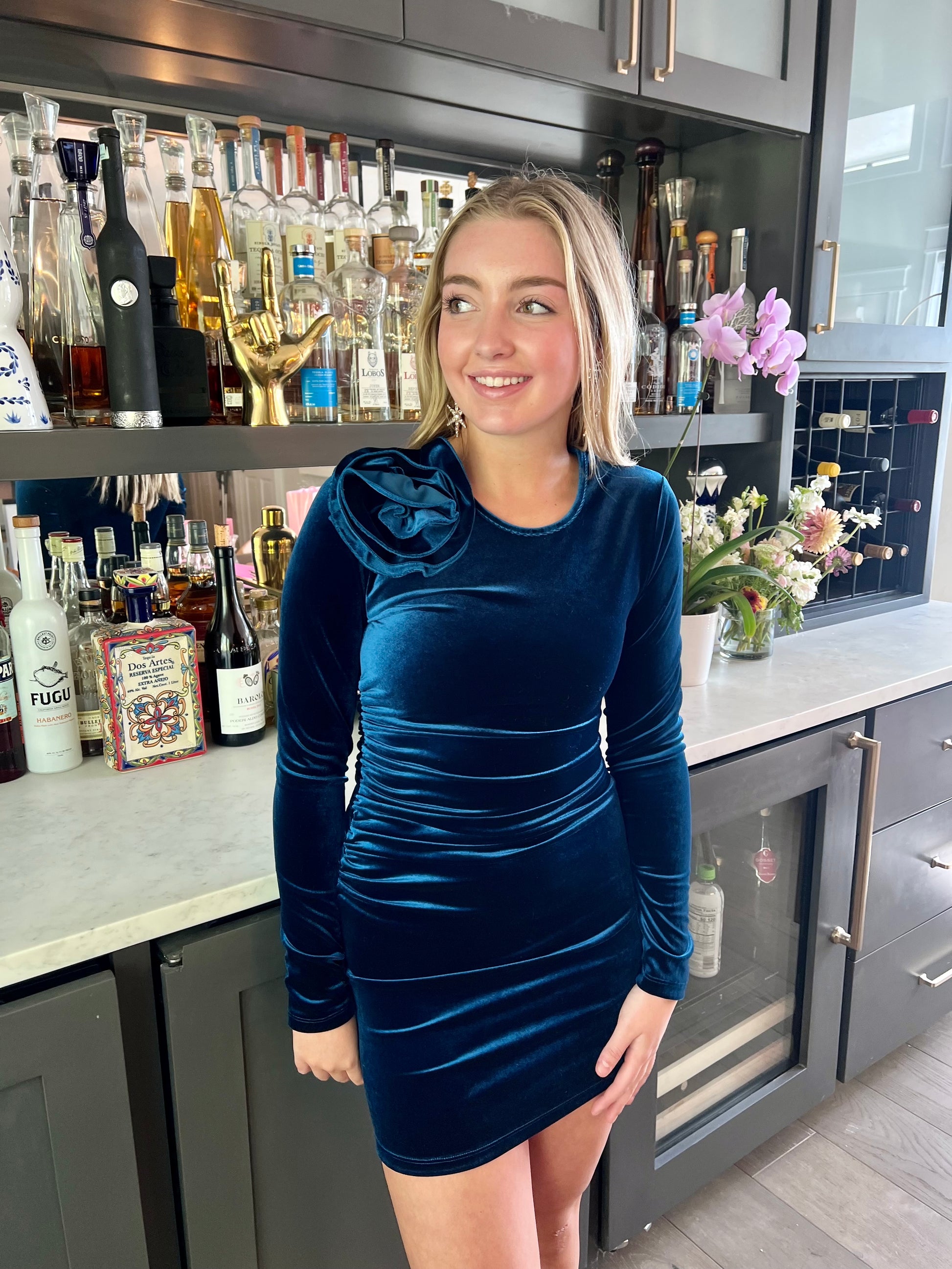 Velvet long sleeve dress with flower accent on the chest and ruched torso.