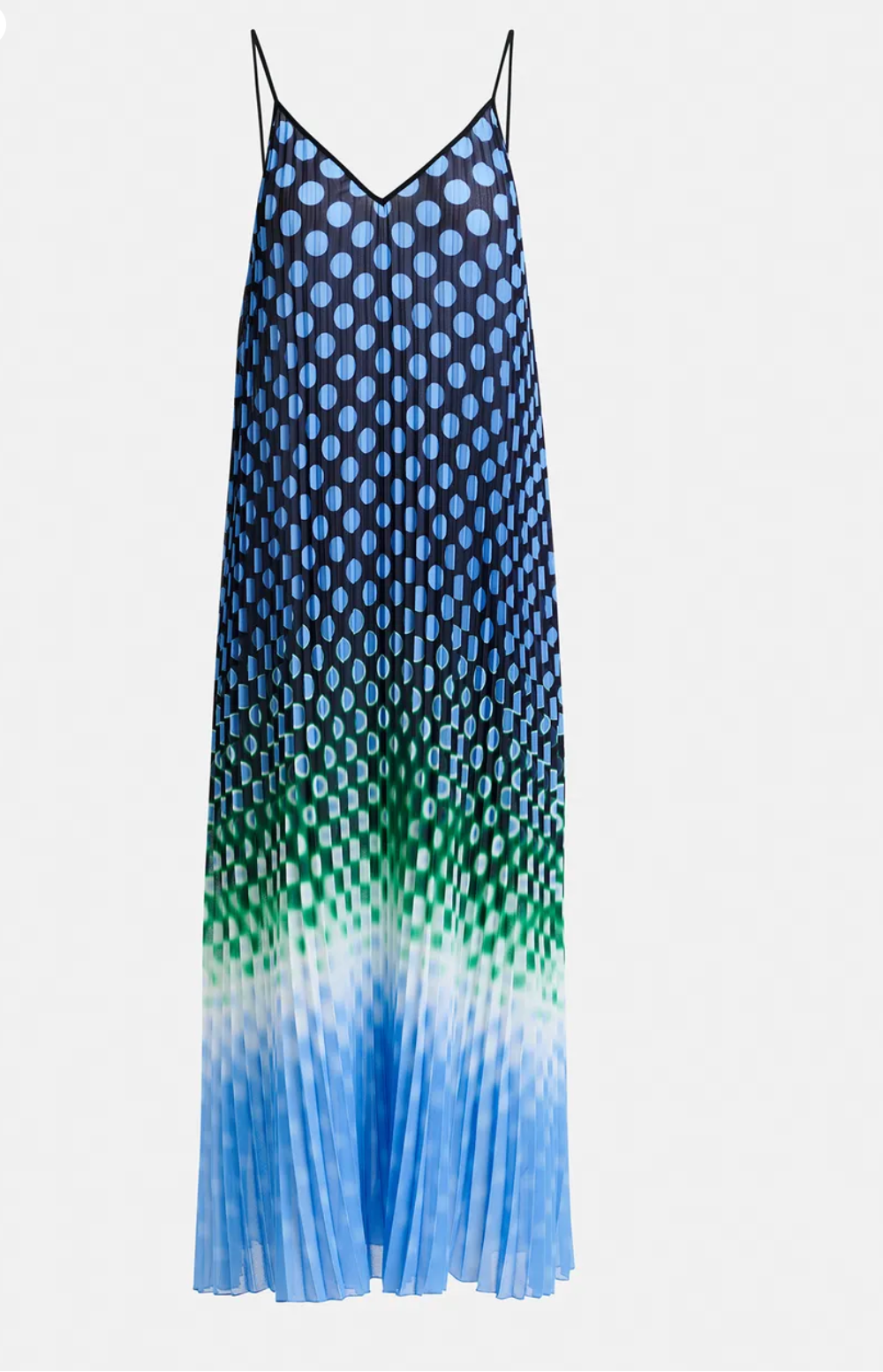 Crafted from lightweight recycled polyester, this midi-length dress features a polka dot print with a subtle tie-dye effect. The design is pleated to create movement with every step. Easily adjust the thin shoulder straps to find your perfect fit.