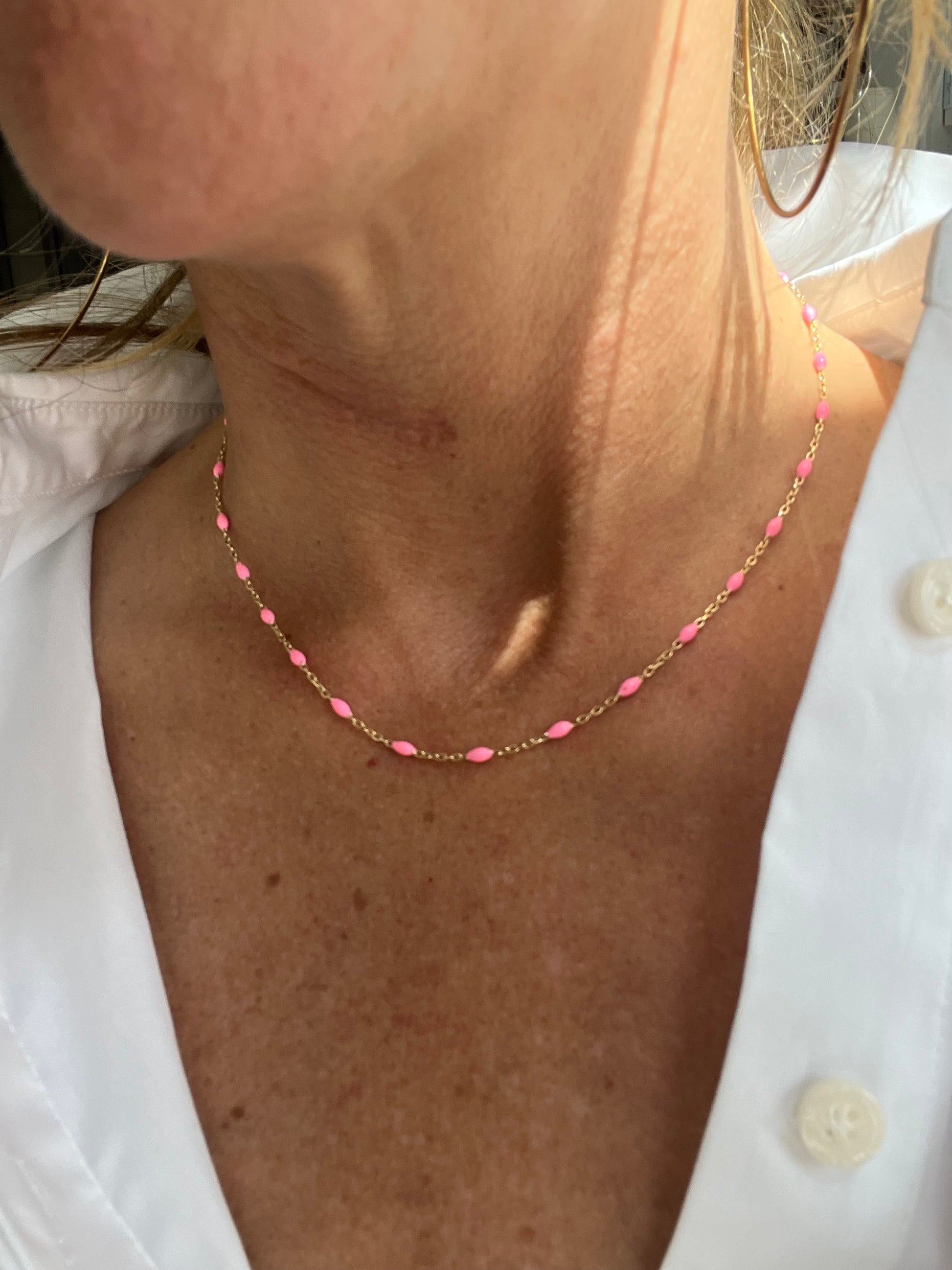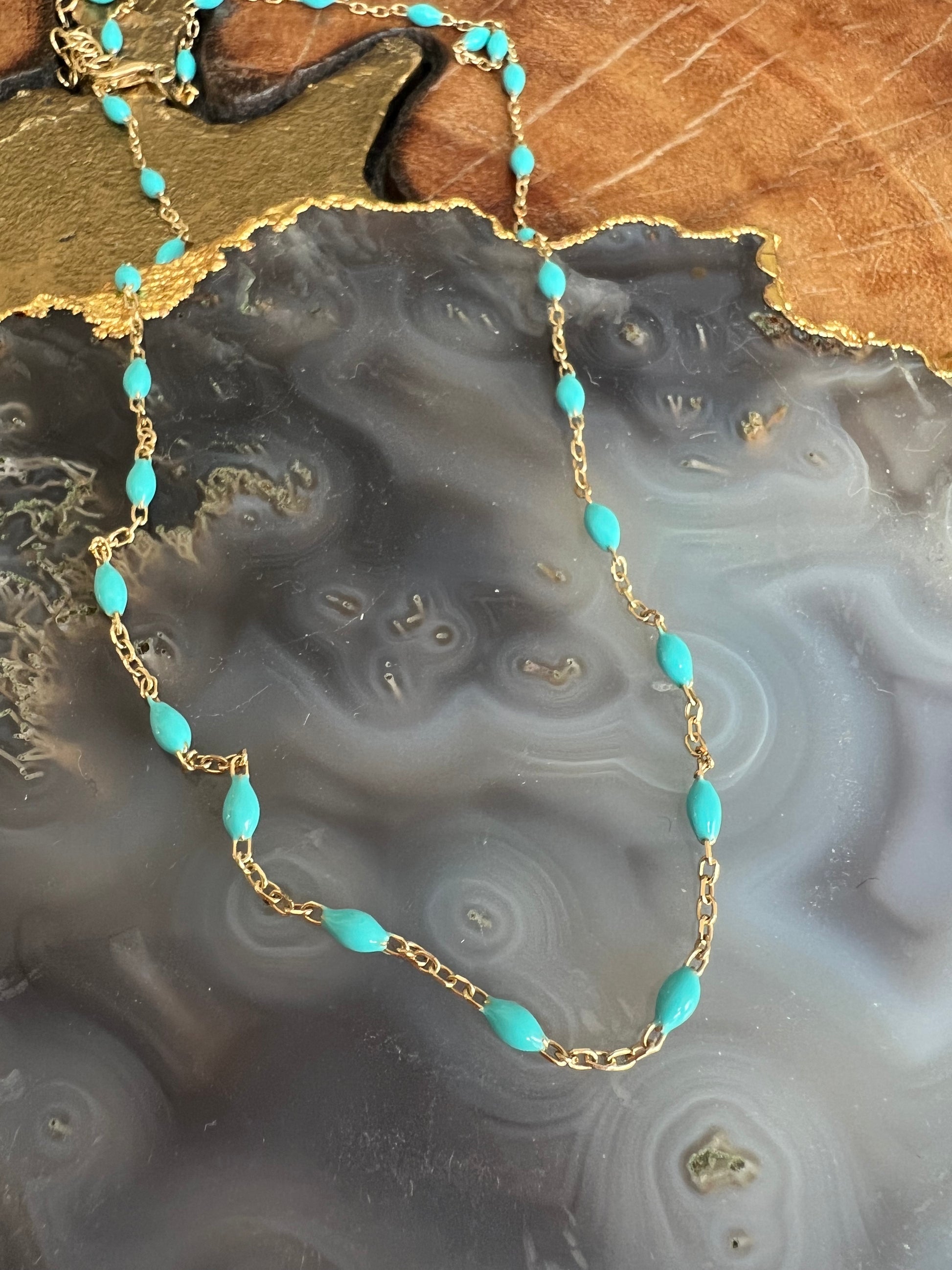 14K yellow gold chain necklace with colored enamel seeds.