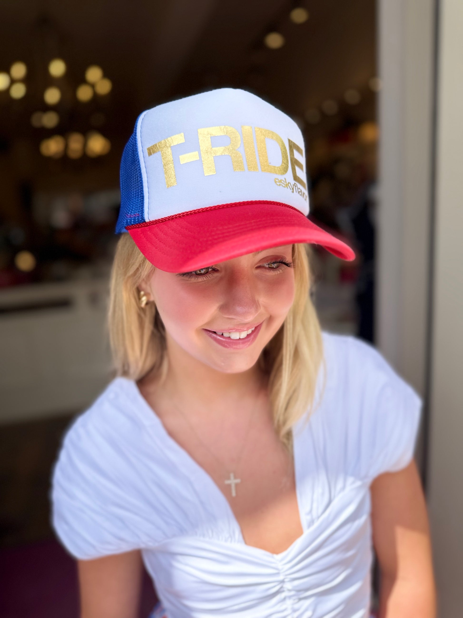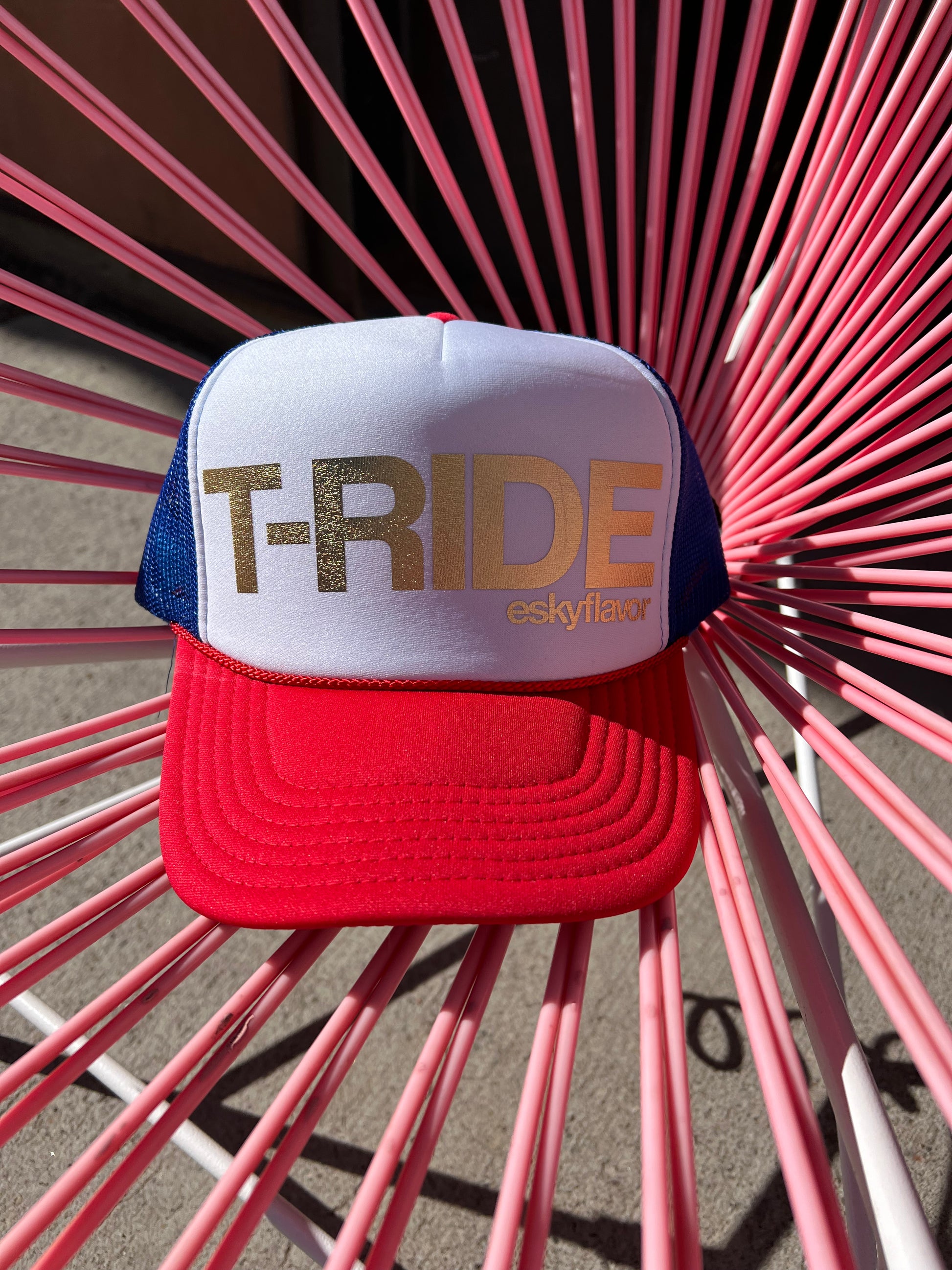 Esky July 4th T-RIDE hats in red, white and blue with silver and gold foil. Custom made in Maui for Two Skirts.