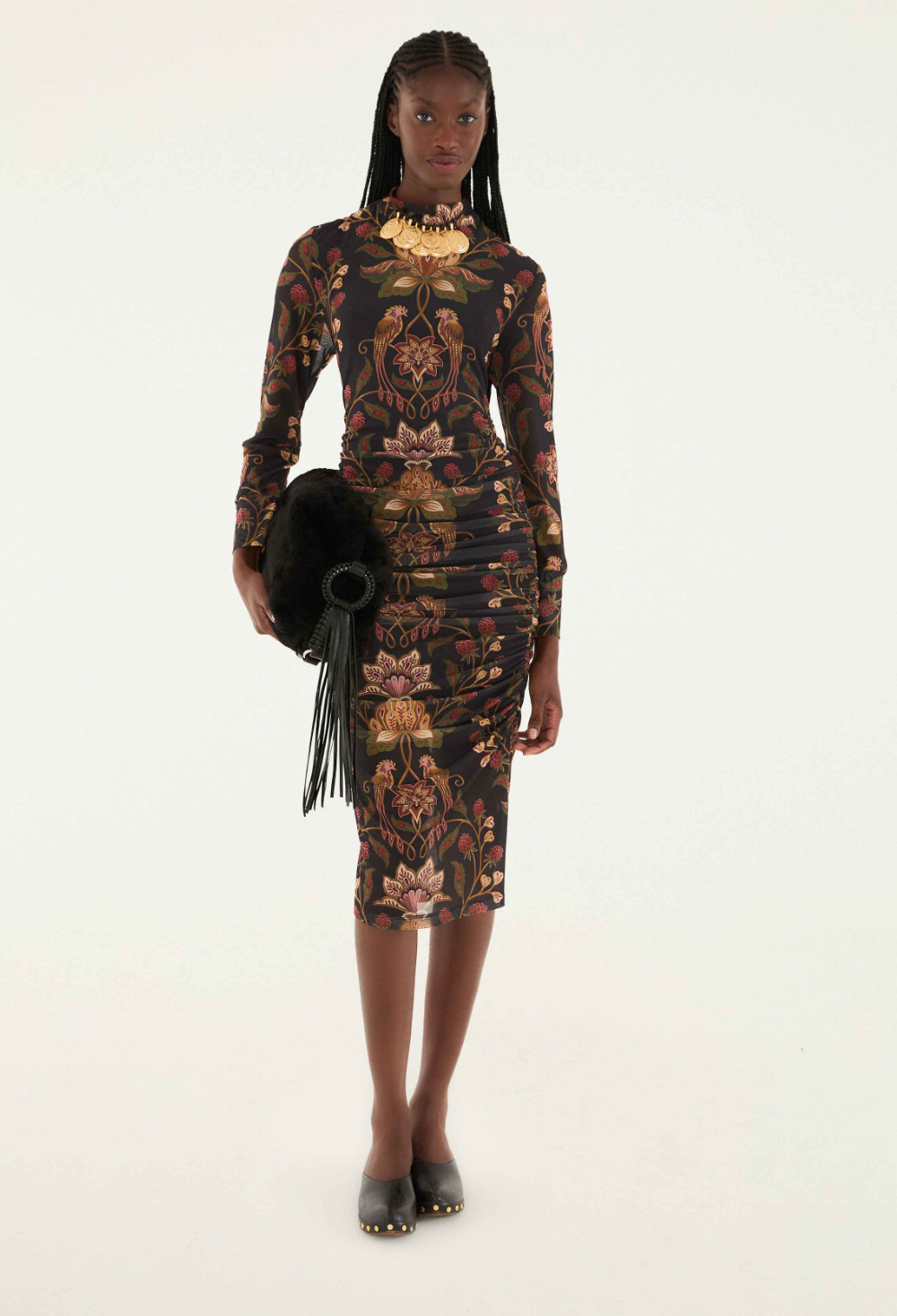 The Black Berry Garden Tulle Midi Dress features a captivating blend of deep blacks, warm olives, and rich berry tones in an enchanting botanical print. Its sleek silhouette is enhanced by delicate ruching along the waist and hips, adding a subtle texture that embraces the body's curves. The playful V neckline and long sleeves balance elegance with ease, creating a dress that feels like a walk through a dreamy Brazilian garden at dusk.