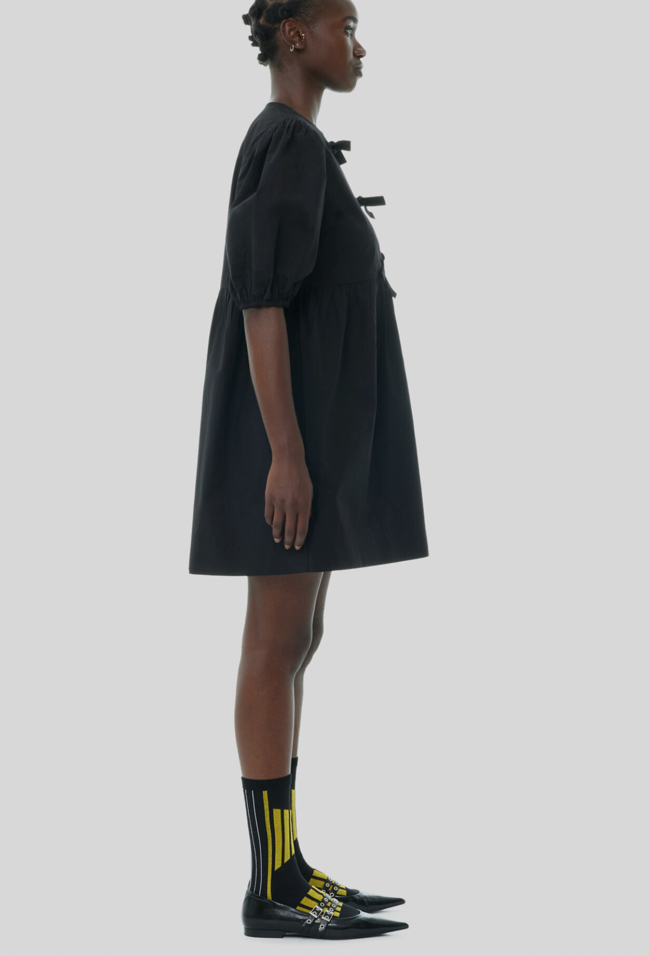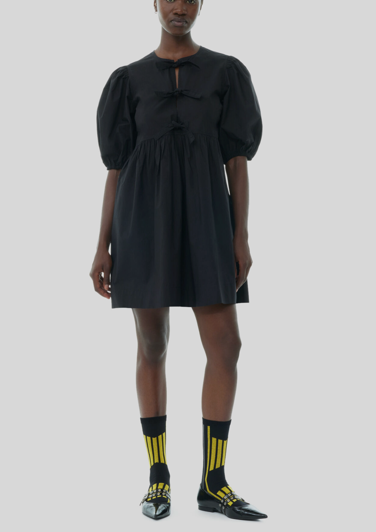 This Black Cotton Poplin Tie String Mini Dress is designed for a relaxed fit and features an open round neckline with tie closures and signature puff sleeves with elastic edges.