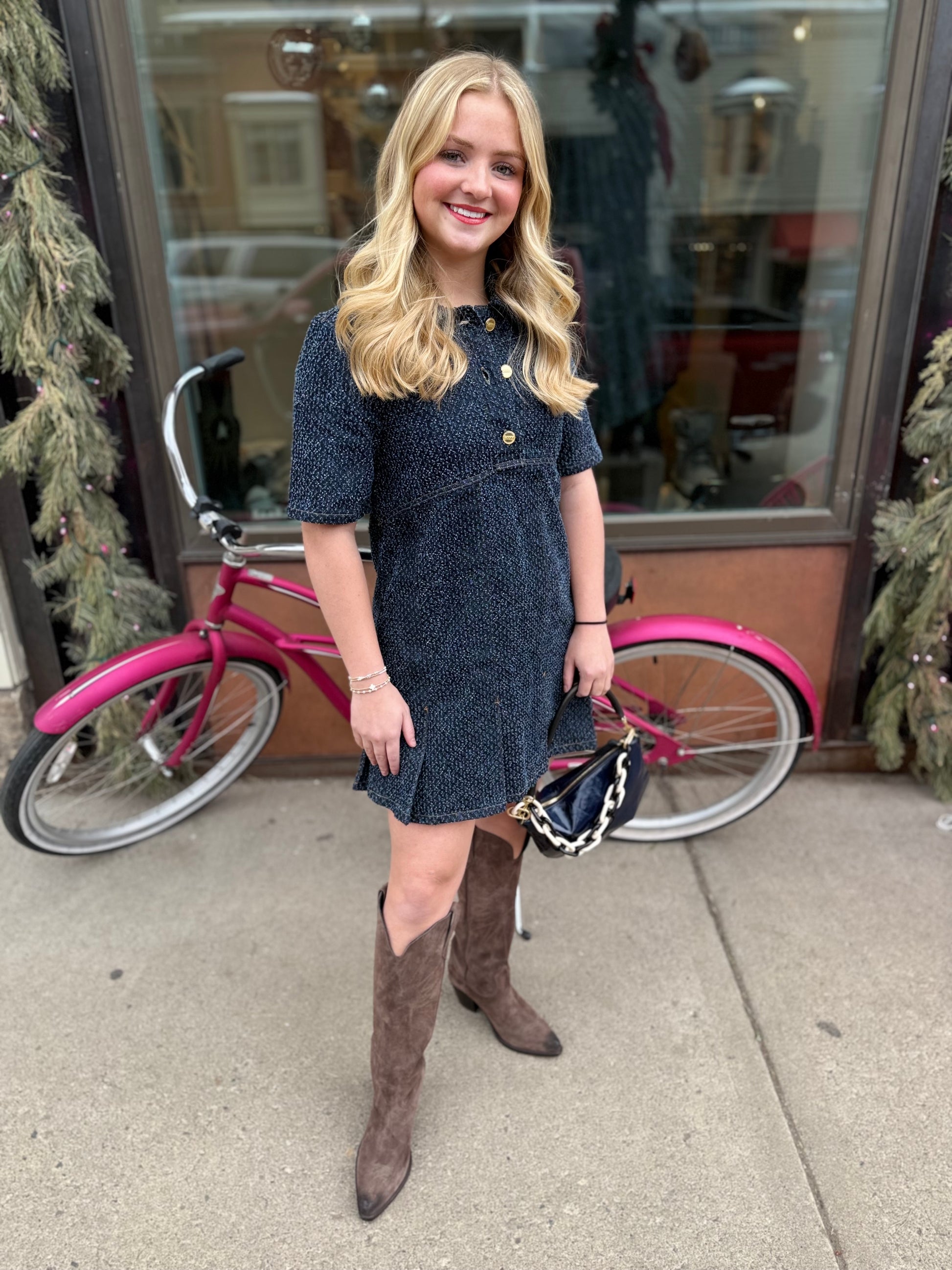 This Dark Blue Fluffy textured Mini Dress features a collar and has a button closure. The dress has short sleeves and a pleated skirt. Boxy fit.