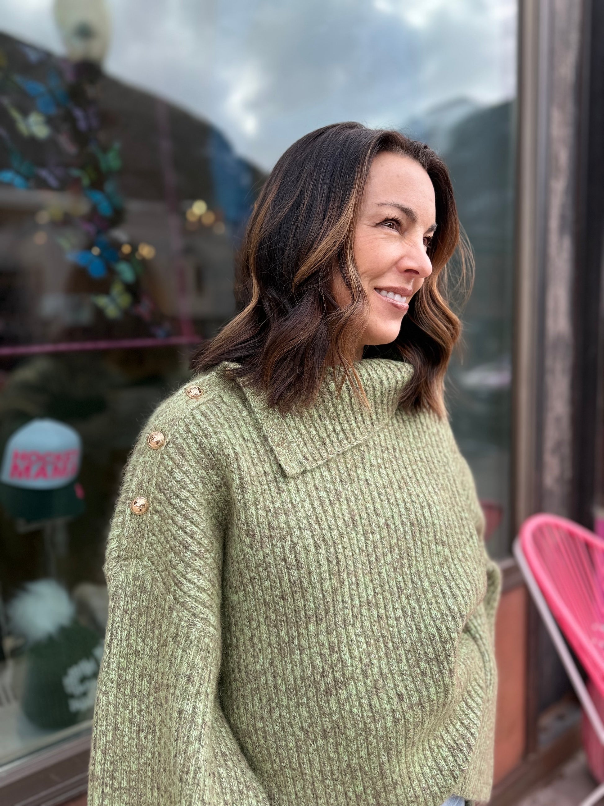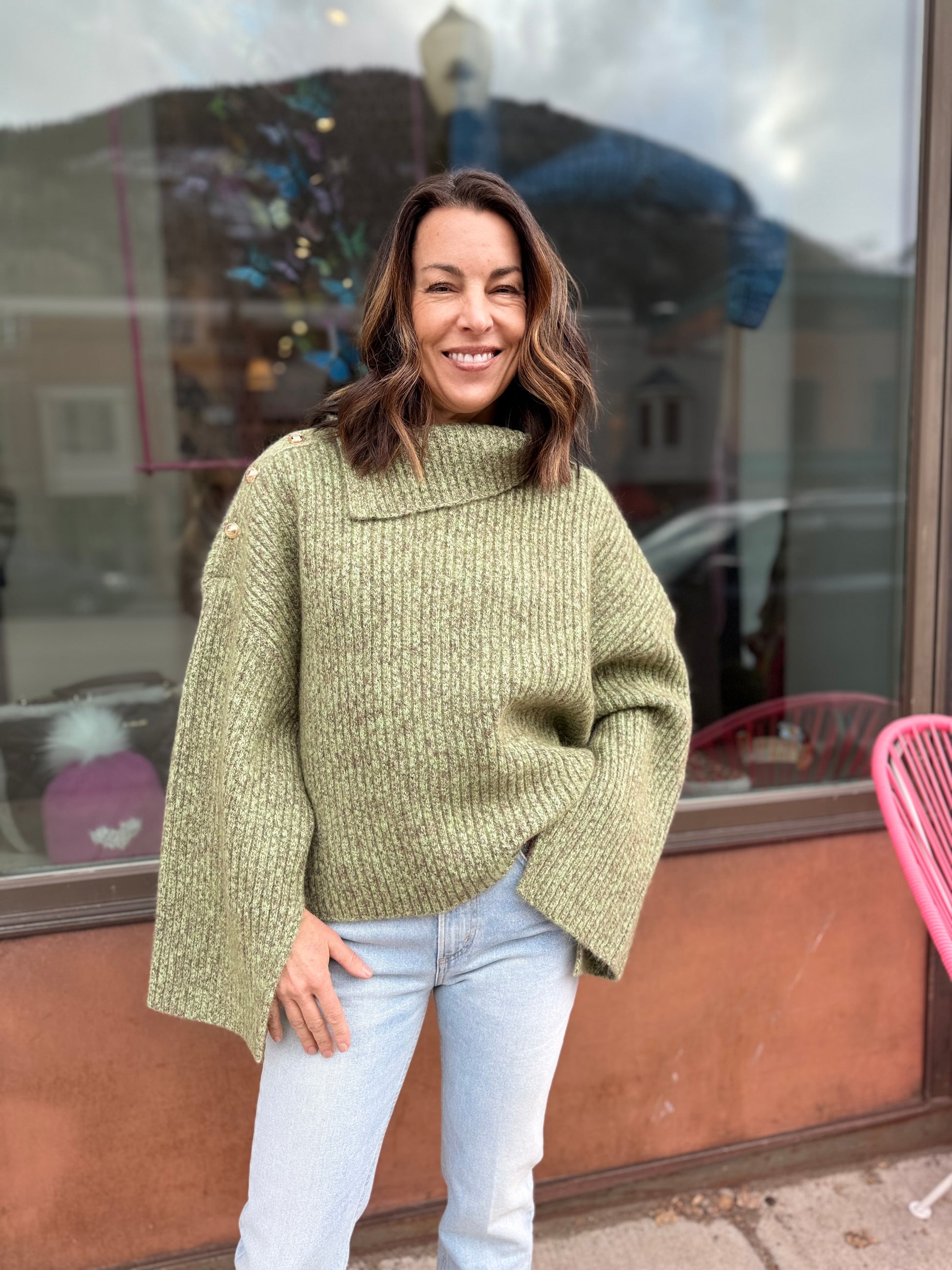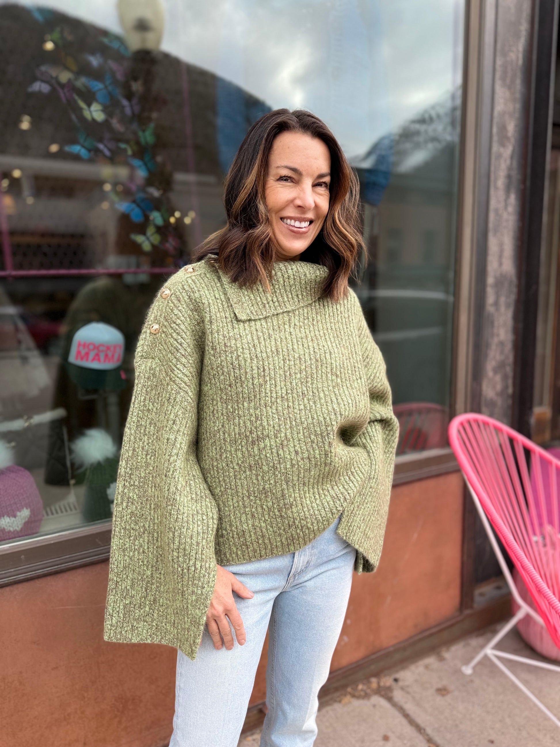 This sweater features a high, open neck collar, ribbed fabric, an open sleeve detail, boxy oversized fit, and GANNI logo gold buttons on one shoulder.