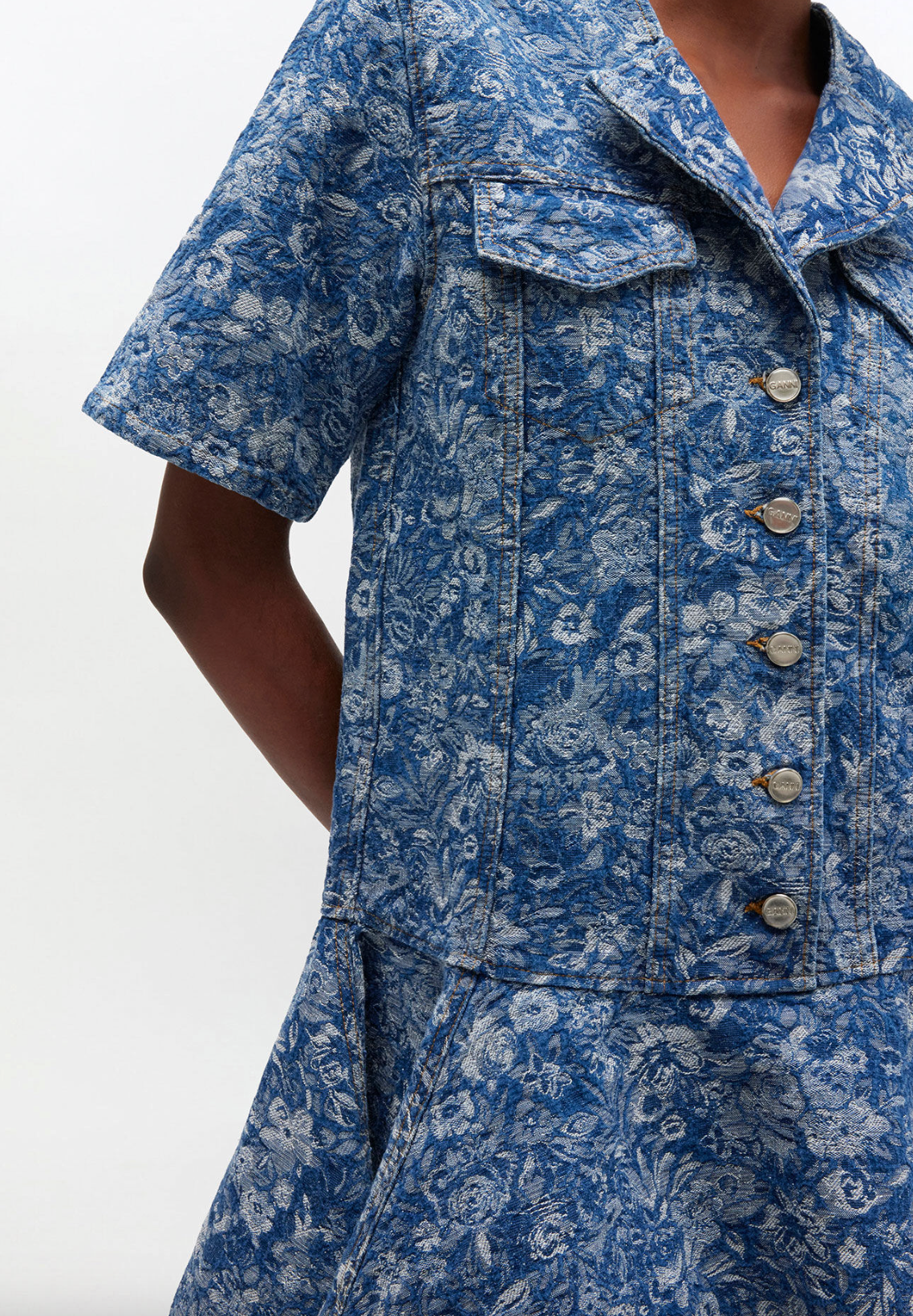 This dress features a v-neckline, button-front closure, chest pockets and a ruffled hem.