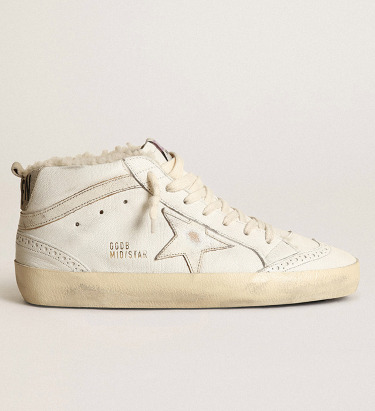 White leather Mid Star, beige suede wave, heel and star. Added warmth with shearling lining.