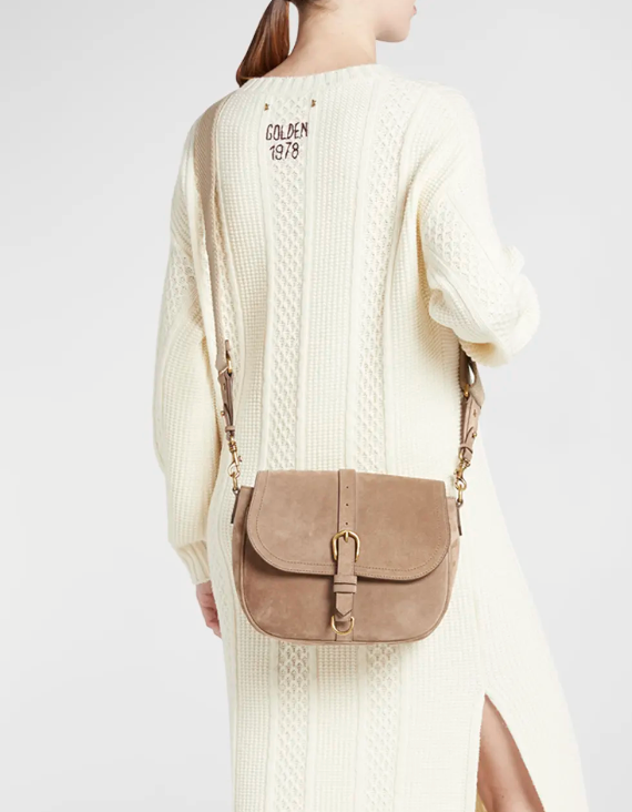 SALLY BAG MEDIUM SUEDE BODY RAW CUT FRONT PANEL FABRIC SHOULDER STRAP