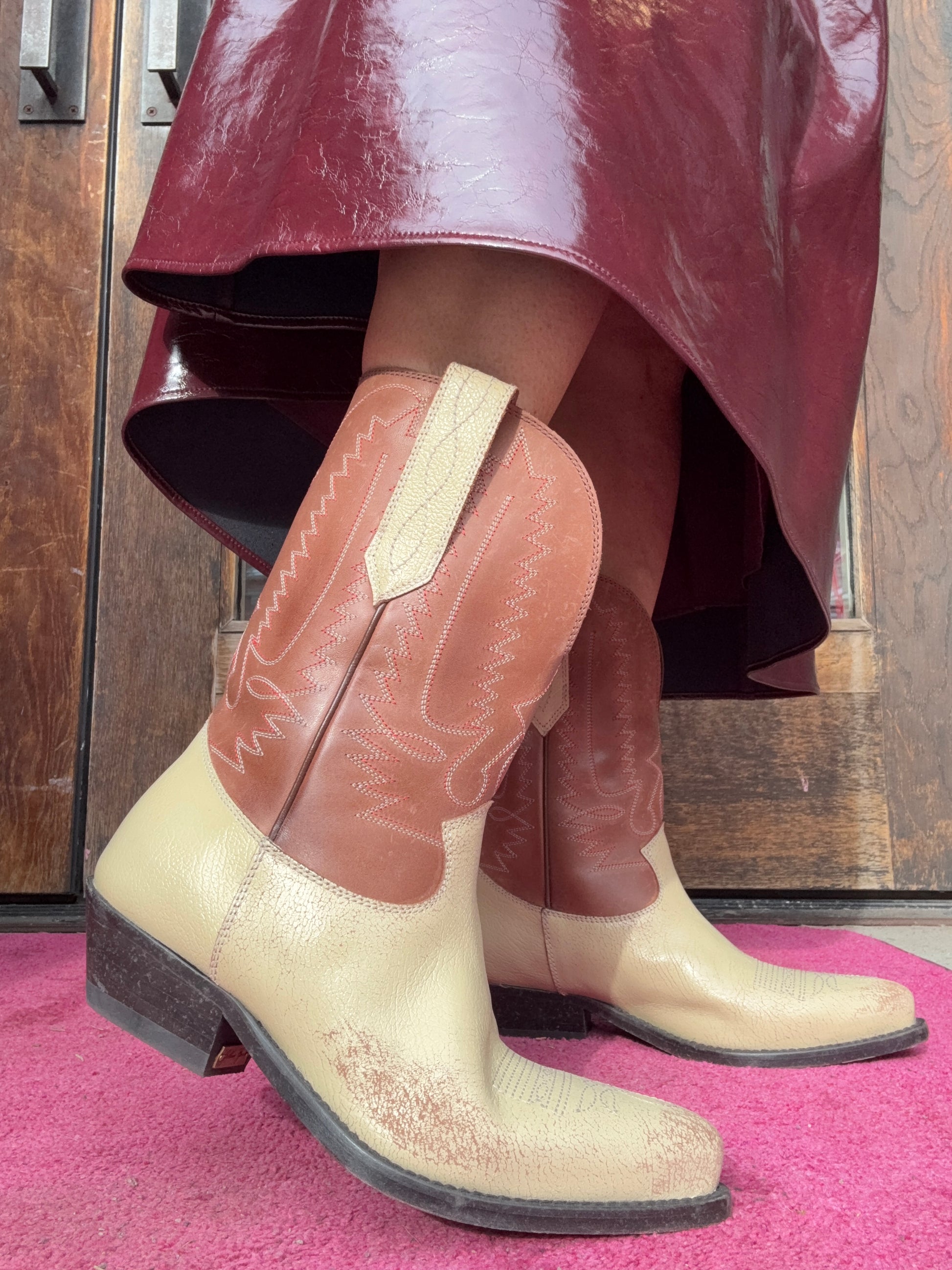 Wish Star low treated leather upper with embroidery and mould treatment by Golden Goose hits mid calf. Washed brown leather shaft with cream foot.