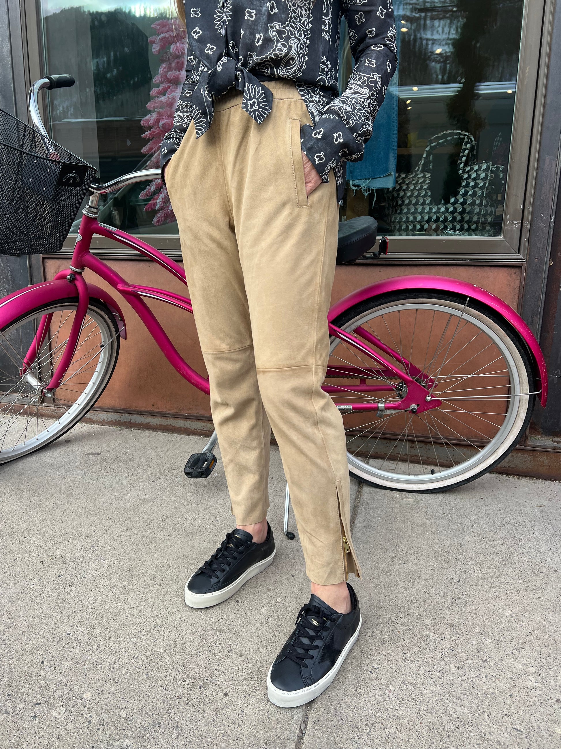 Elastic waistband pant in sueded leather with pockets and zipper ankle.