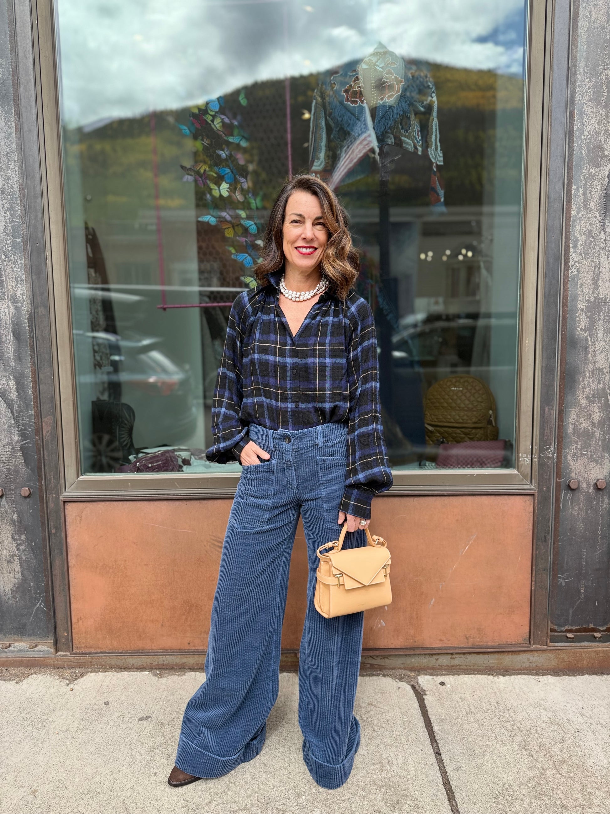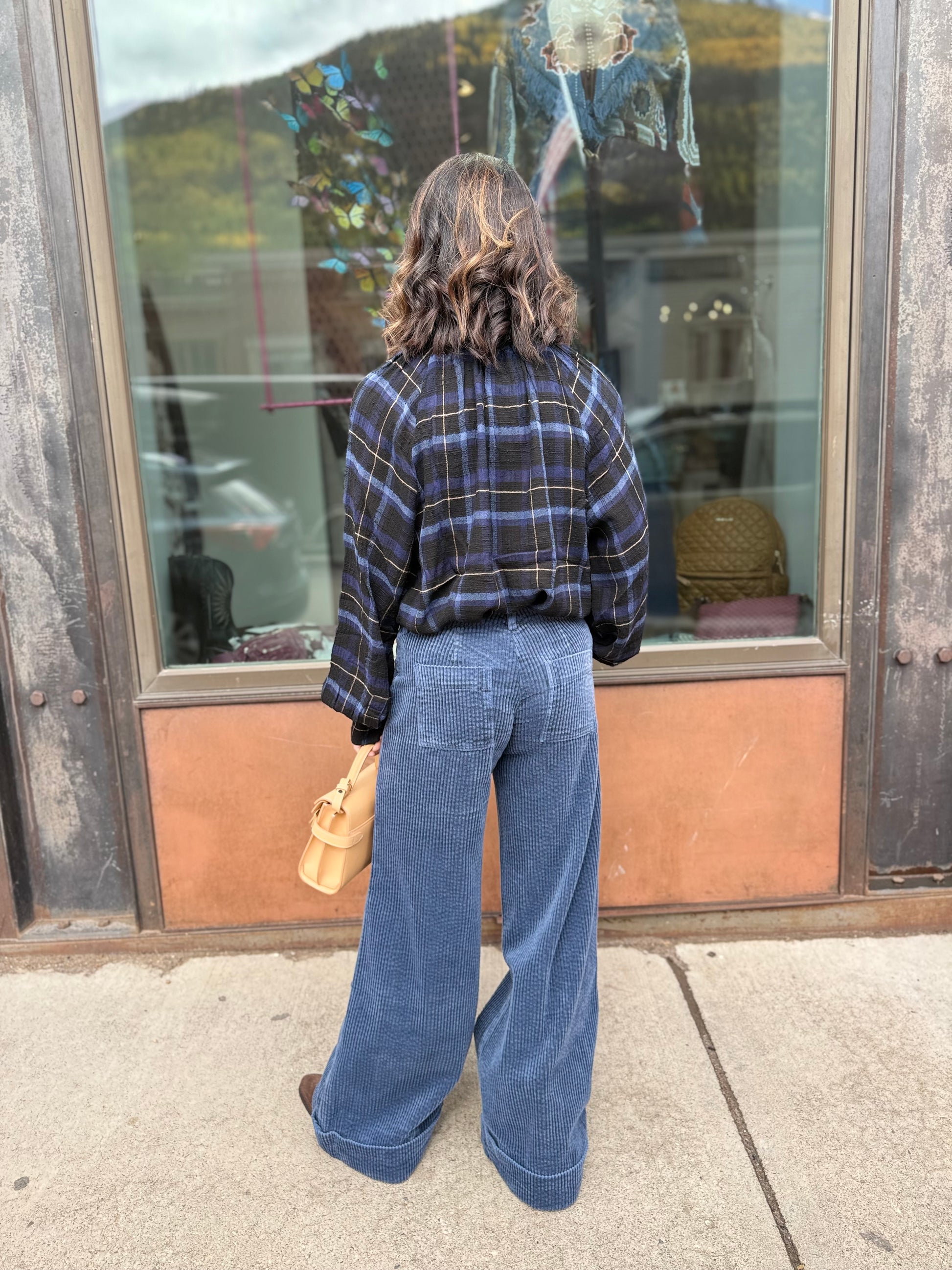 Corduroy wide leg pant with cuff by brand Hannes Roether. Button and zipper closure. Oversized front pocket.
