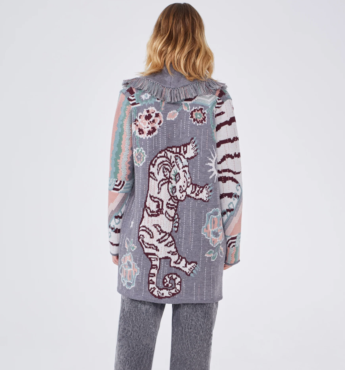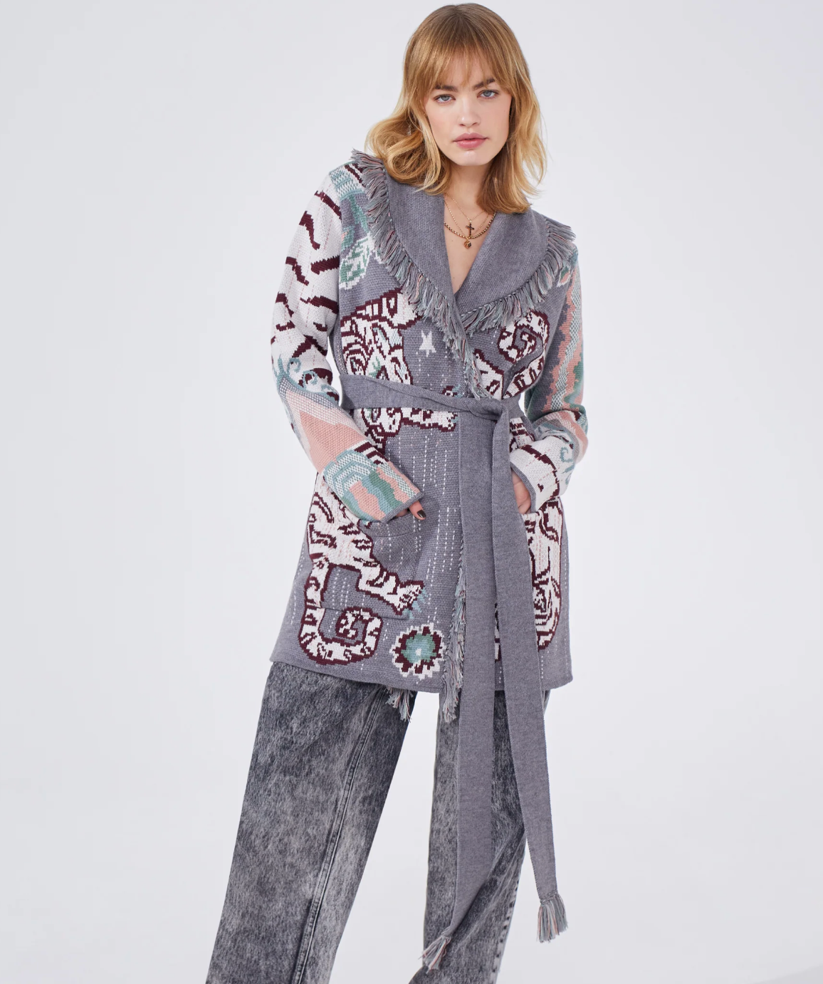 100% wool cardigan with tie belt and fringe in tiger print by Hayley Menzies.