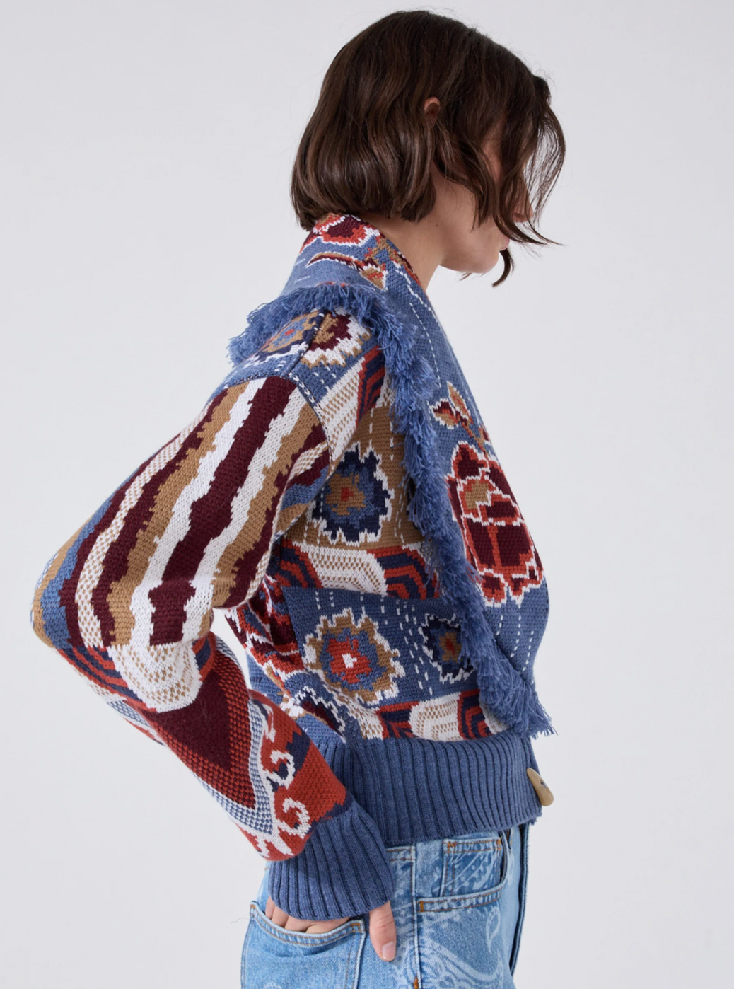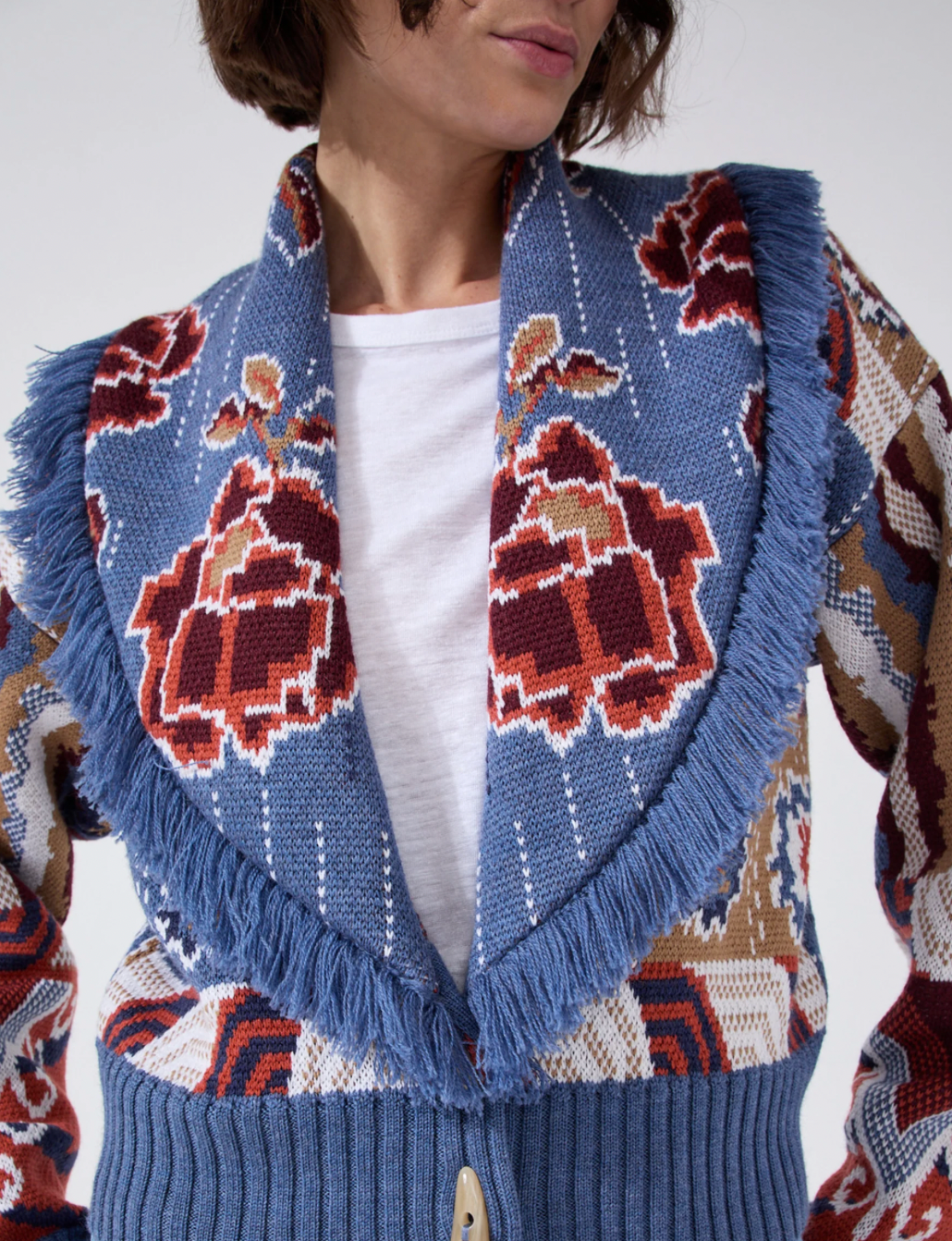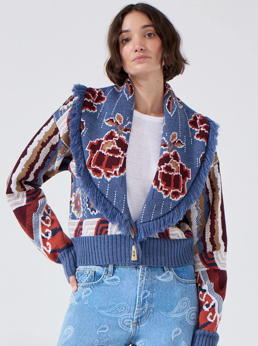 Looking bomb starts with this season's tiger print knitted bomber - a best-selling style updated for now in navy blue. Inspired by an antique book on carpets and celebrating an endangered species, make this your essential seasonal layer with denim and dresses.