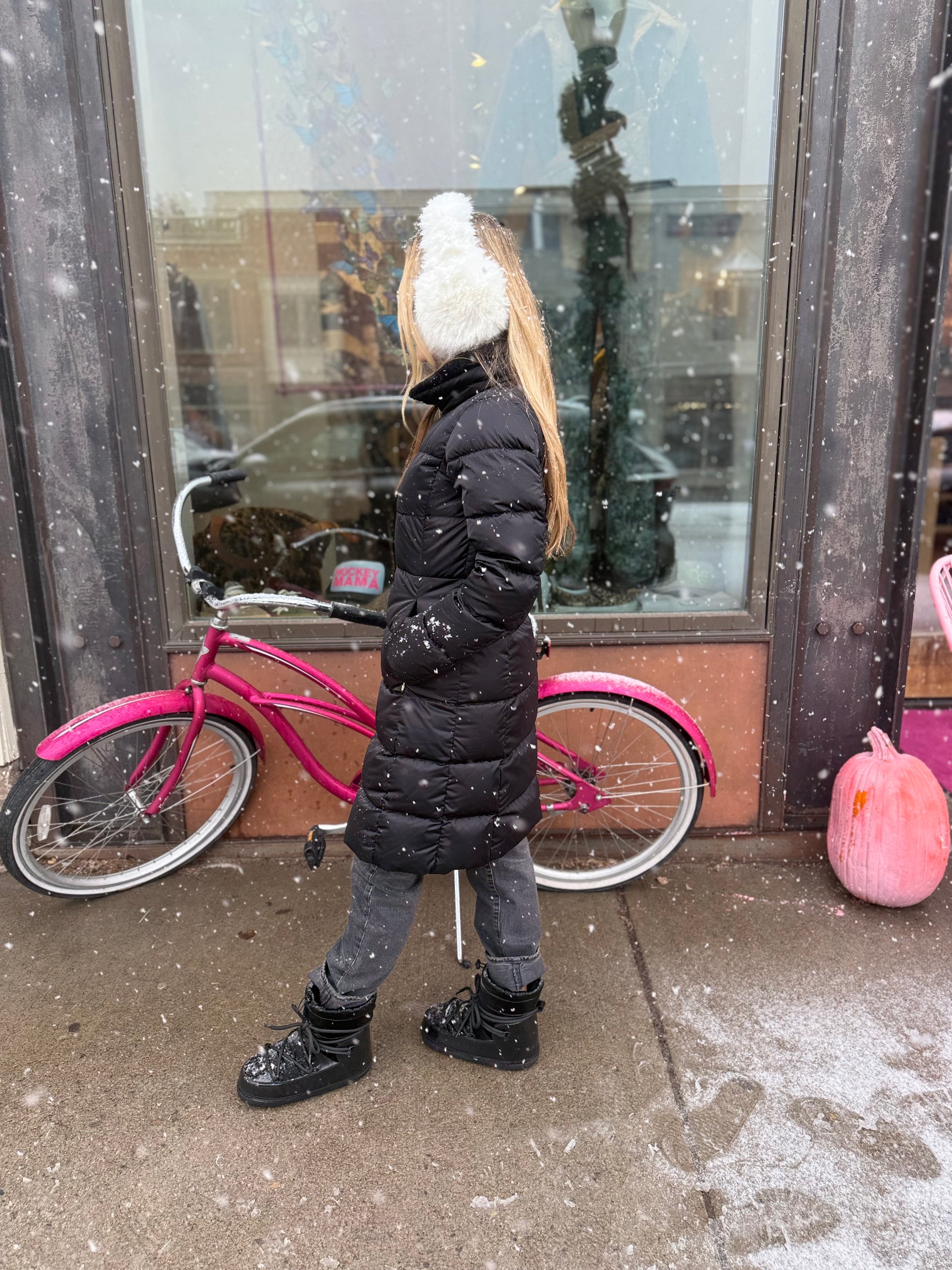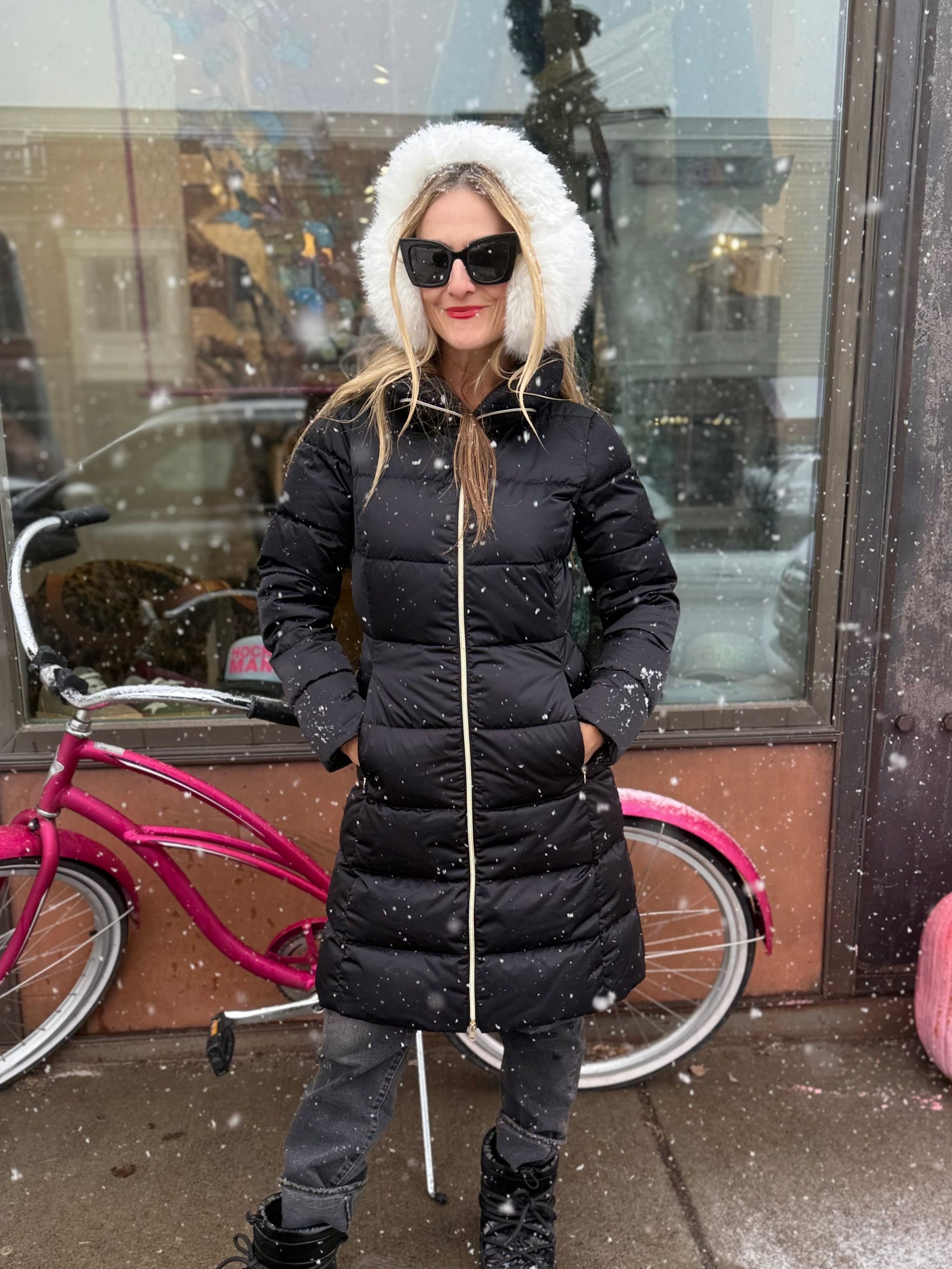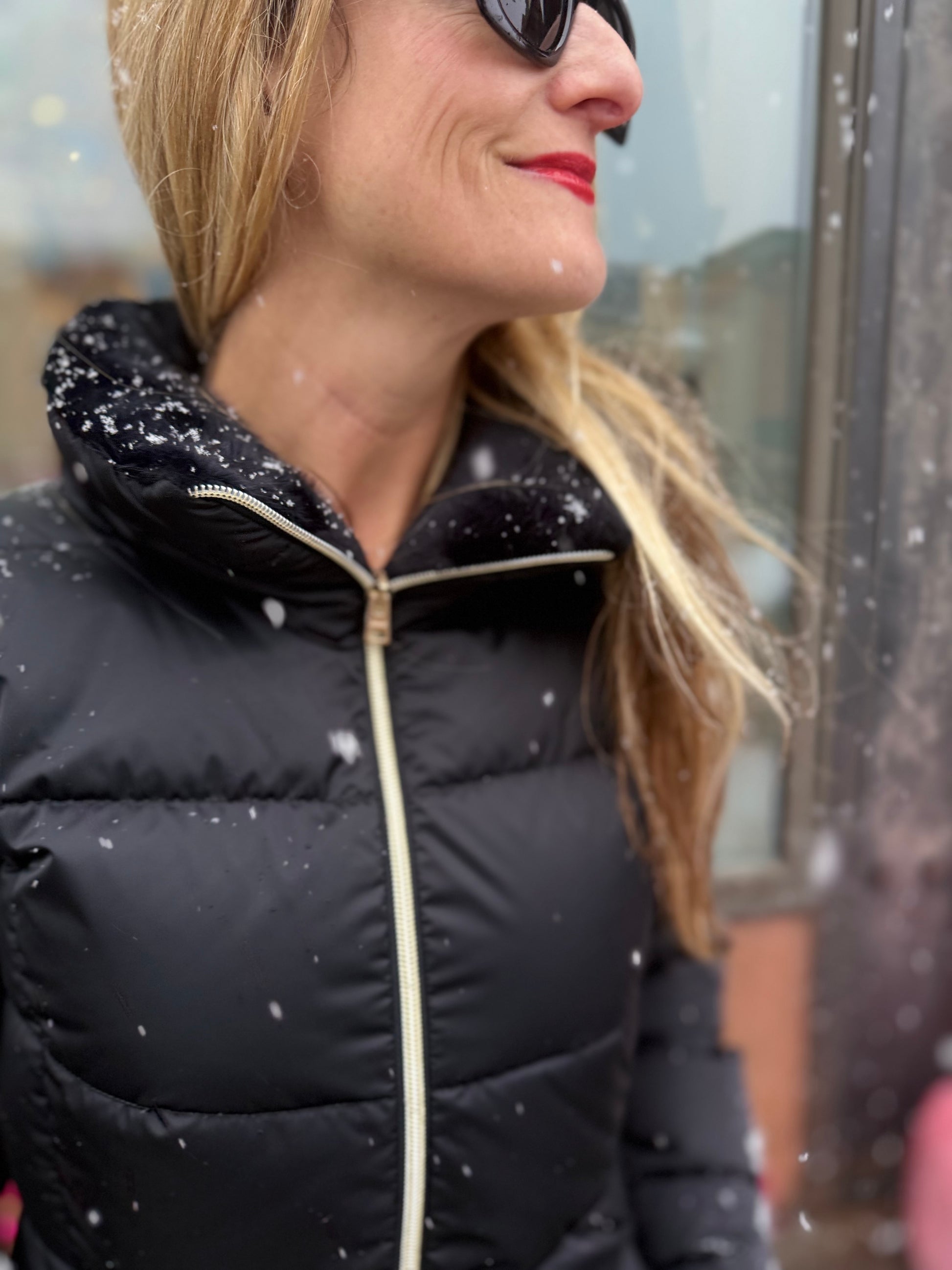 Satin down jacket with a flared bell hem and faux fur lapel by Herno.