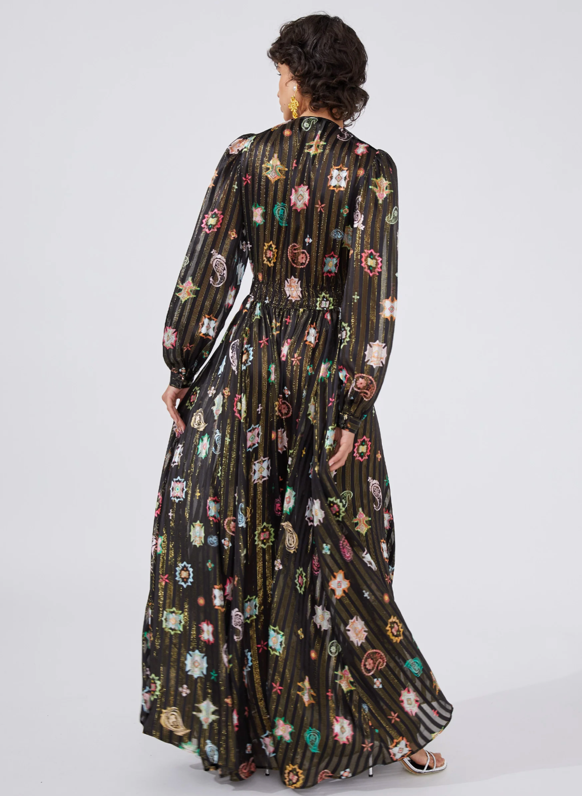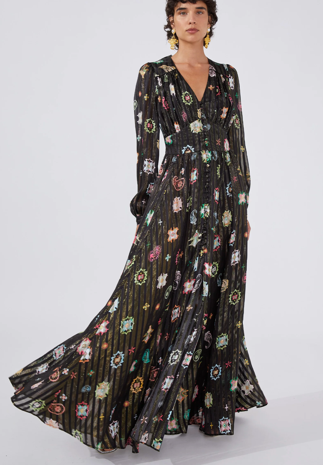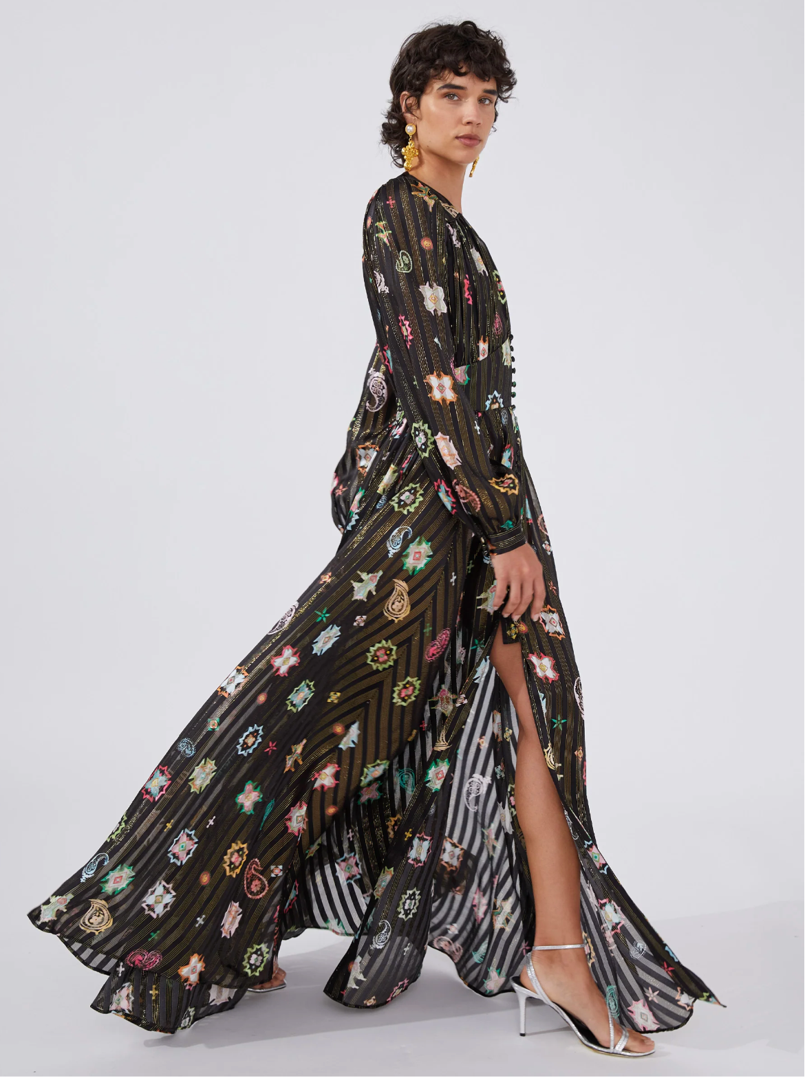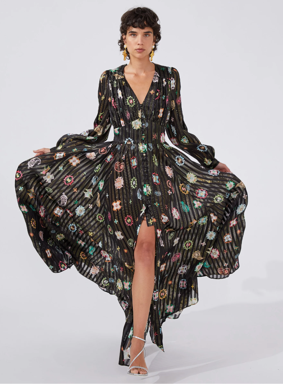 100% silk in a geometrical print inspired by vintage carpets and artisanal tapestries. Threaded with metallic lurex to shimmer in the light. Featuring fitted waist panels and gathering on the bodice, at the shoulders and skirt to flatter the body, a skin-flashing plunging V neckline and thigh-high split is balanced with statement full length sleeves. Lined with silk to a mini length for comfort and modesty.