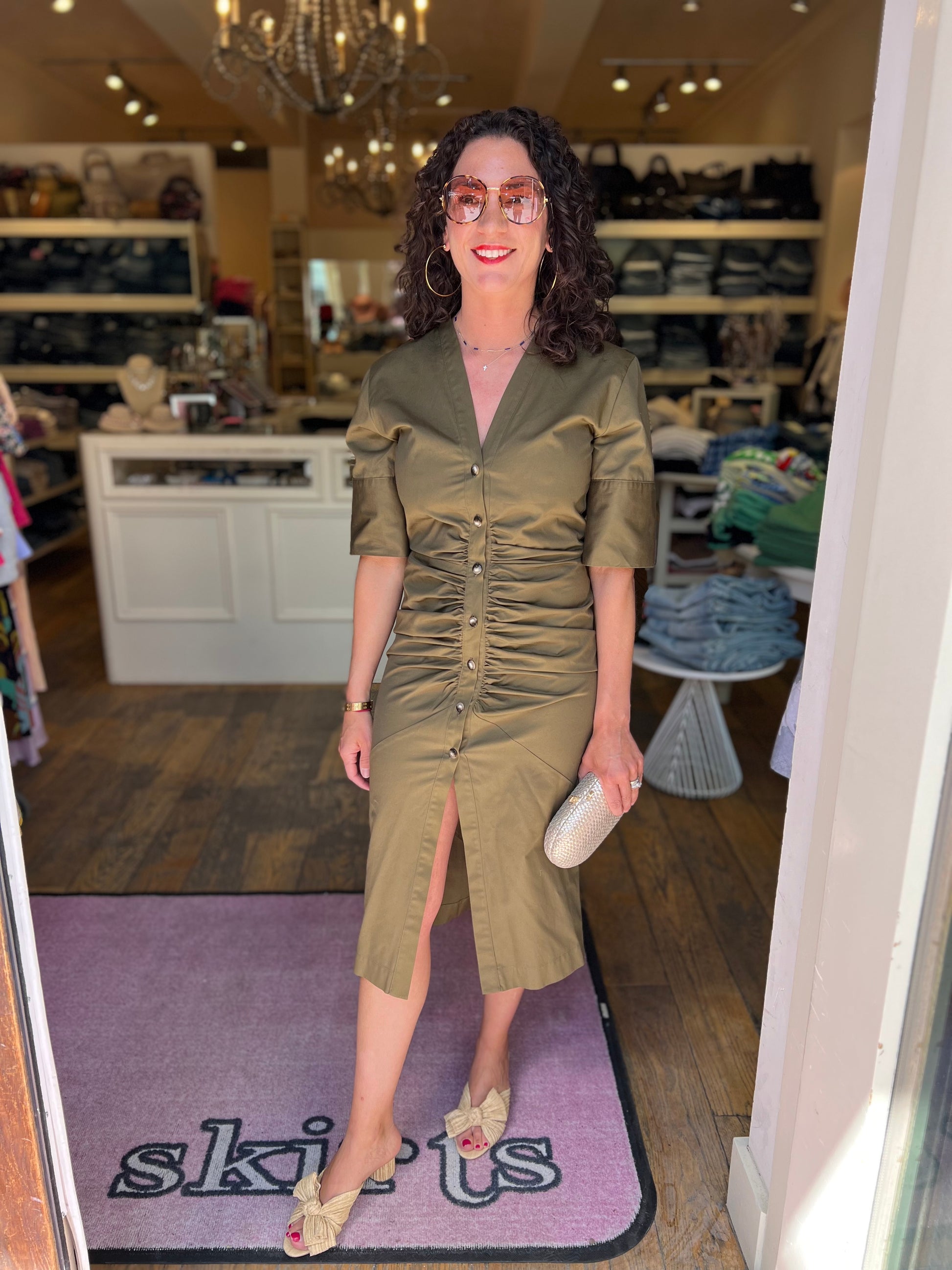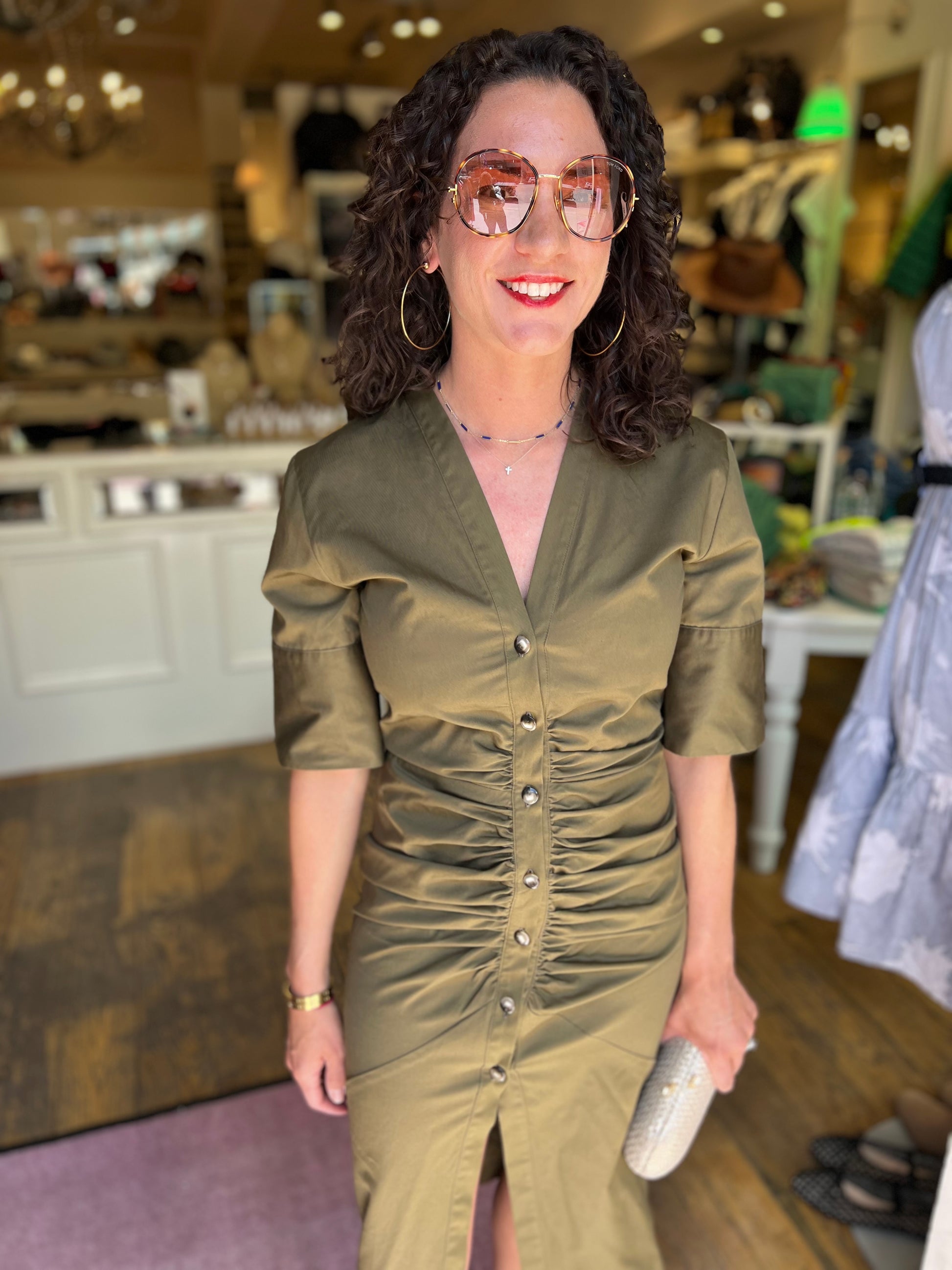 Cotton fitted dress with button down silhouette by Just Bee Queen. Pleated and fitted to the waist.