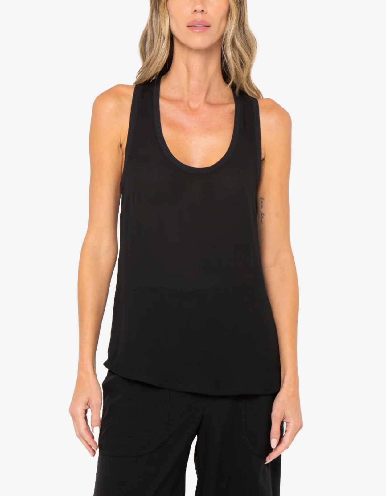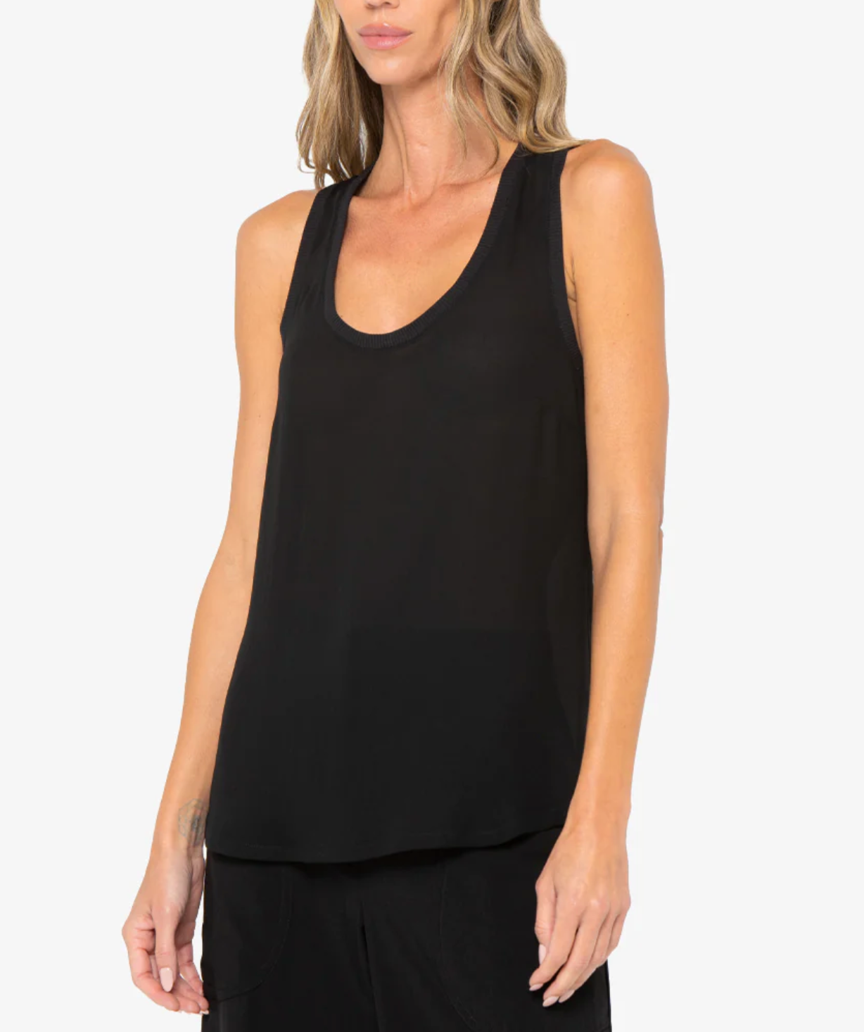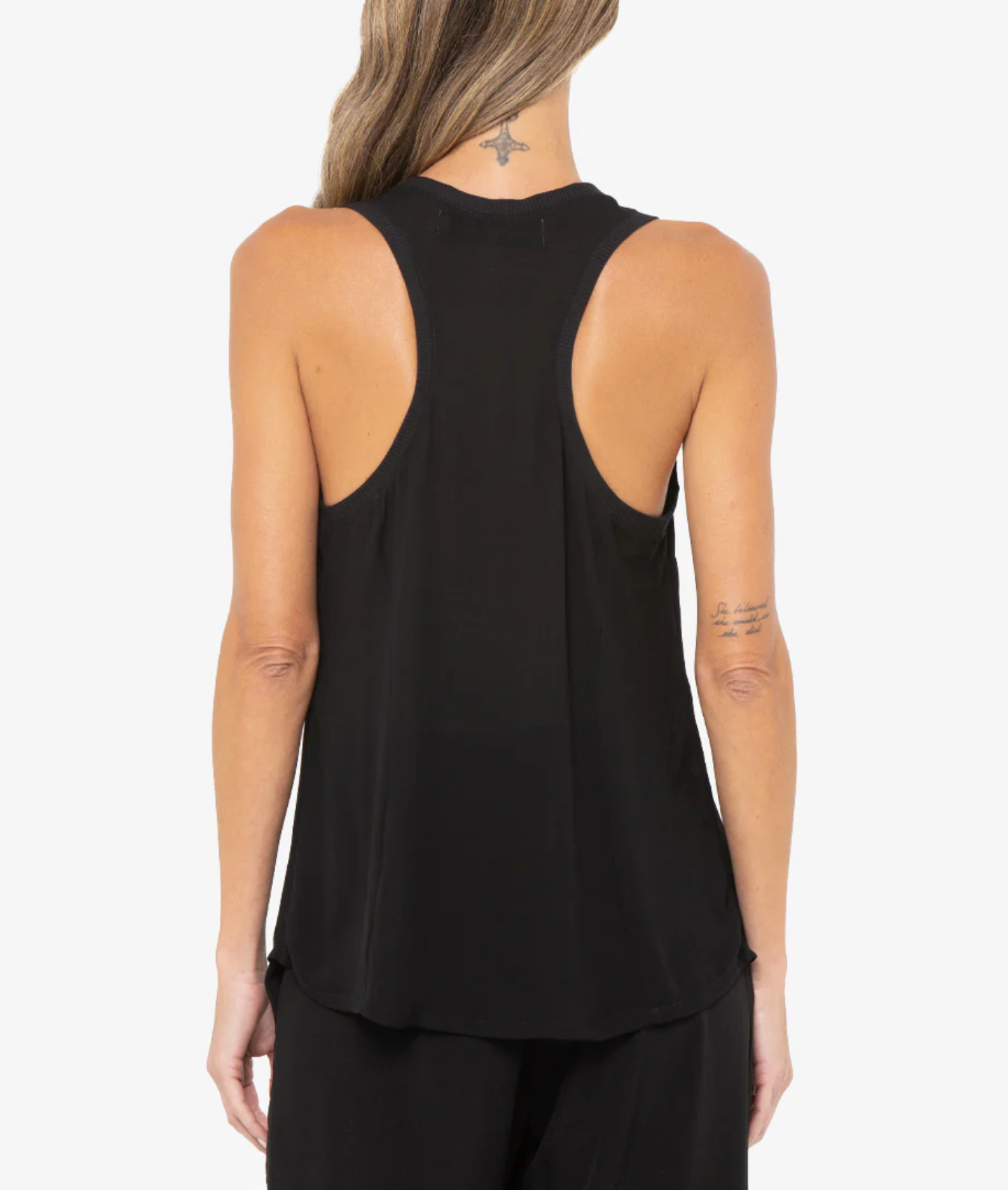 Racerback tank with raw edges by Just Bee Queen.100% Polyester.