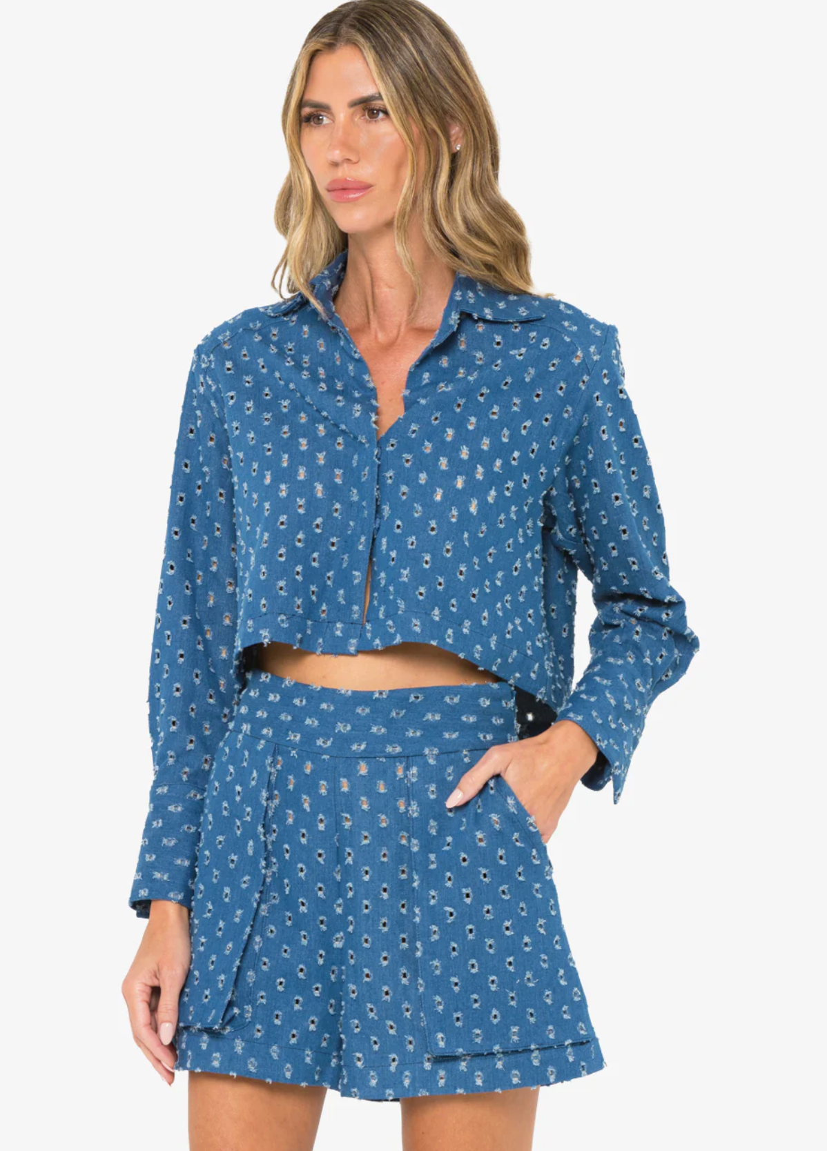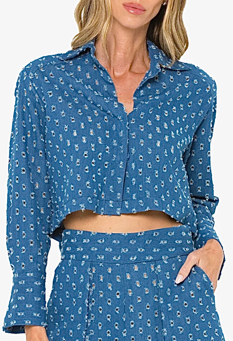 Collared cropped length, wide banded wrist cuff, relaxed fit, hidden front closure, pleat at back.
