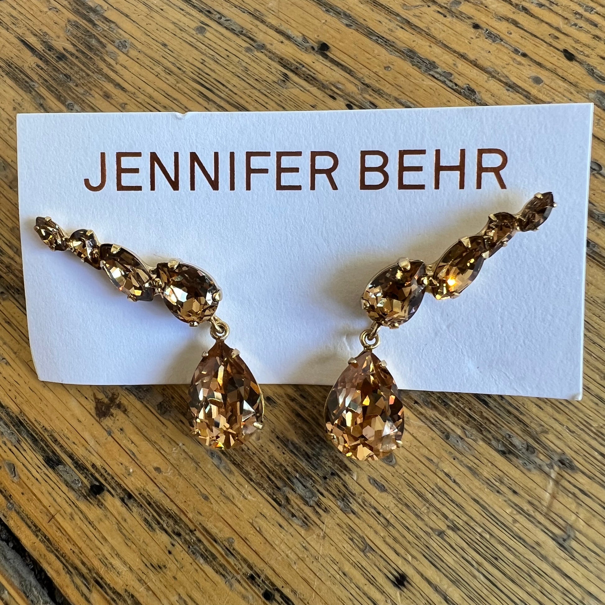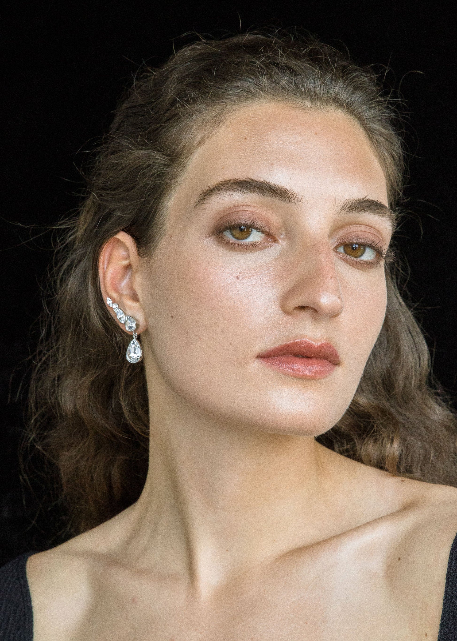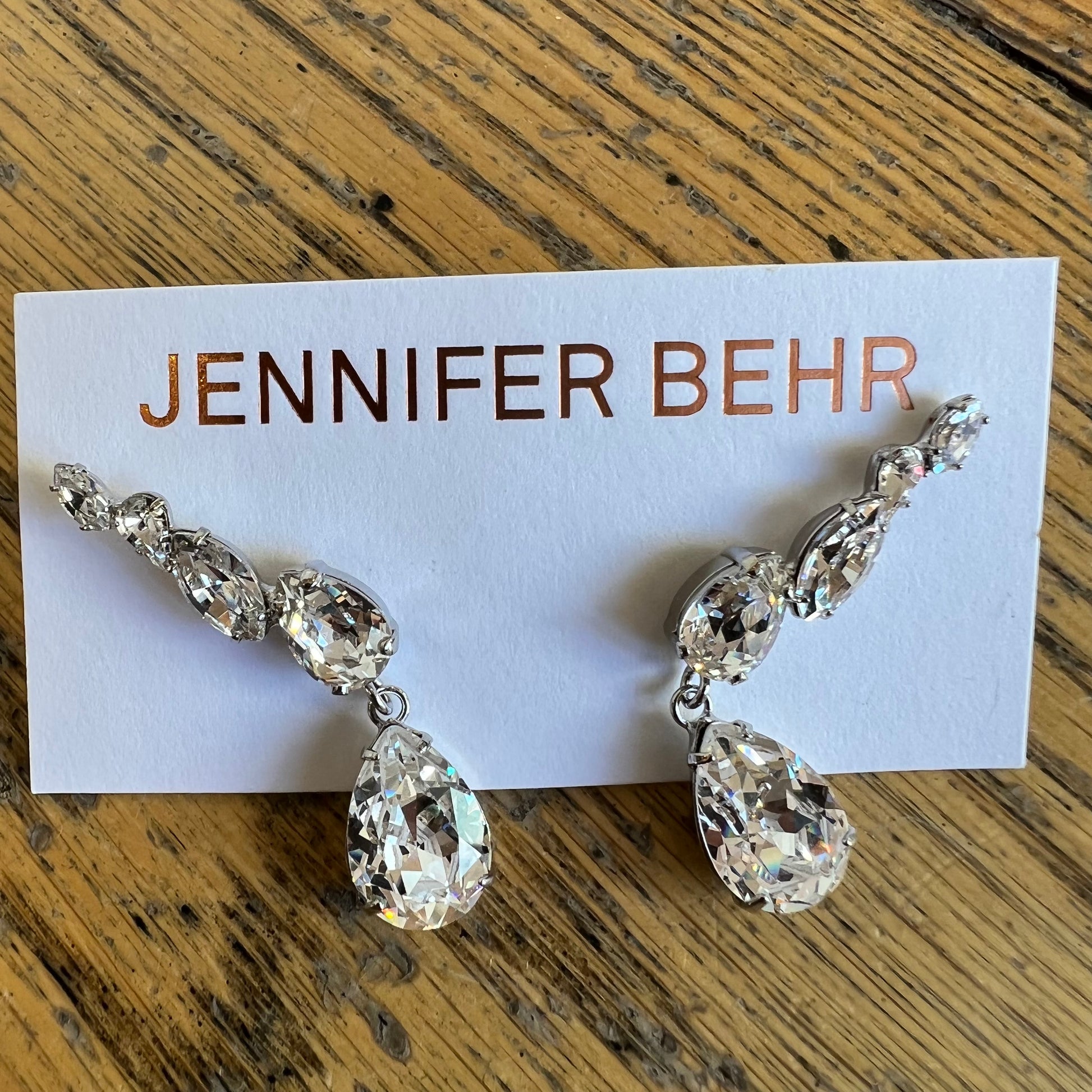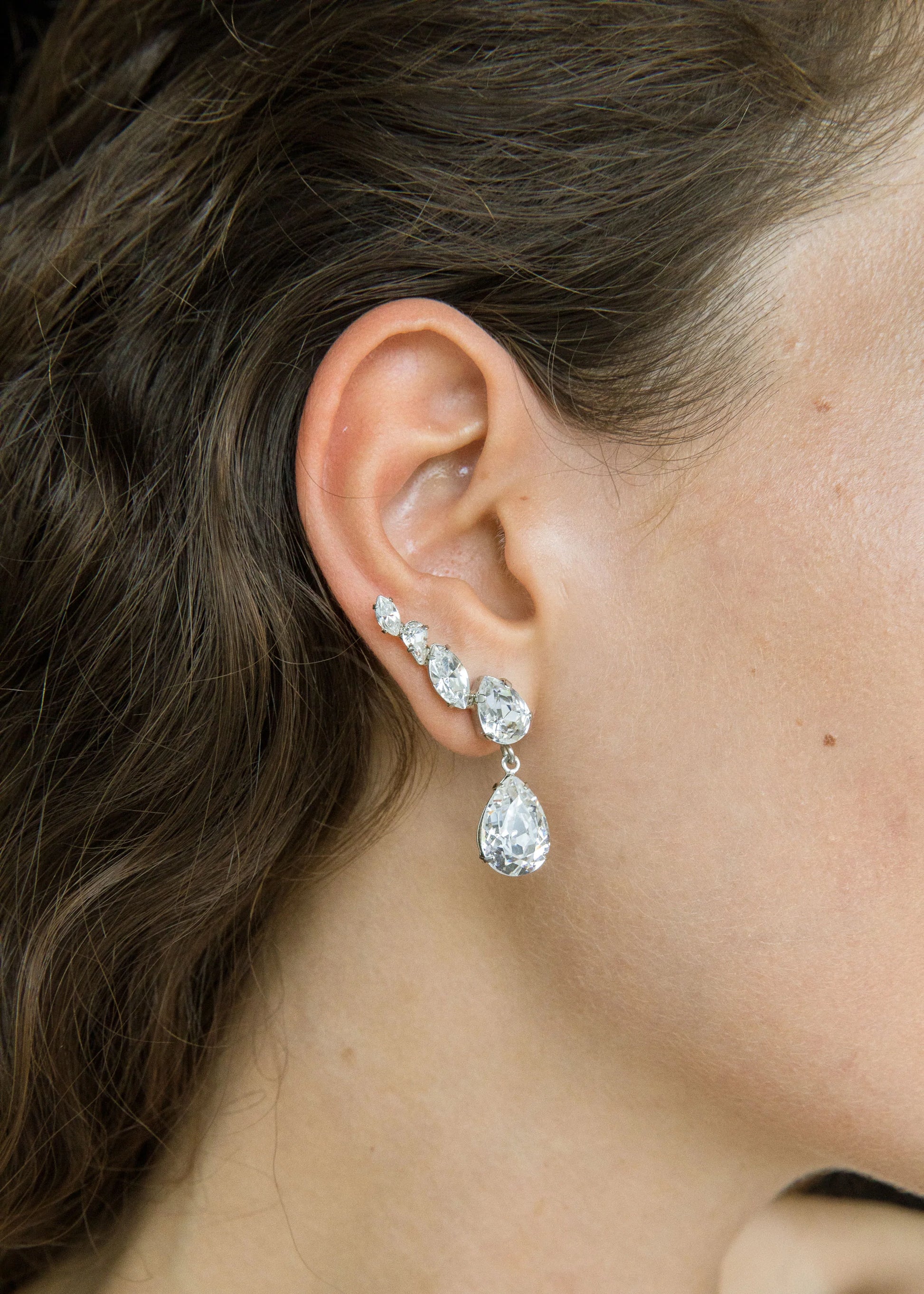 A unique ear crawler silhouette lines the ear with petite crystals while a teardrop crystal finishes the earring to frame the face with movement and catch the light.