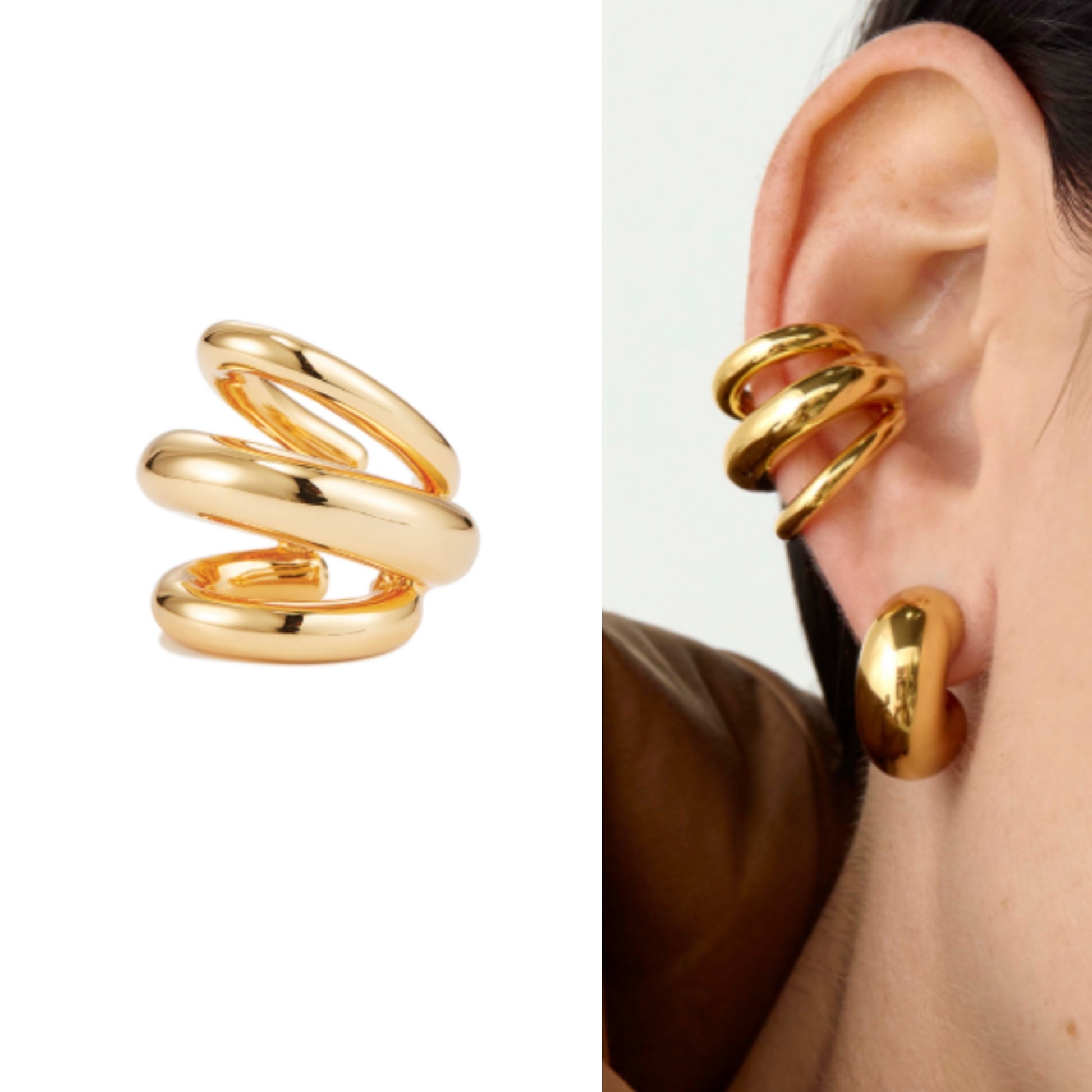 A statement-making ear cuff with rounded ends. The Tome Triple Ear Cuff is solid, so you won't be able to squeeze it into place. To wear, position at the thinnest part of your ear, pushing over the edge so it hooks inside. Once it feels secure, wiggle to adjust in place. Finished in high-polish gold.