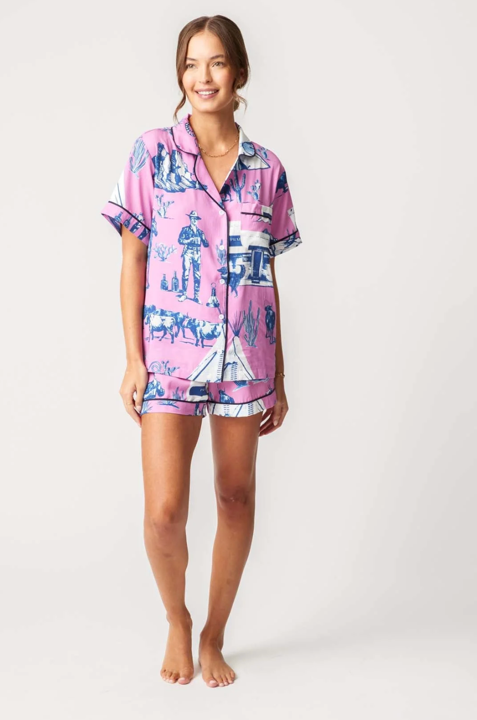 Our Women’s Pajama Shorts Set — is cut in a timeless silhouette with classic piping detail. The shorts’ elastic waist and adjustable ribbon tie ensure a custom, universally flattering fit.