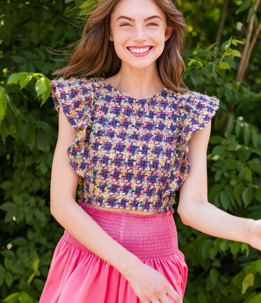 CONFETTI TWEED CECILIA TOP, PAIR WITH THE ERICA SHORT WHICH COMES IN MULTIPLE COLORS.