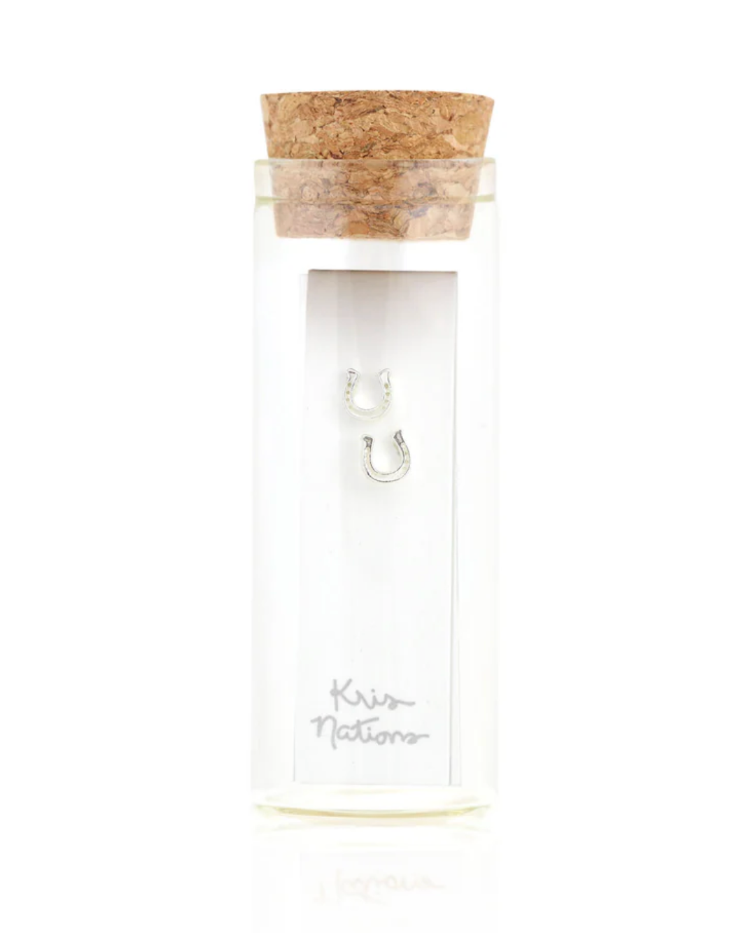 Horseshoes are talismans of fortune and protection. Channeling the spirit of the open range, they ward off bad juju and rustle up good vibes. Measure 6.5mm in length. Available in 925 sterling silver or 18K gold vermeil (925 sterling silver with 18K gold plating). Made with recycled sterling silver. Packaged in our signature glass bottle.