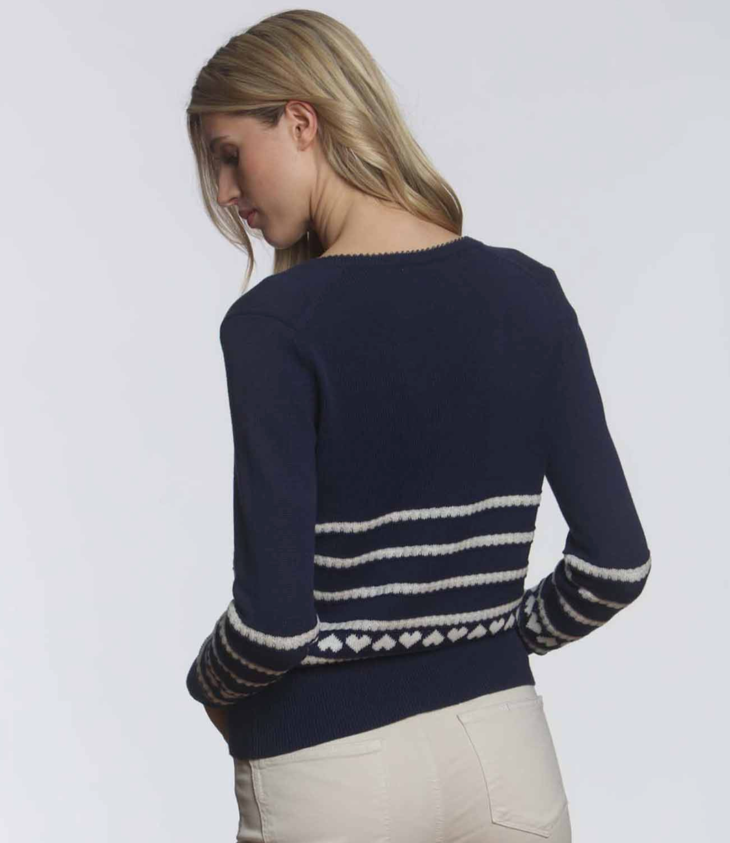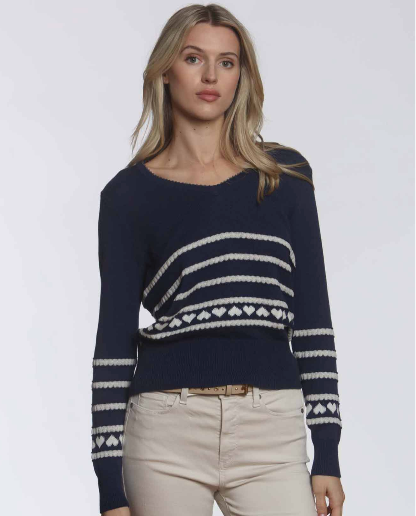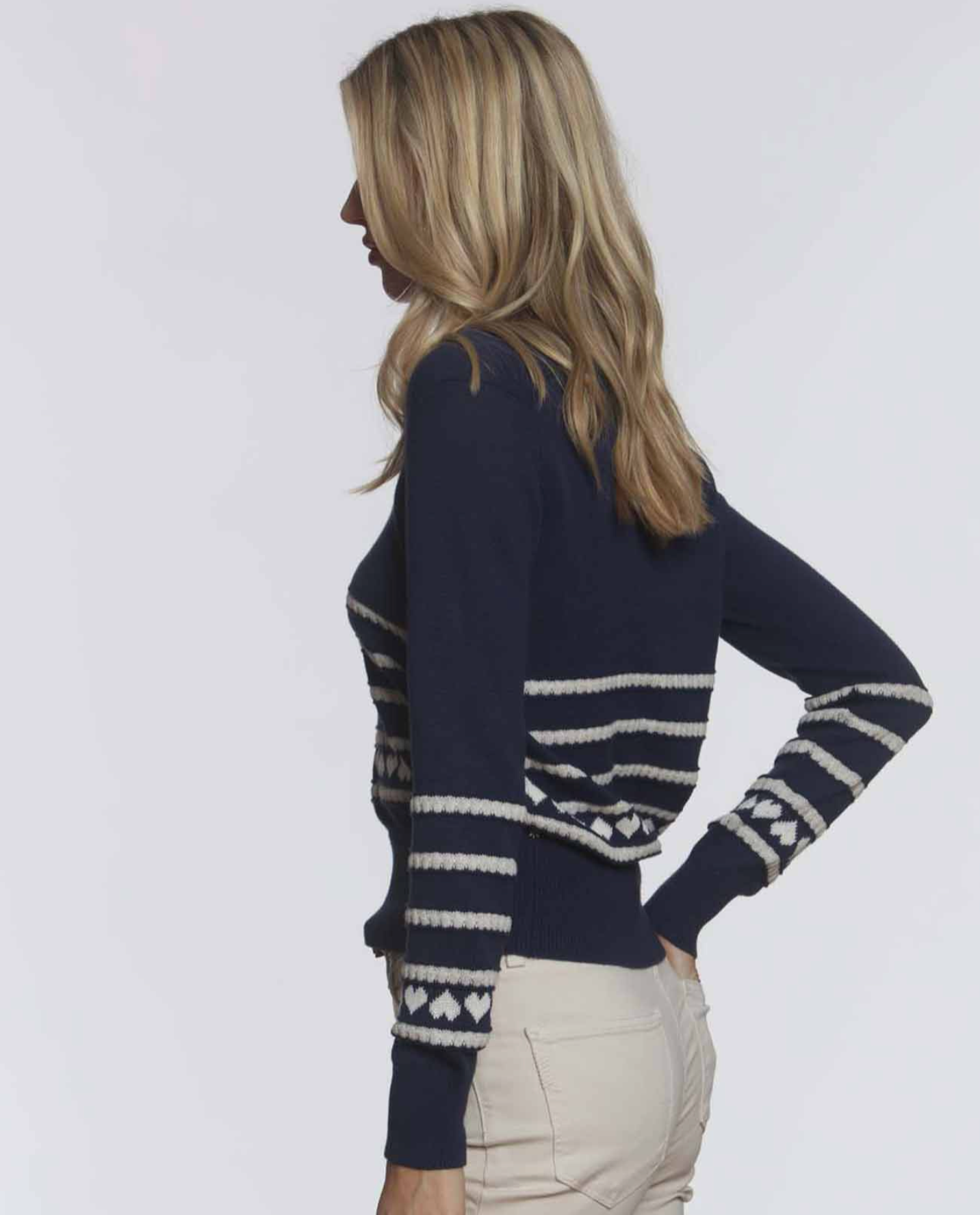 Boba Hearts Vee is a mid weight cotton novelty stripe, with bubbly textured stripes interlaced with linear intarsia hearts. Wear it daytime in the office, or as a fresh top option with white shorts for warmer days ahead.