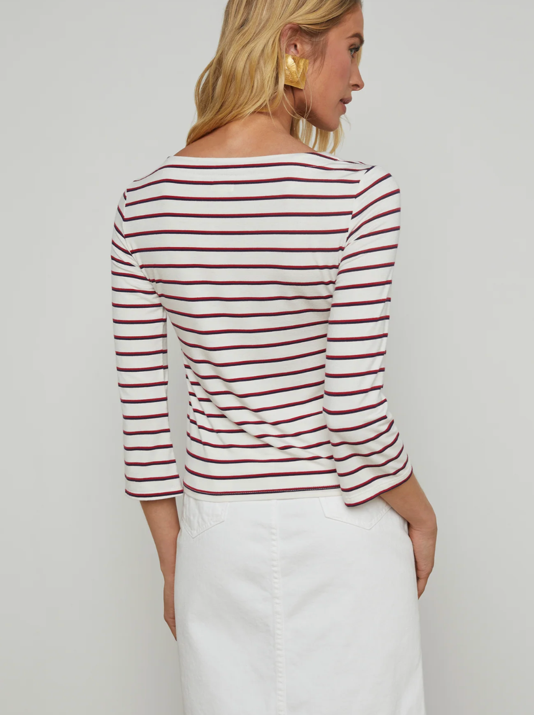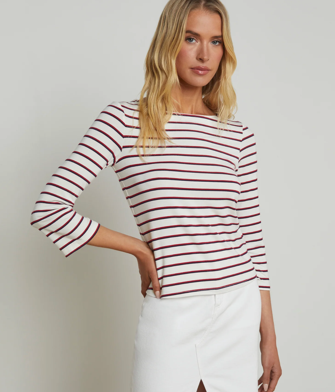A super soft and ultra chic boatneck top, now in a nautical red, navy, and white stripe.