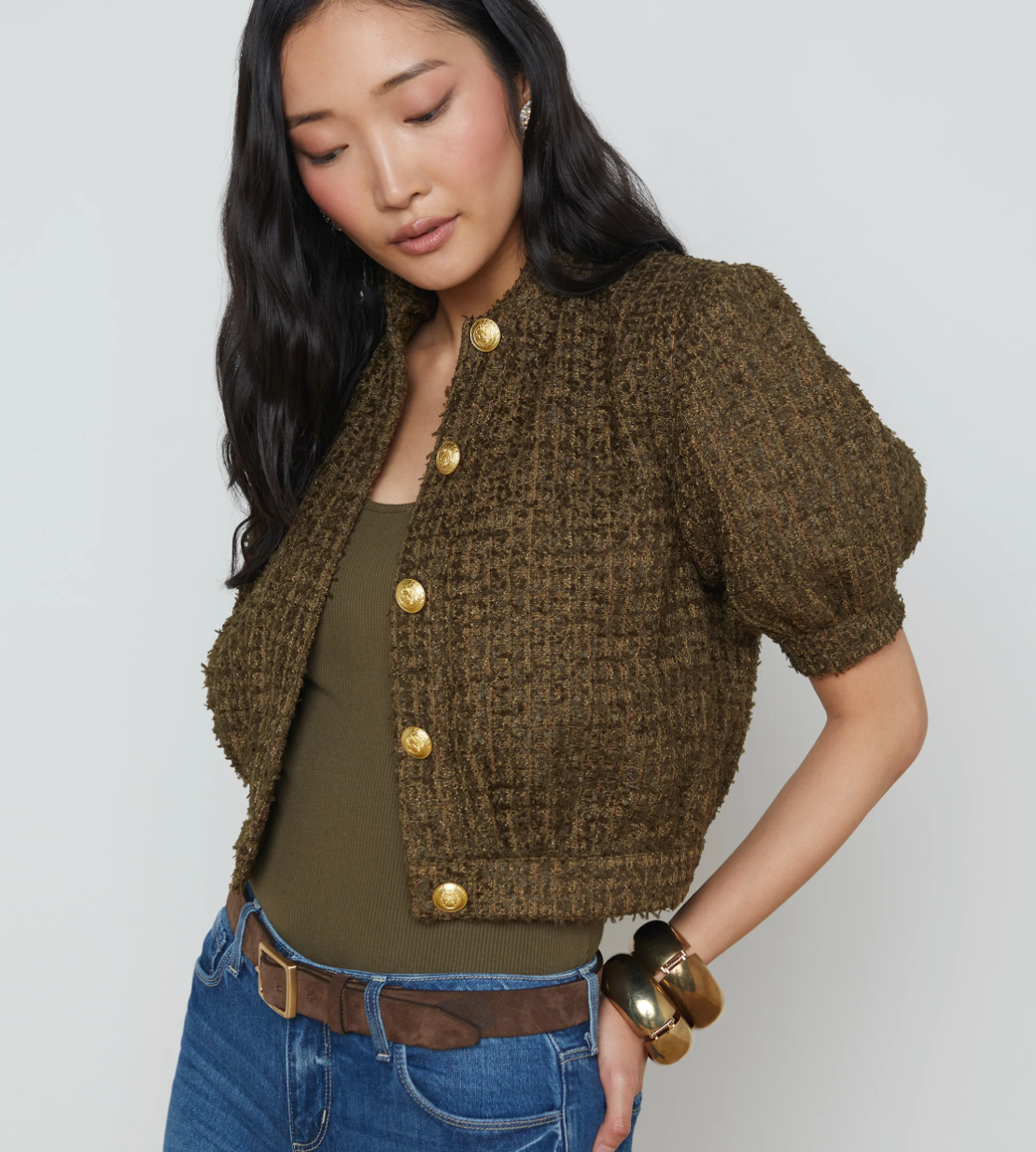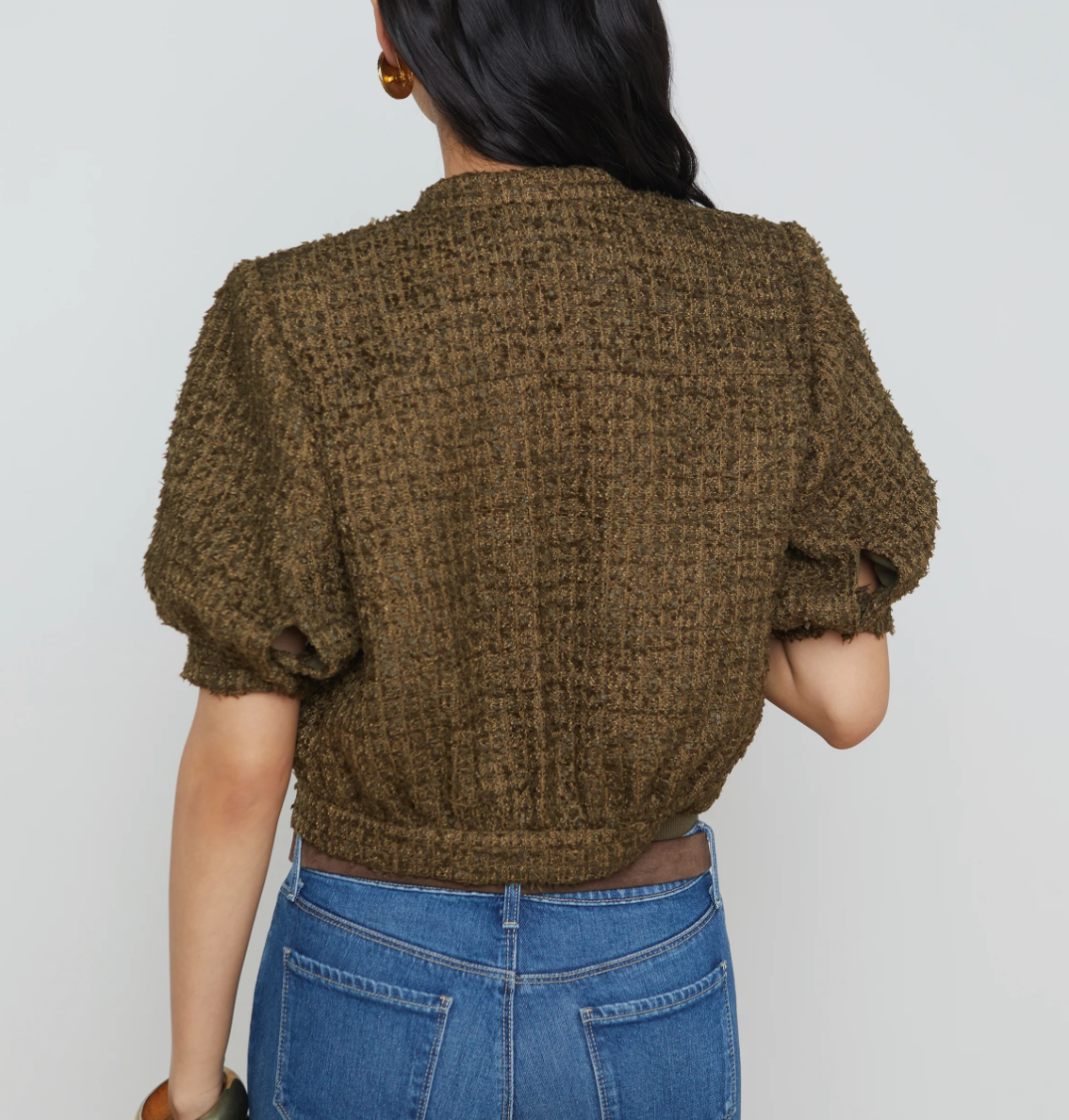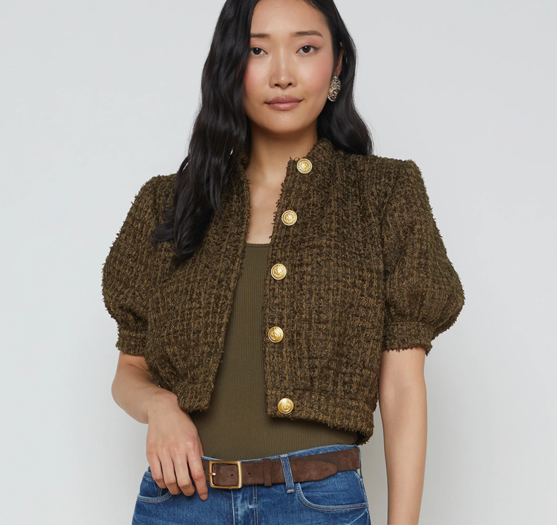 With an ultra-feminine cropped silhouette and puff sleeve, the cropped Cove does double duty as a chic jacket or top.