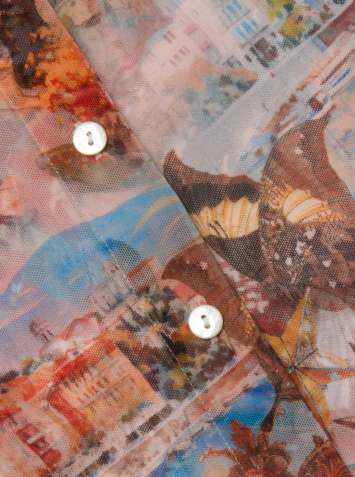 Sultry and sheer, the Indiana is a button-down shirt, featuring a travel postcard print. Layer it over a bodysuit for day and pair it with nude undergarments for night.