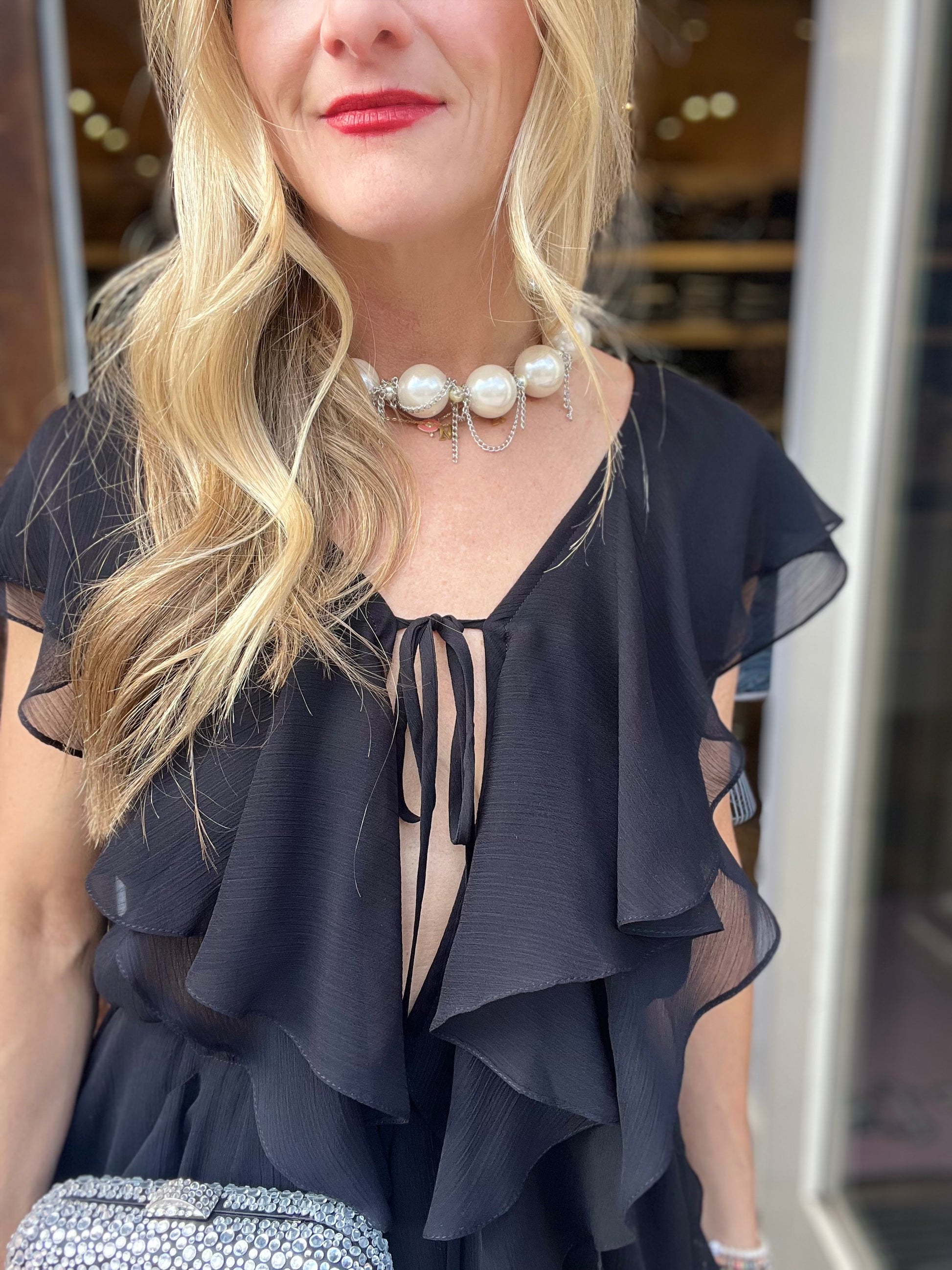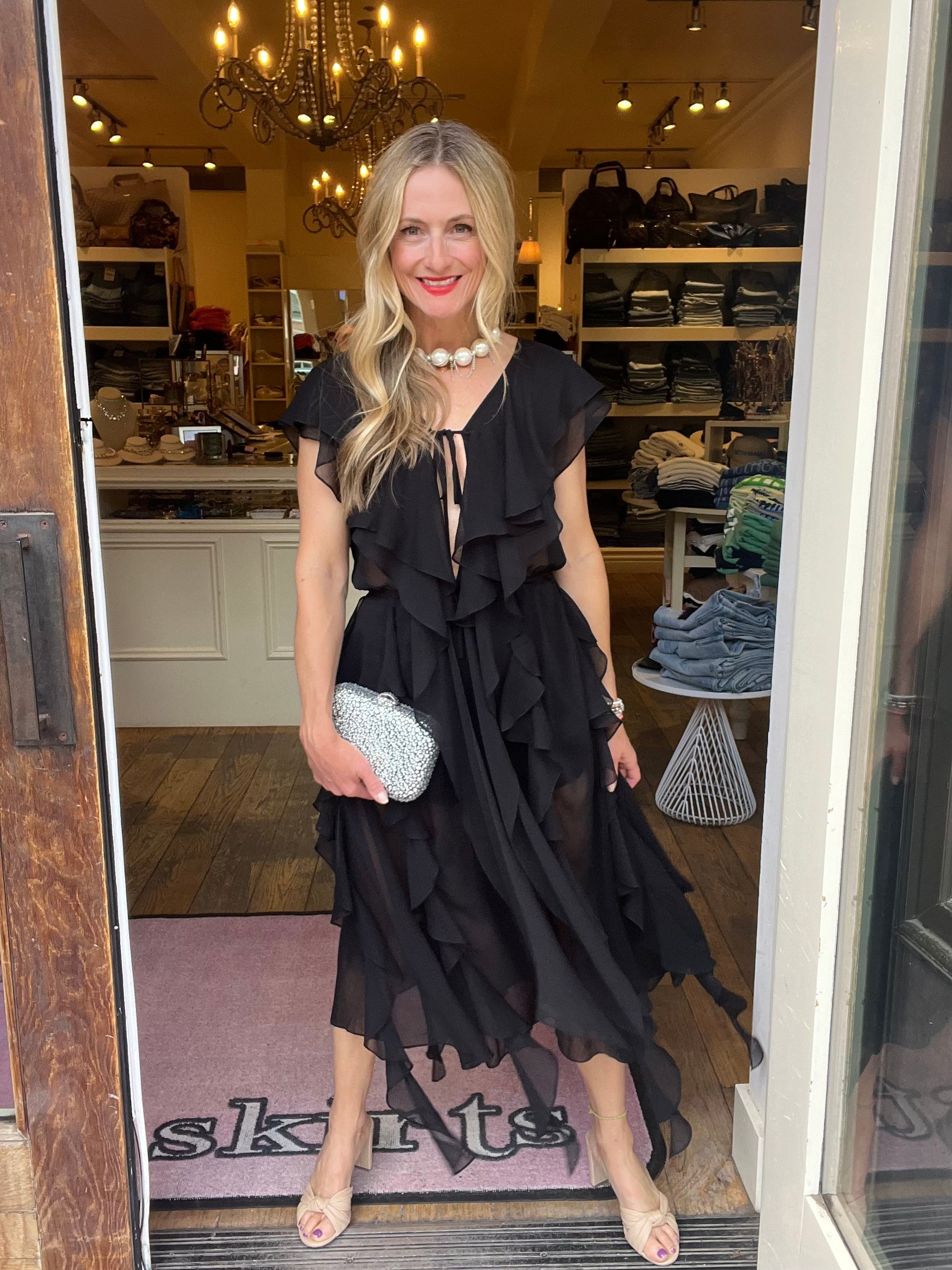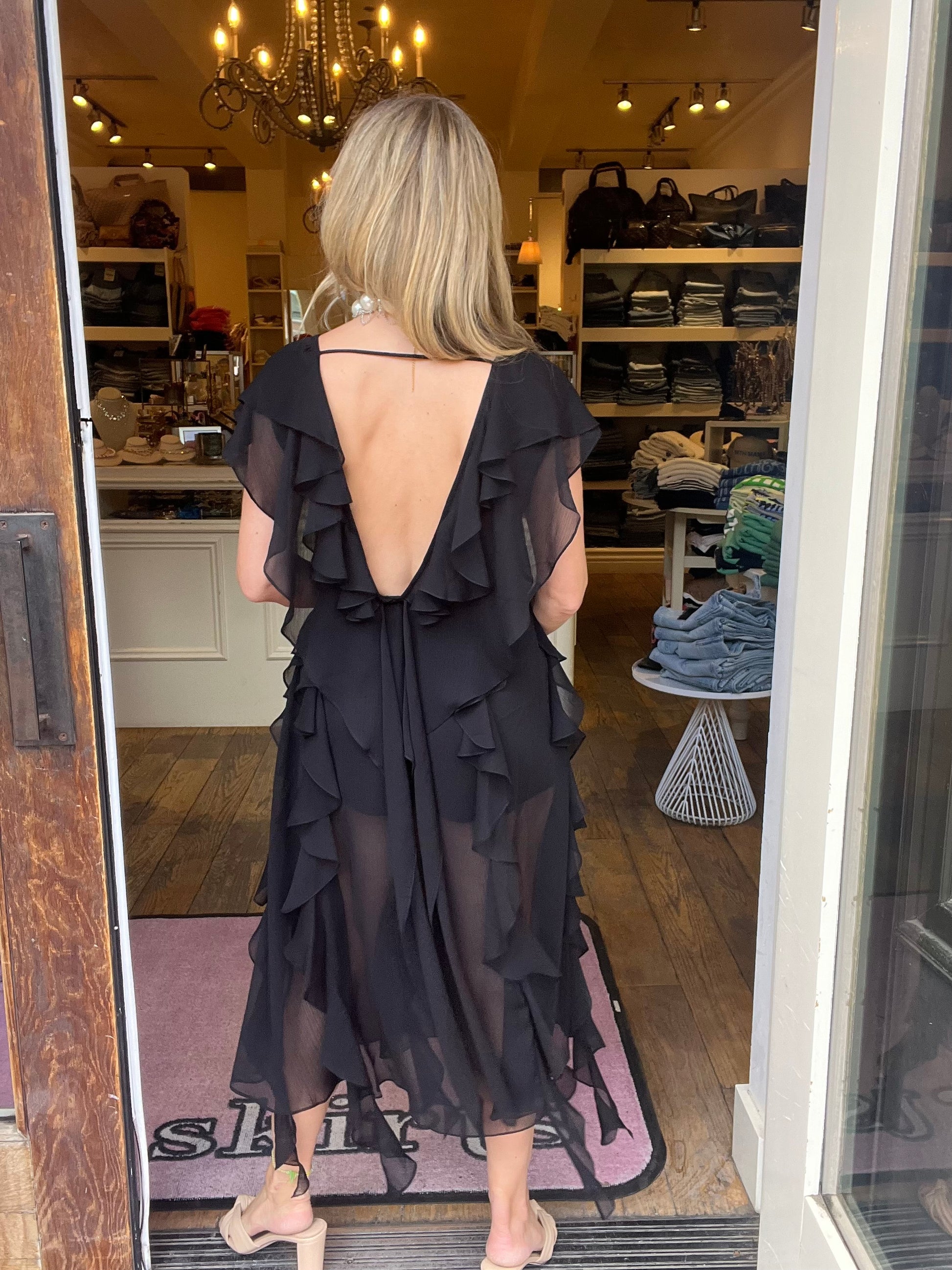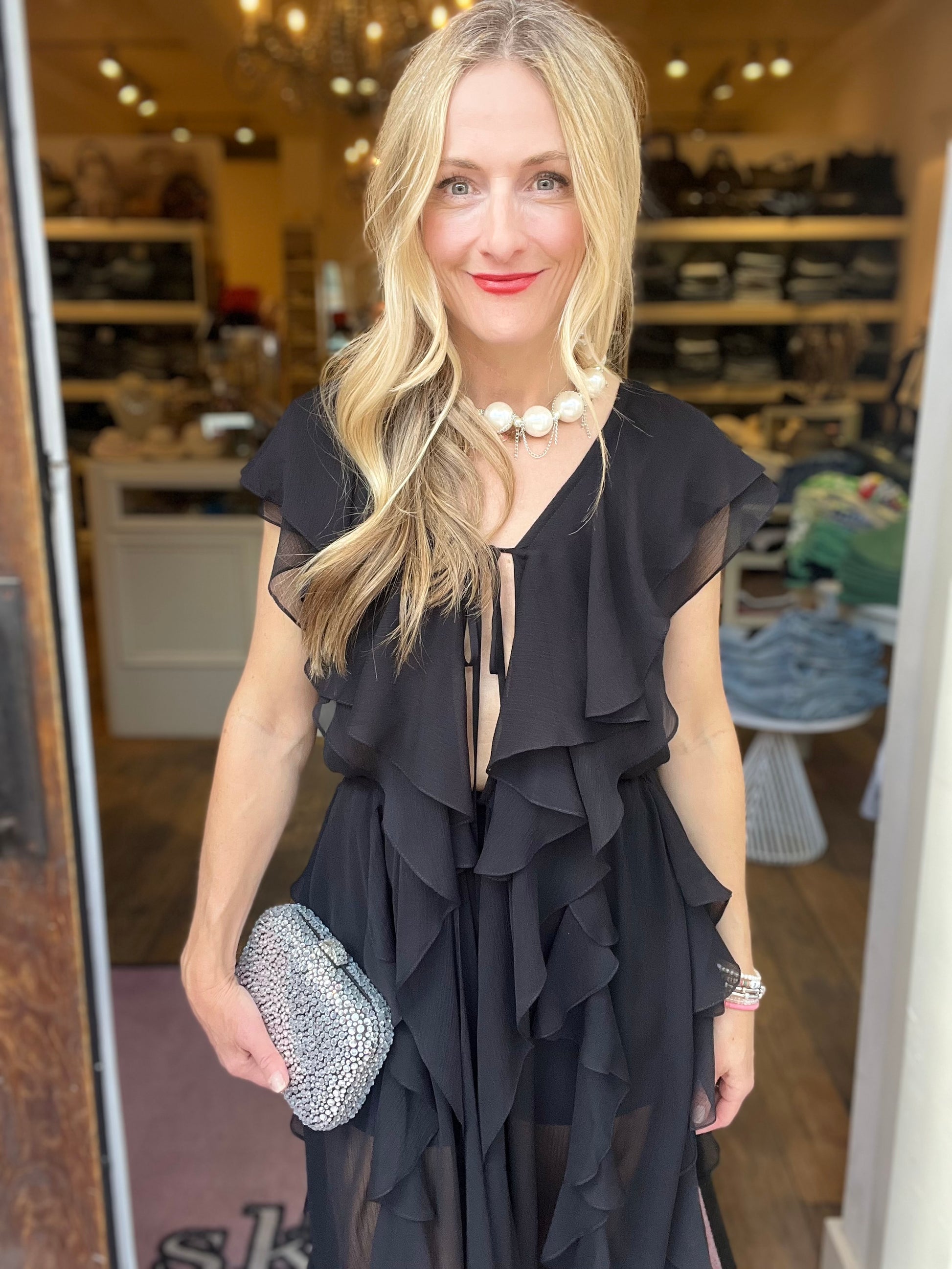 Lalo silk chiffon black gown with ruffles down the front and back. Ties in front and deep v in back. Comes with a black slip shorts.