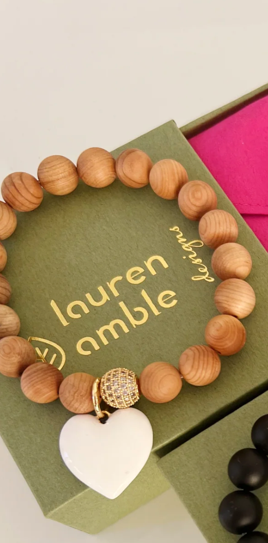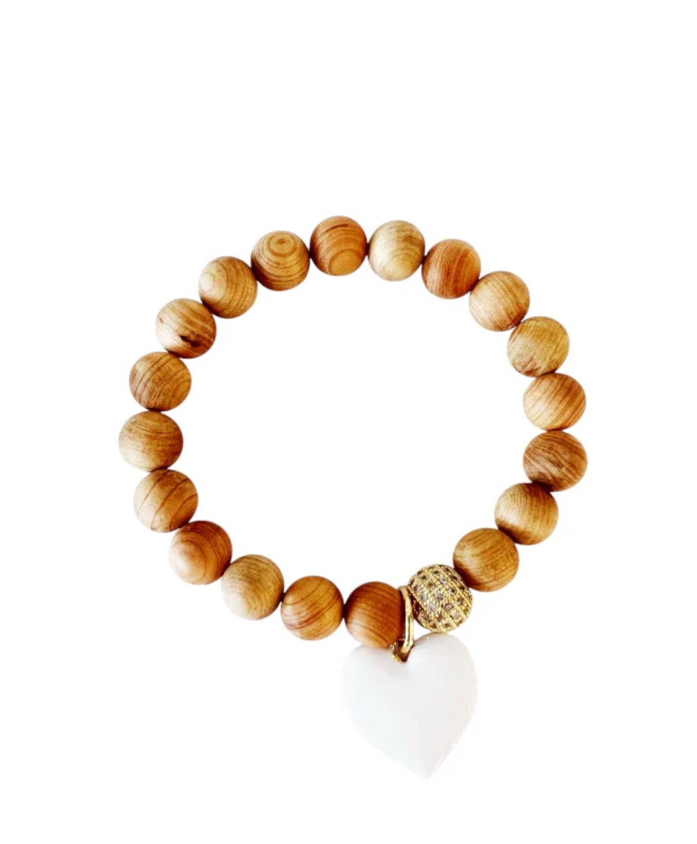 Warm woods paired with a little sparkle and a fresh clean white puff enamel heart.