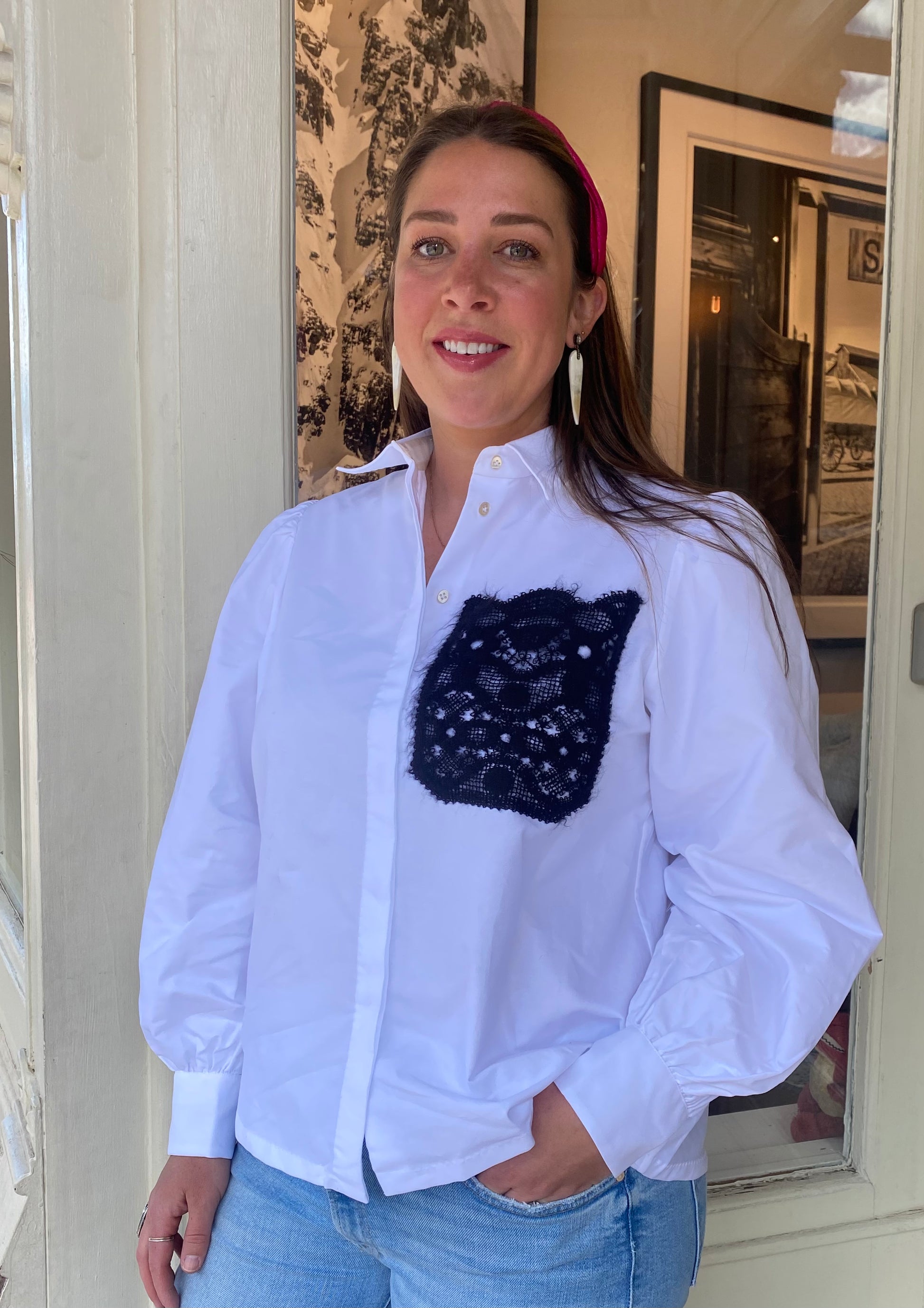 Le Sarte Pettegole white button down blouse with black lace textured pocket. Pearl buttons, puff long sleeve and oversized cuff. White stitched detail on collar. Runs big