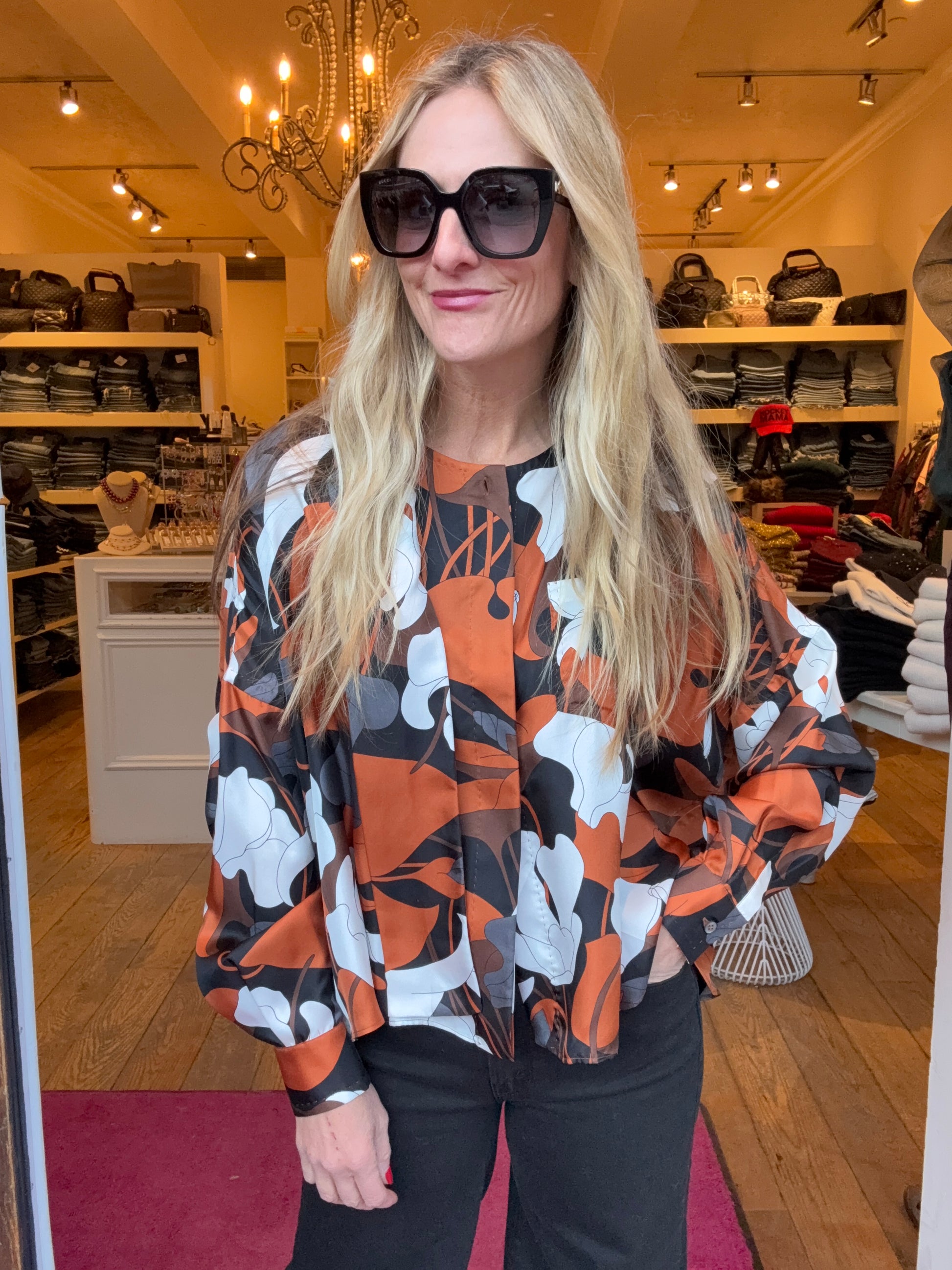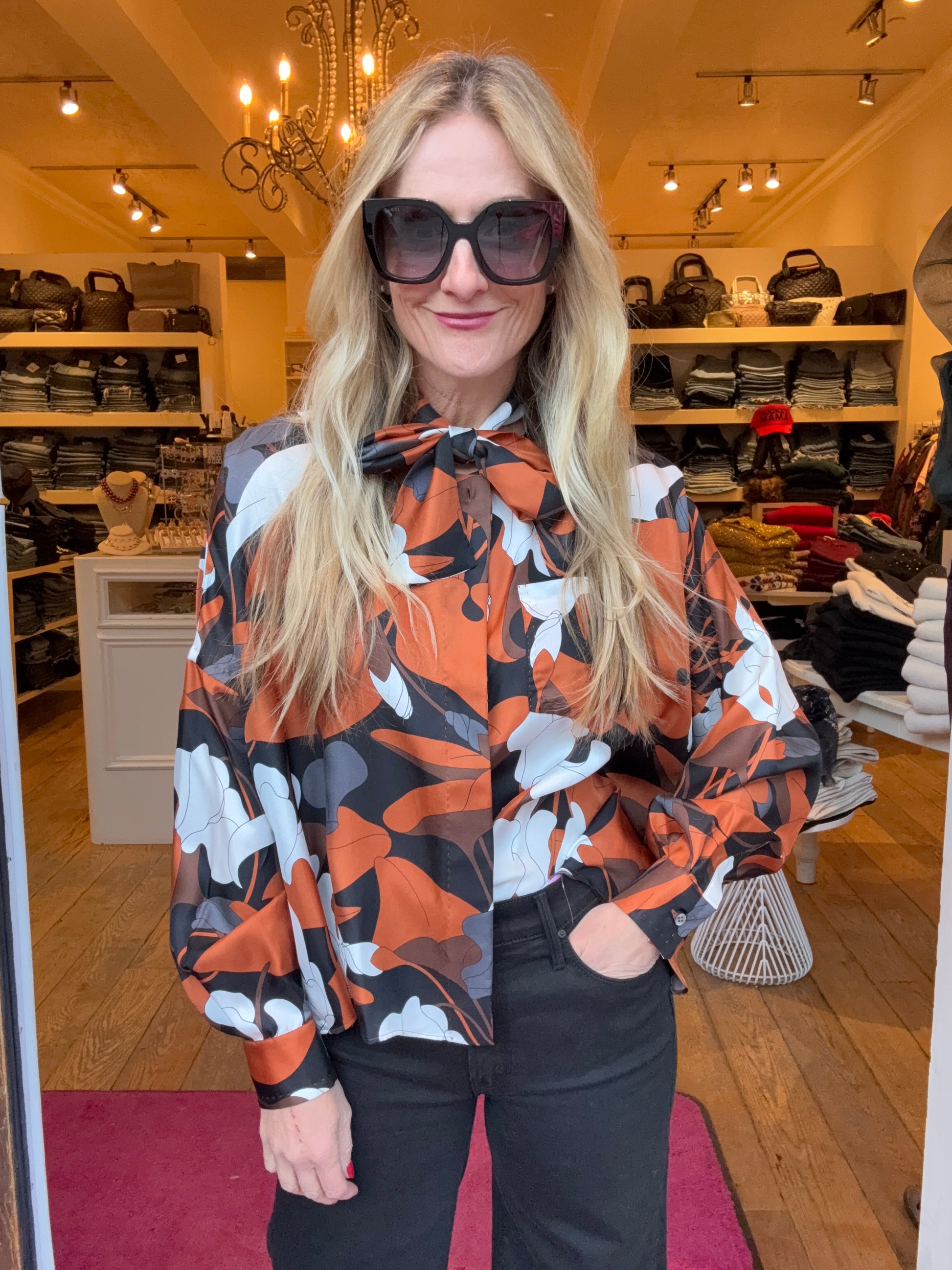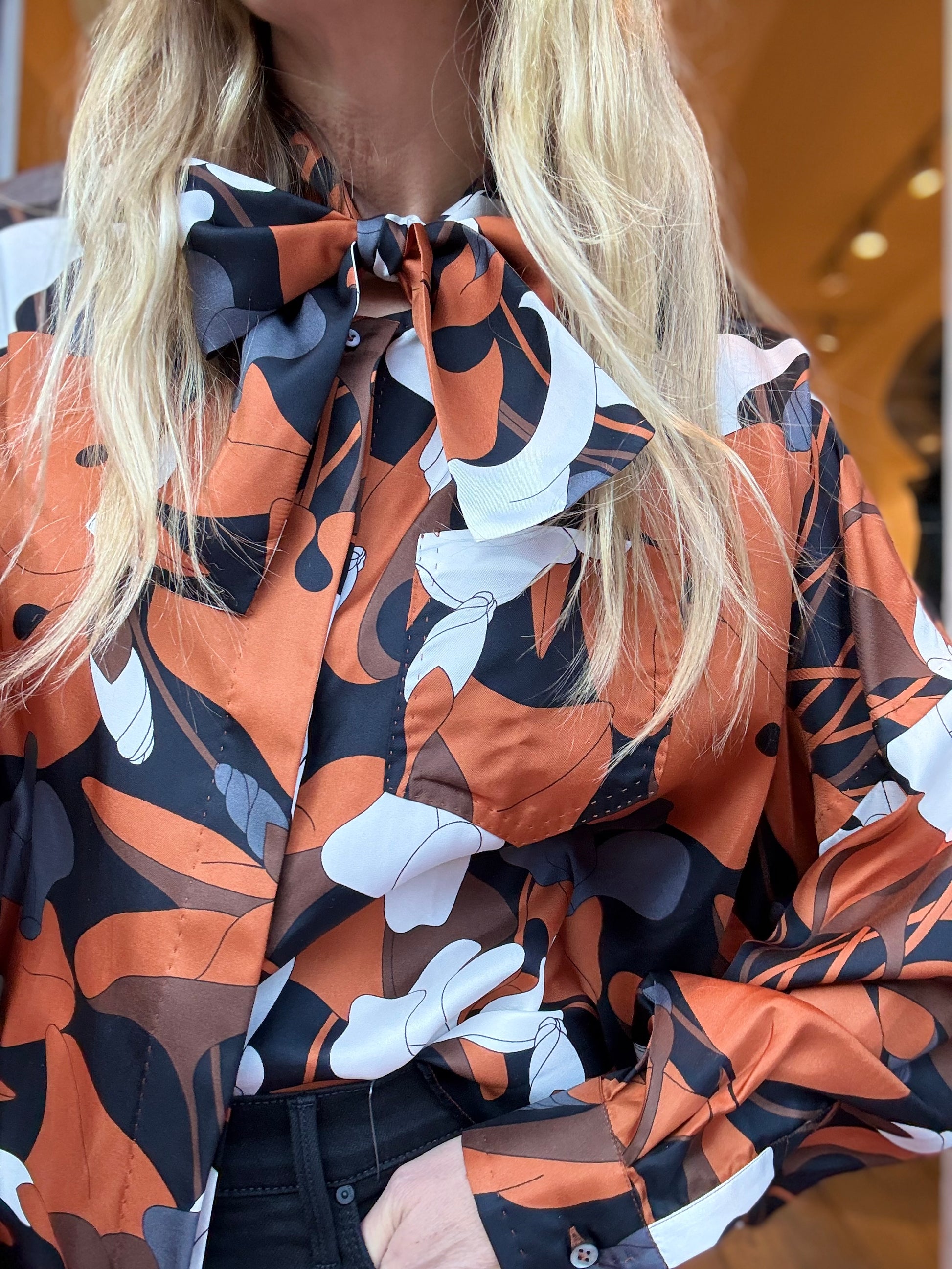 Button down, neck tie blouse, 100% silk. Wide cropped, oversized fit.