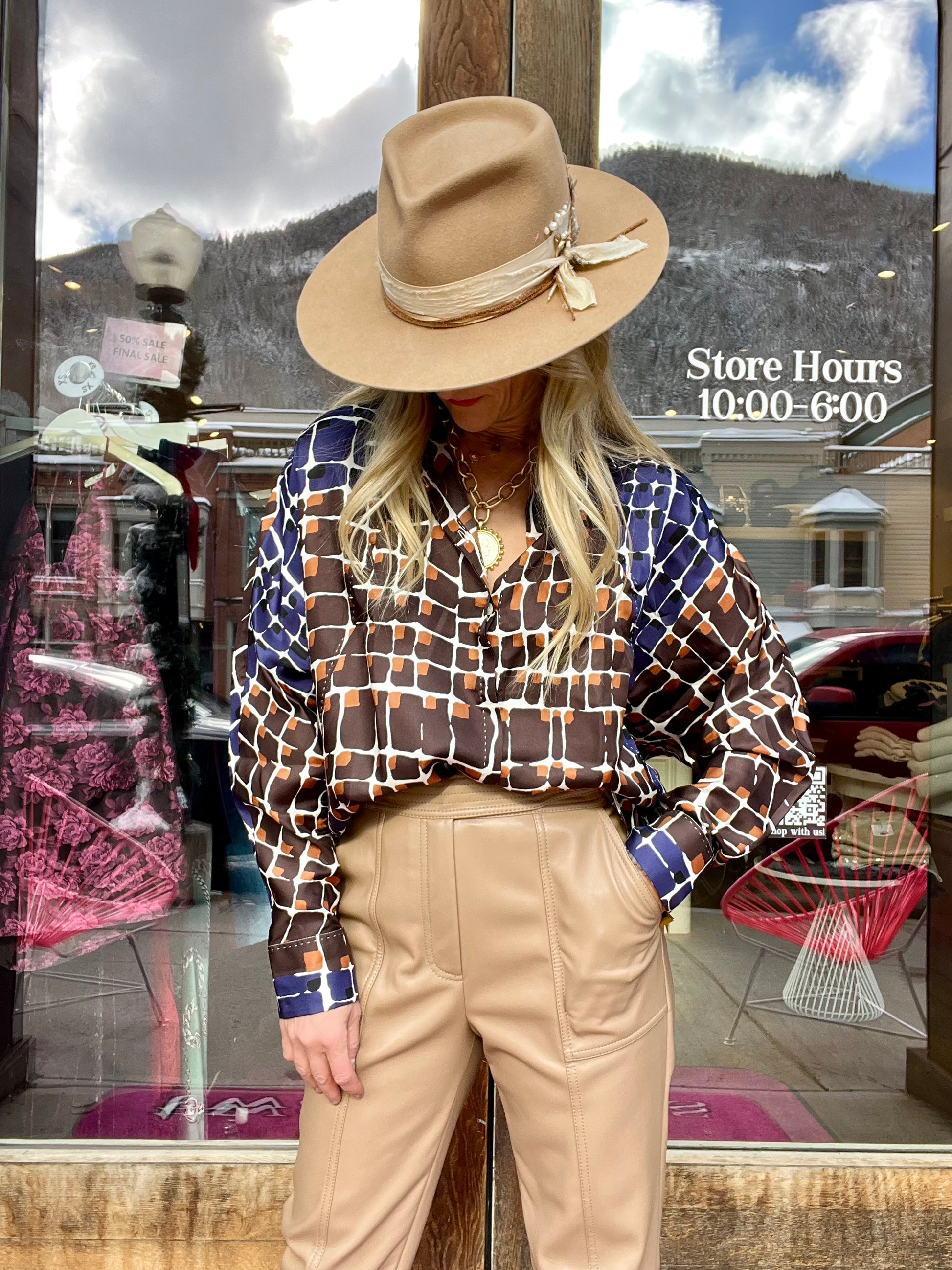 100% silk long sleeve, collared button down blouse in brown and blue print.