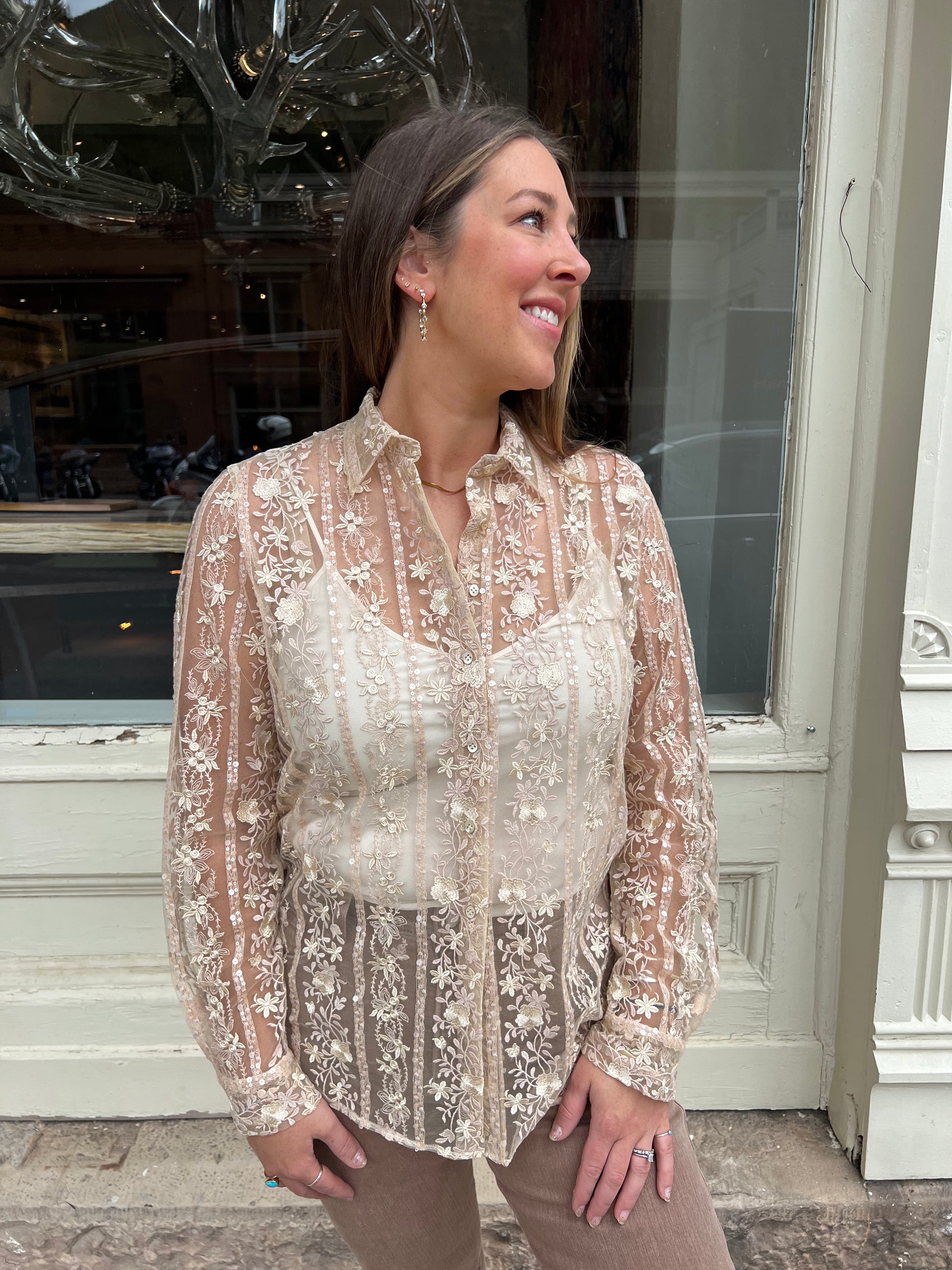 Cream sheer lace embellished with sequins, flower embroidery and attached slip. Button down blouse. By
