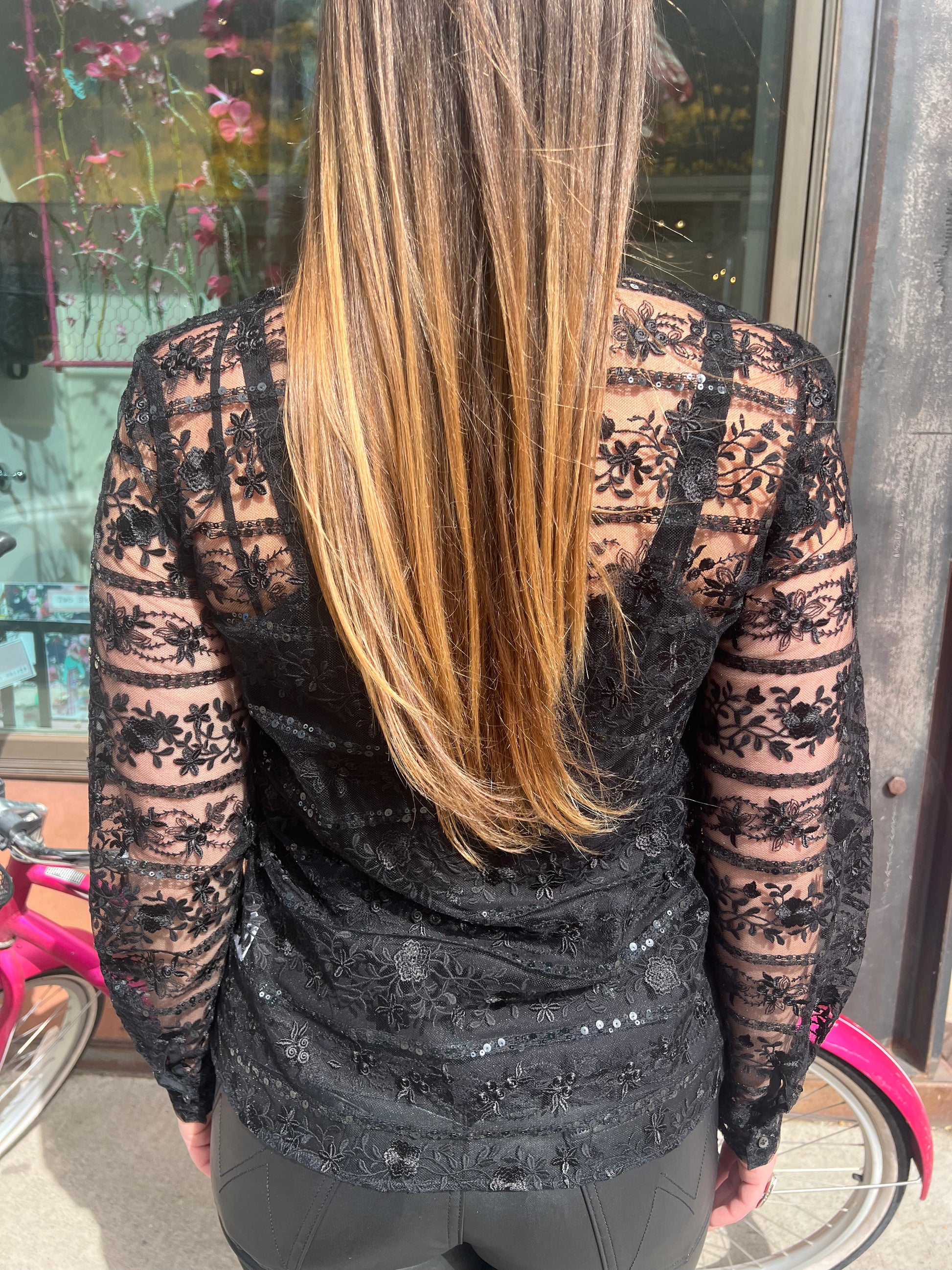 Black sequin and lace, buttoned long sleeve blouse, detached black silk slip, key hole opening in back.