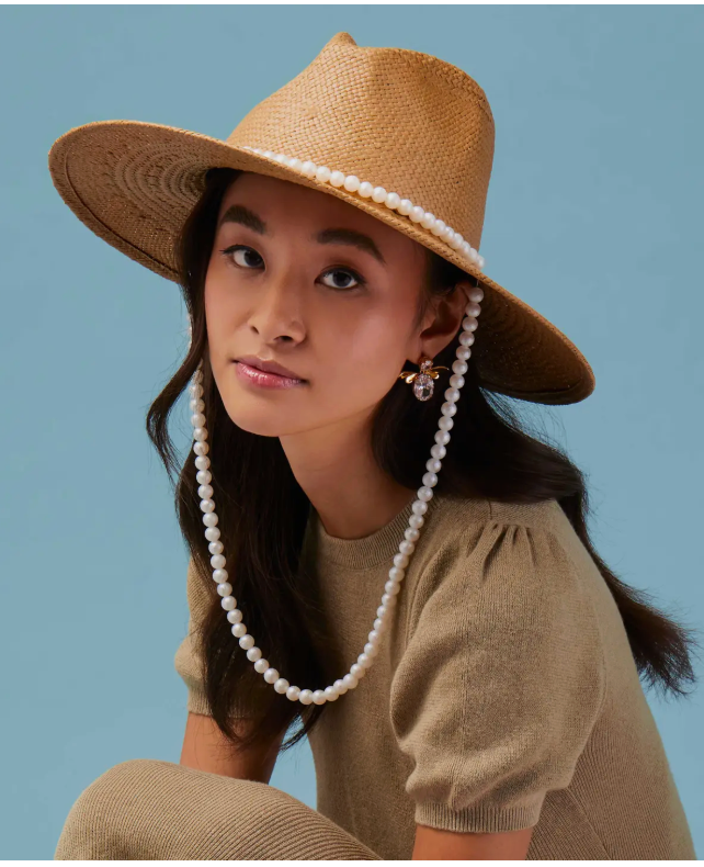 Our western inspired wide brim, straw hat. ∙ Natural straw ∙ Faux pearl cord to drape over the shoulder ∙ Crown height 5" ∙ Hat brim 4.5" ∙ 22" circumference ∙ Trademark logo charm
