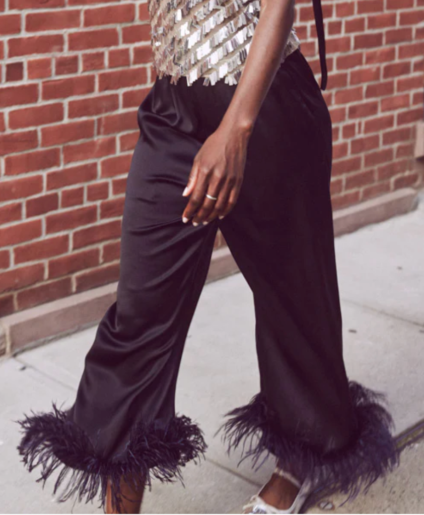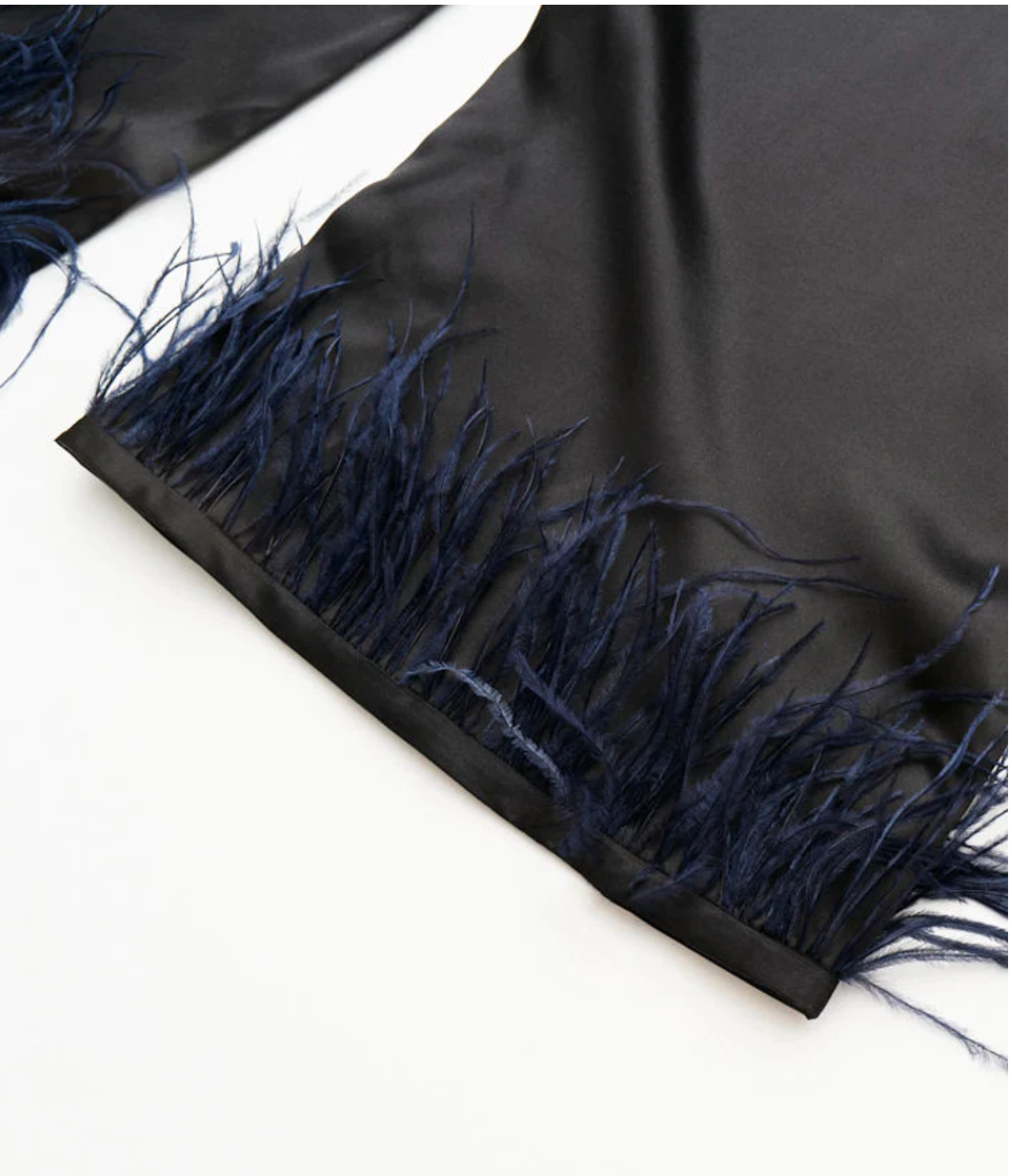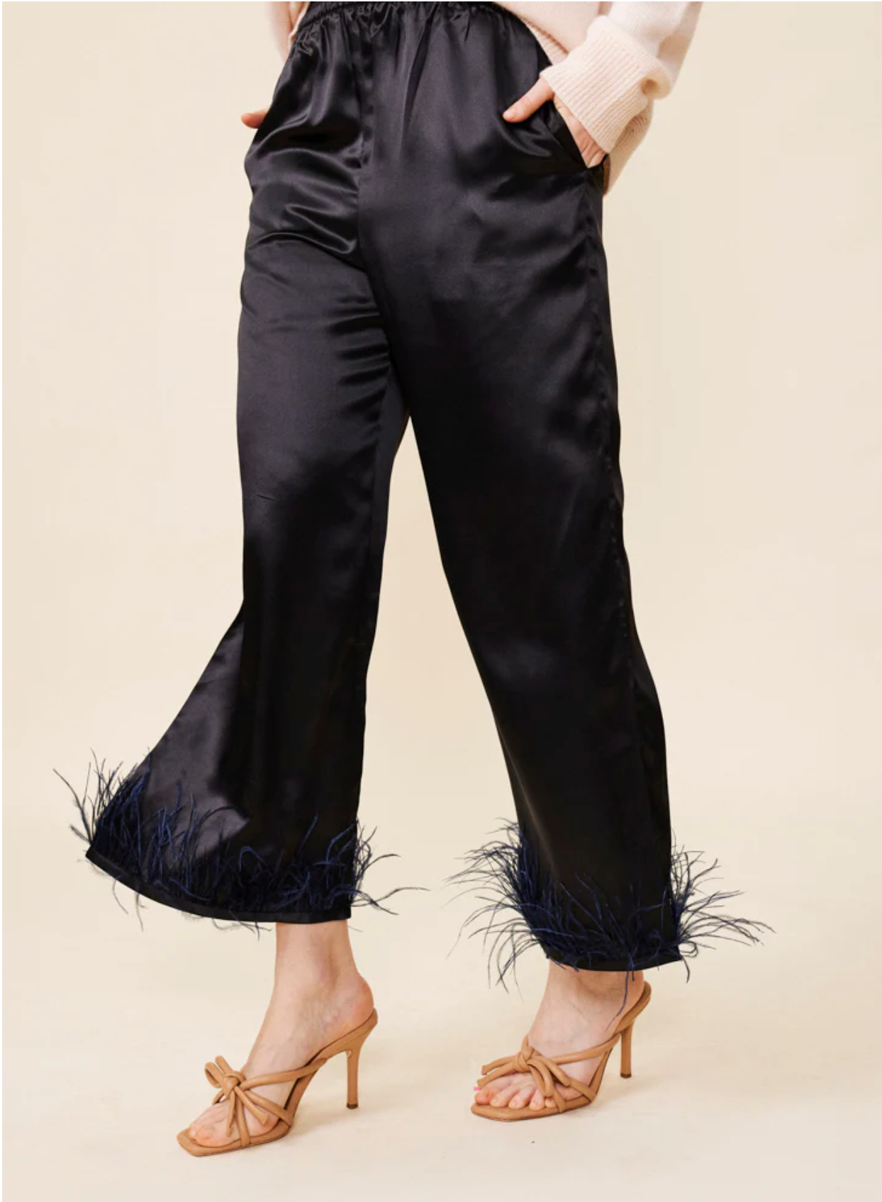 Named after our beloved neighboring street in the West Village, our silk charmeuse lounge pant features an elastic waistband and drawcord and ostrich feather trim at hem.