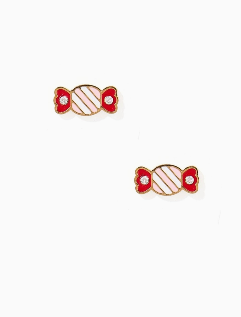 Taffy hard candy design with pink and white enamel stripes and two CZ stones * 10mm size * Secure screwback design for comfort and all-day wear * Comfortable enough to nap in * Waterproof, durable, and perfect for active wear * This product has been tested by QIMA Testing Limited and passed ASTM F2923-20, the Standard Specification for Consumer Product Safety for Children's Jewelry. This certification confirms that these pieces are nickel-safe, corrosion-resistant, and hypoallergenic