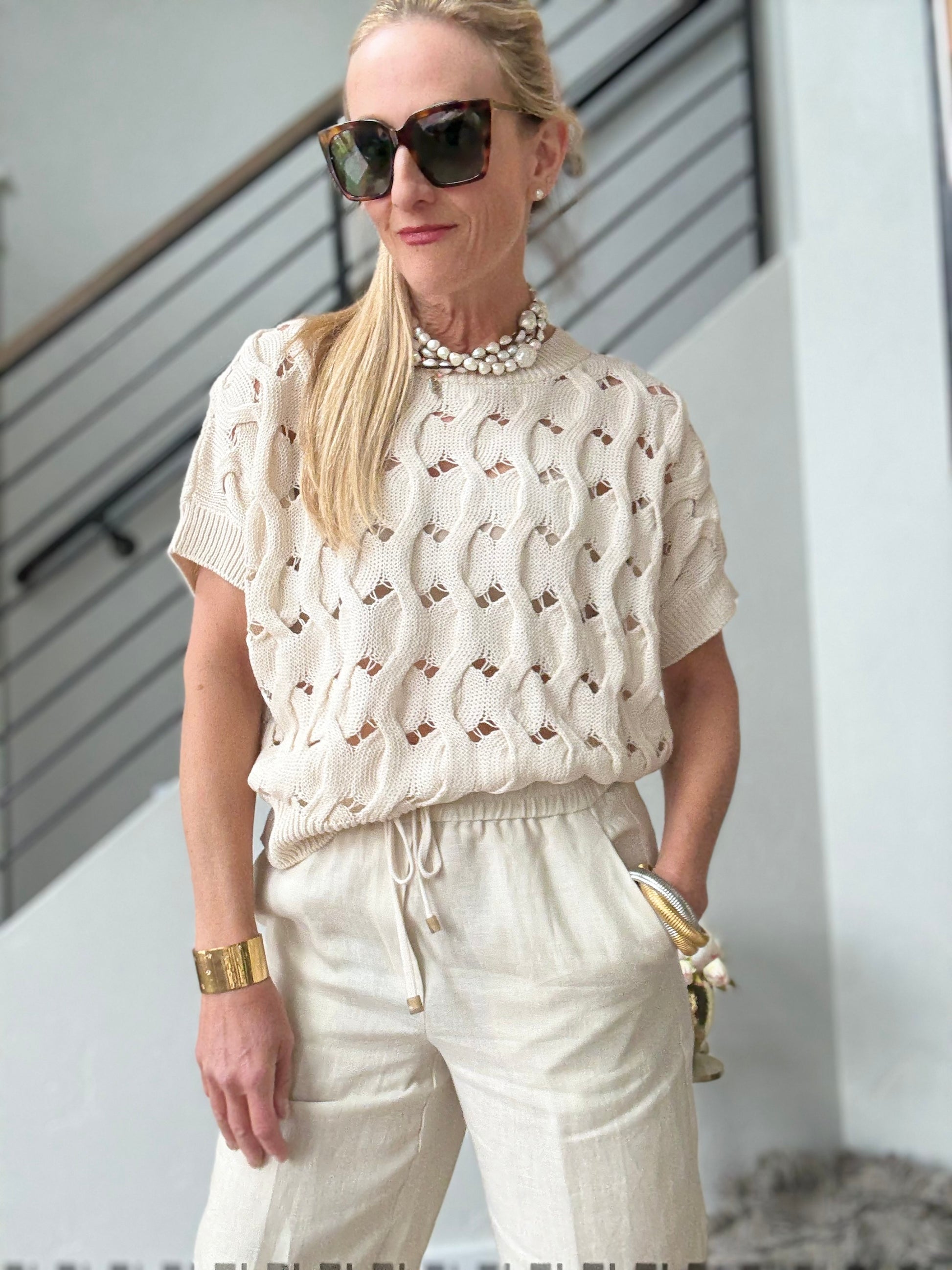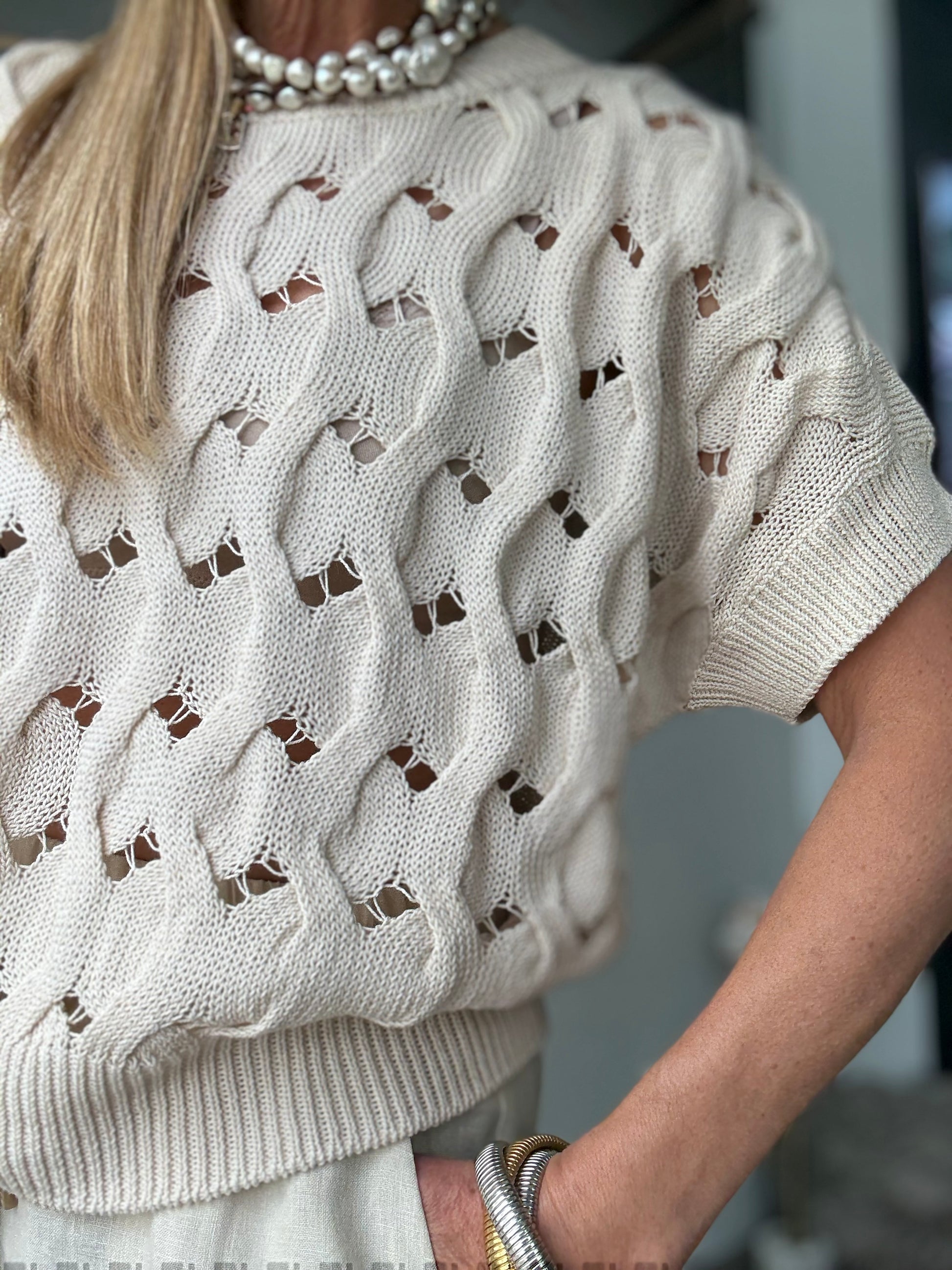 Short sleeve cotton cable crew neck. Ribbed at neck, waist and arms, open knit. Fits true to size. Model in size small.