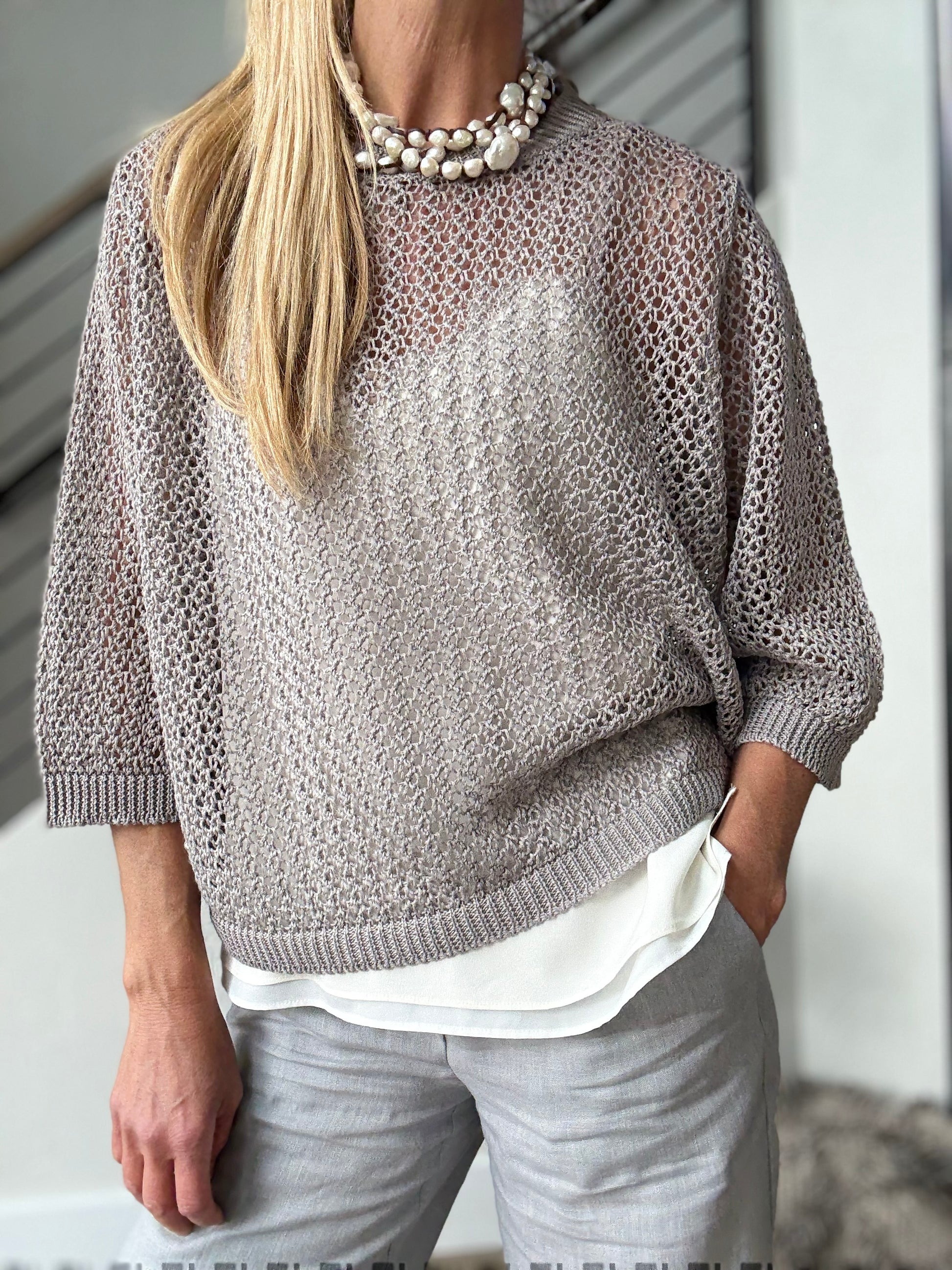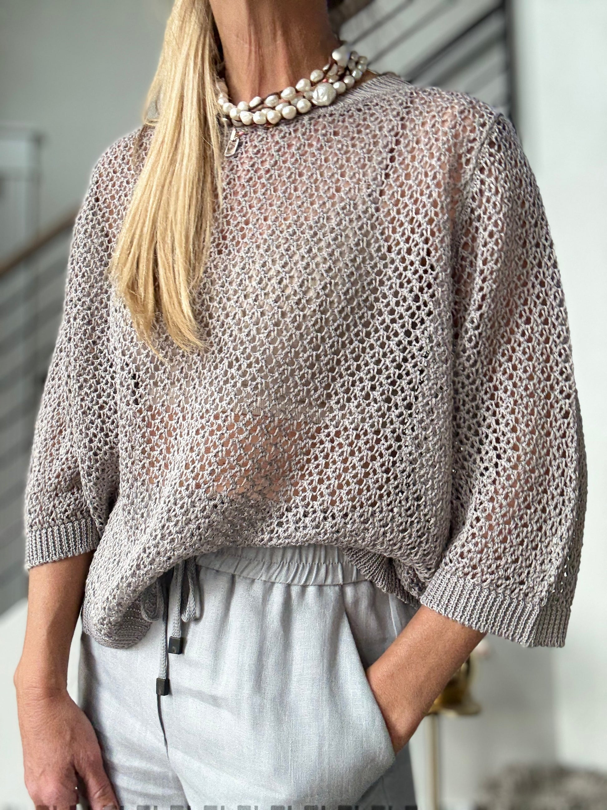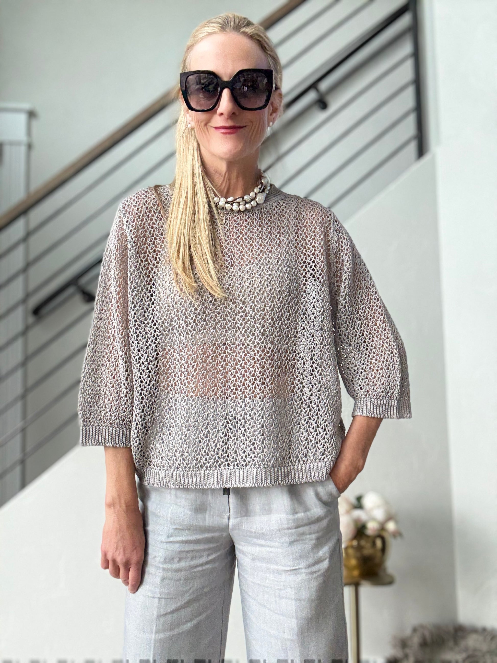 Grey and metallic open mesh top with ribbed neck, arm and waist. Elbow sleeve length. Fits oversized. Model in size small.